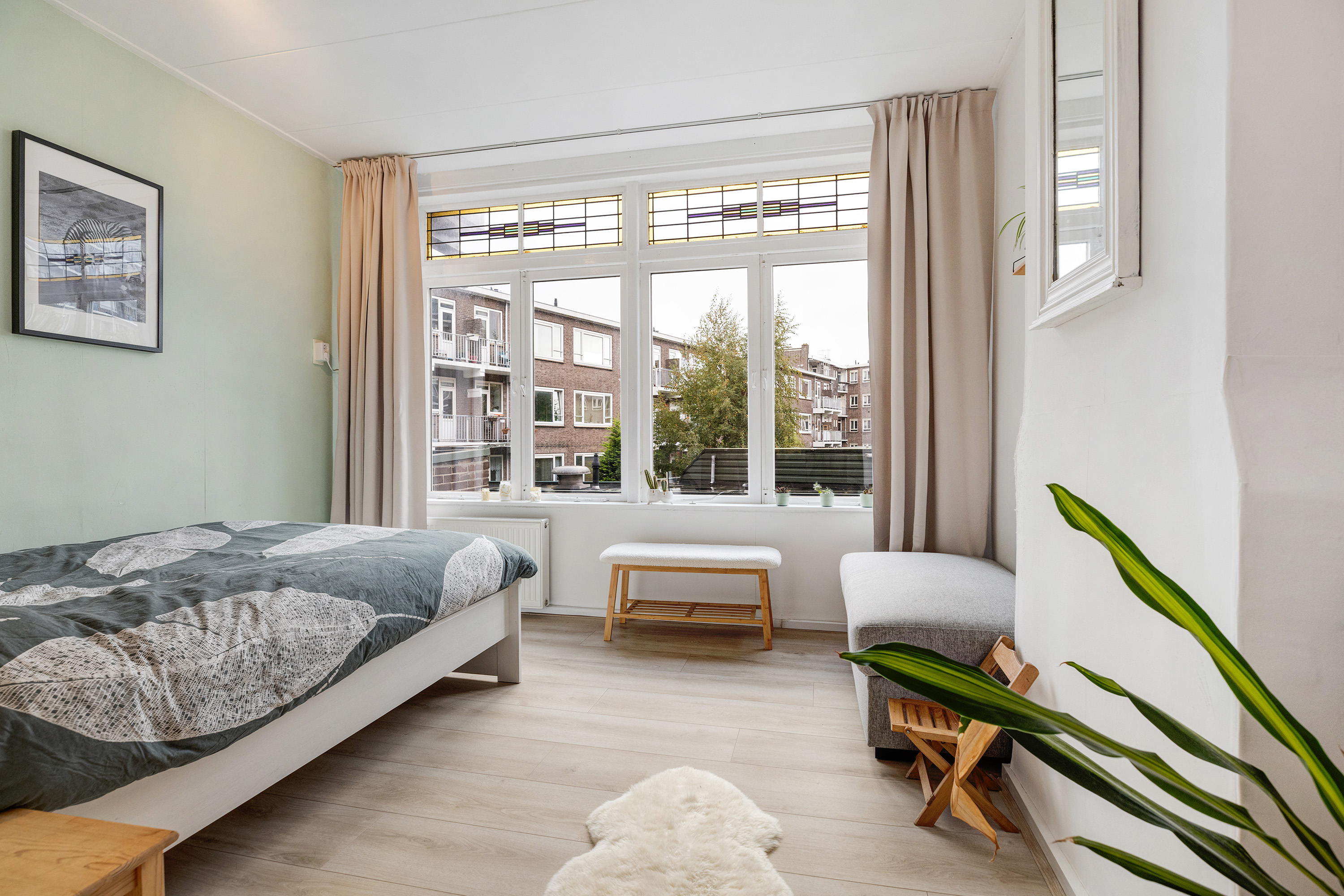 Ruime slaapkamer met authentieke glas in lood ramen aan de achterzijde