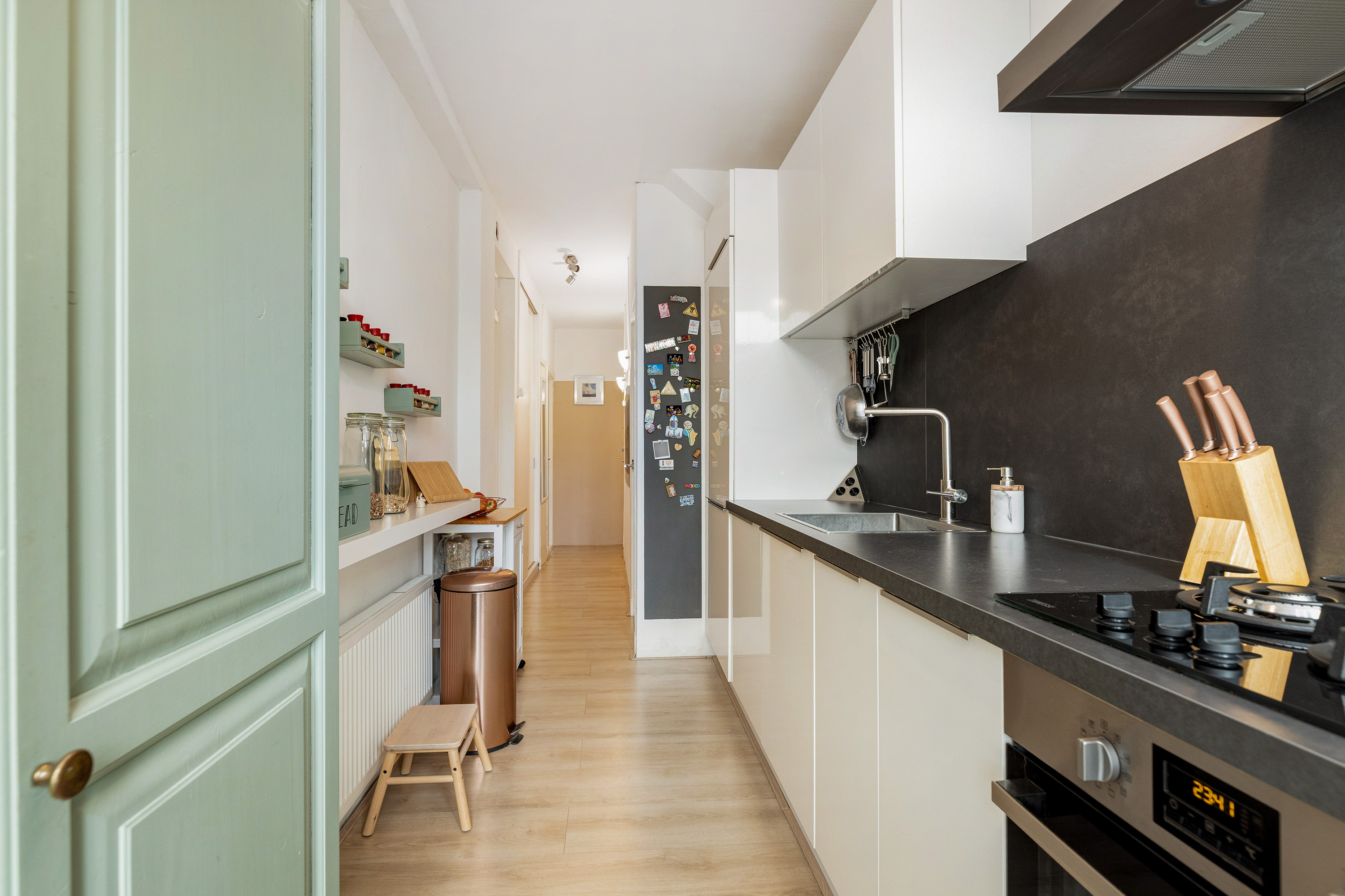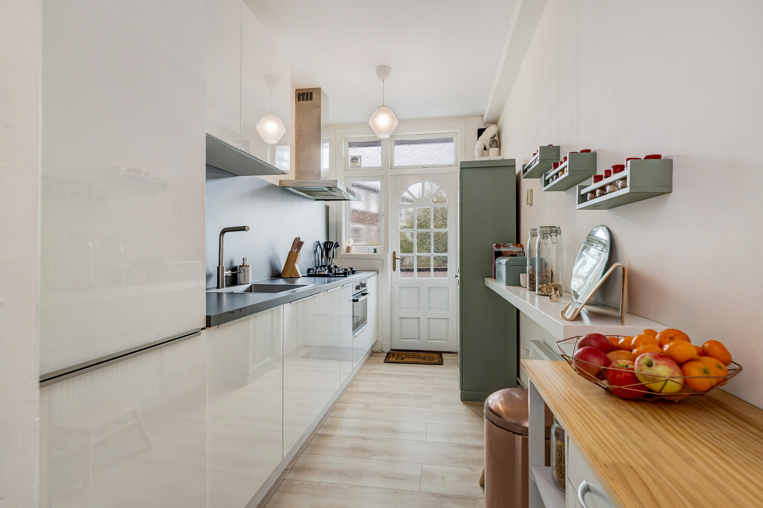 Ruime keuken met deur naar balkon en moderne installatie met inbouwapparatuur, te weten: vaatwasser, koelkast, vriezer, 5-pits gaskookplaat, afzuigkap en combioven