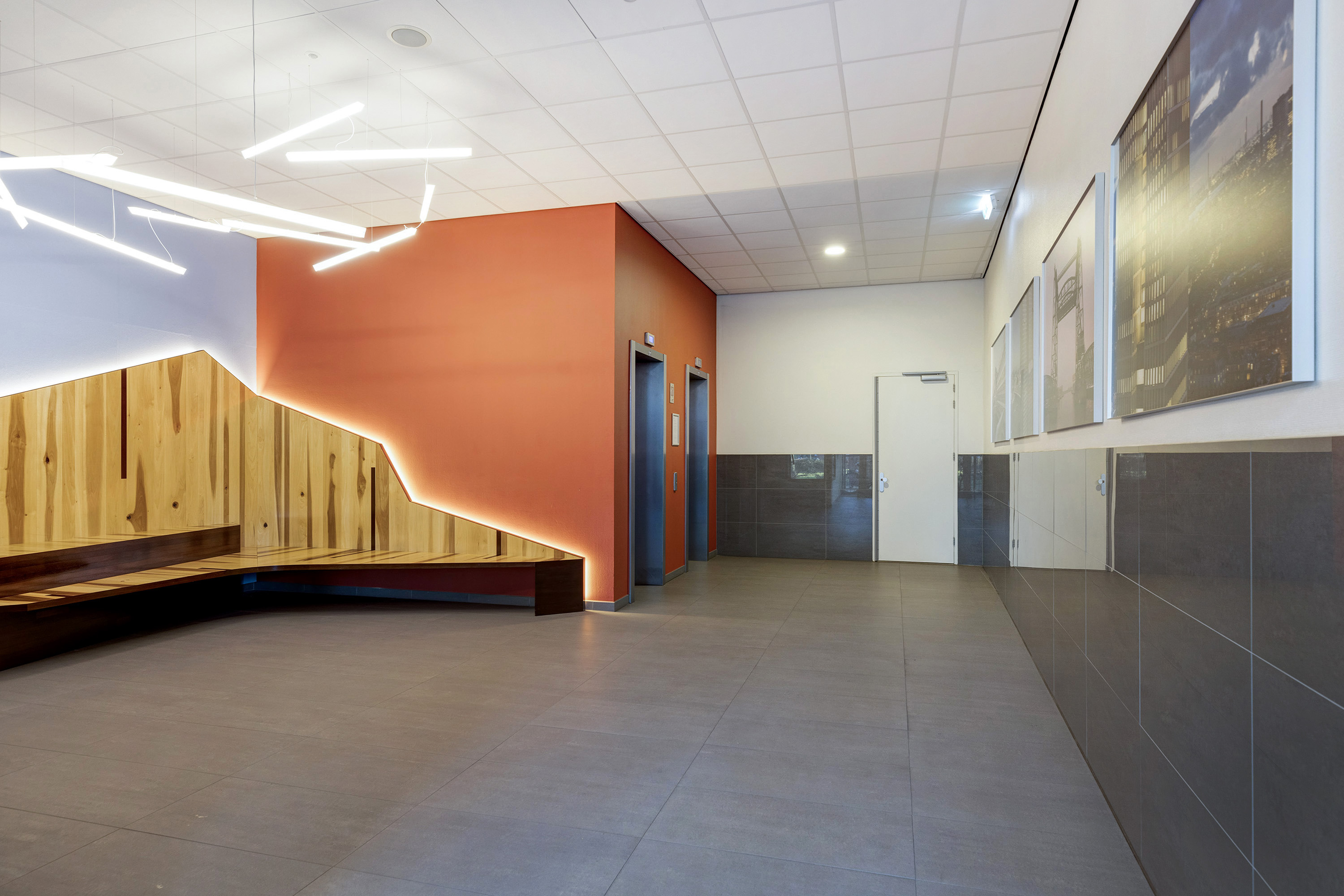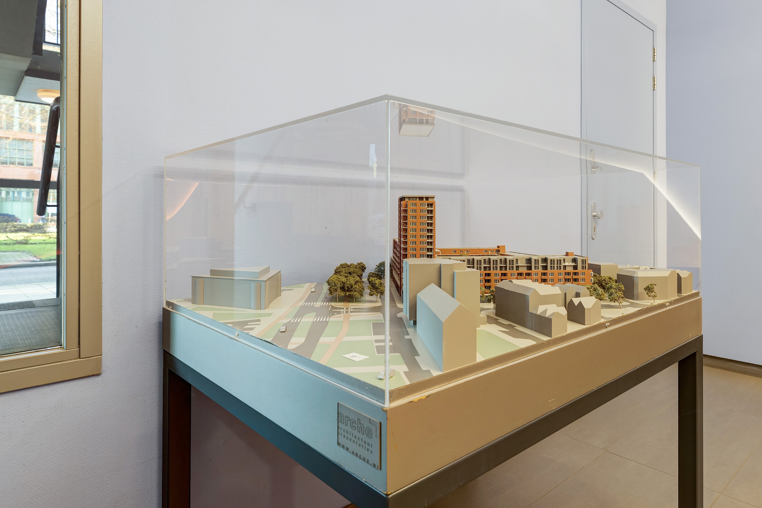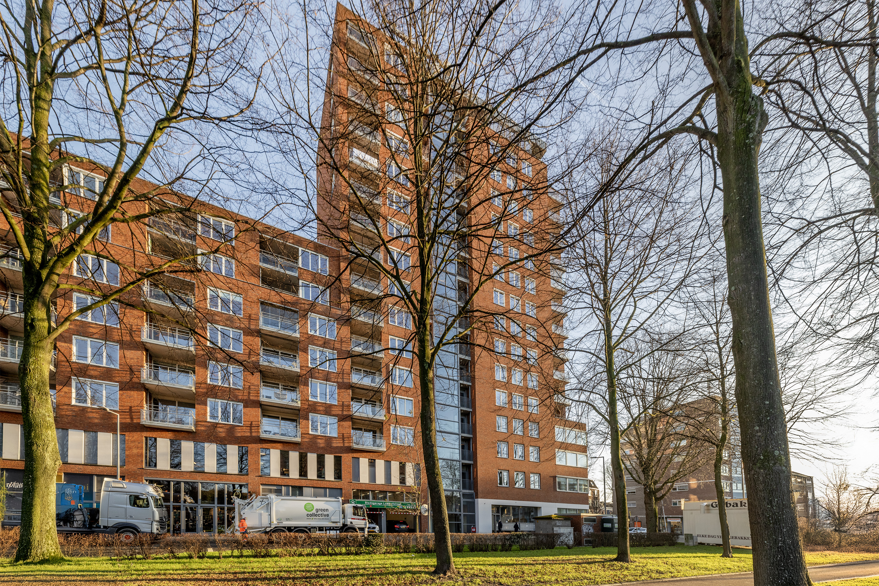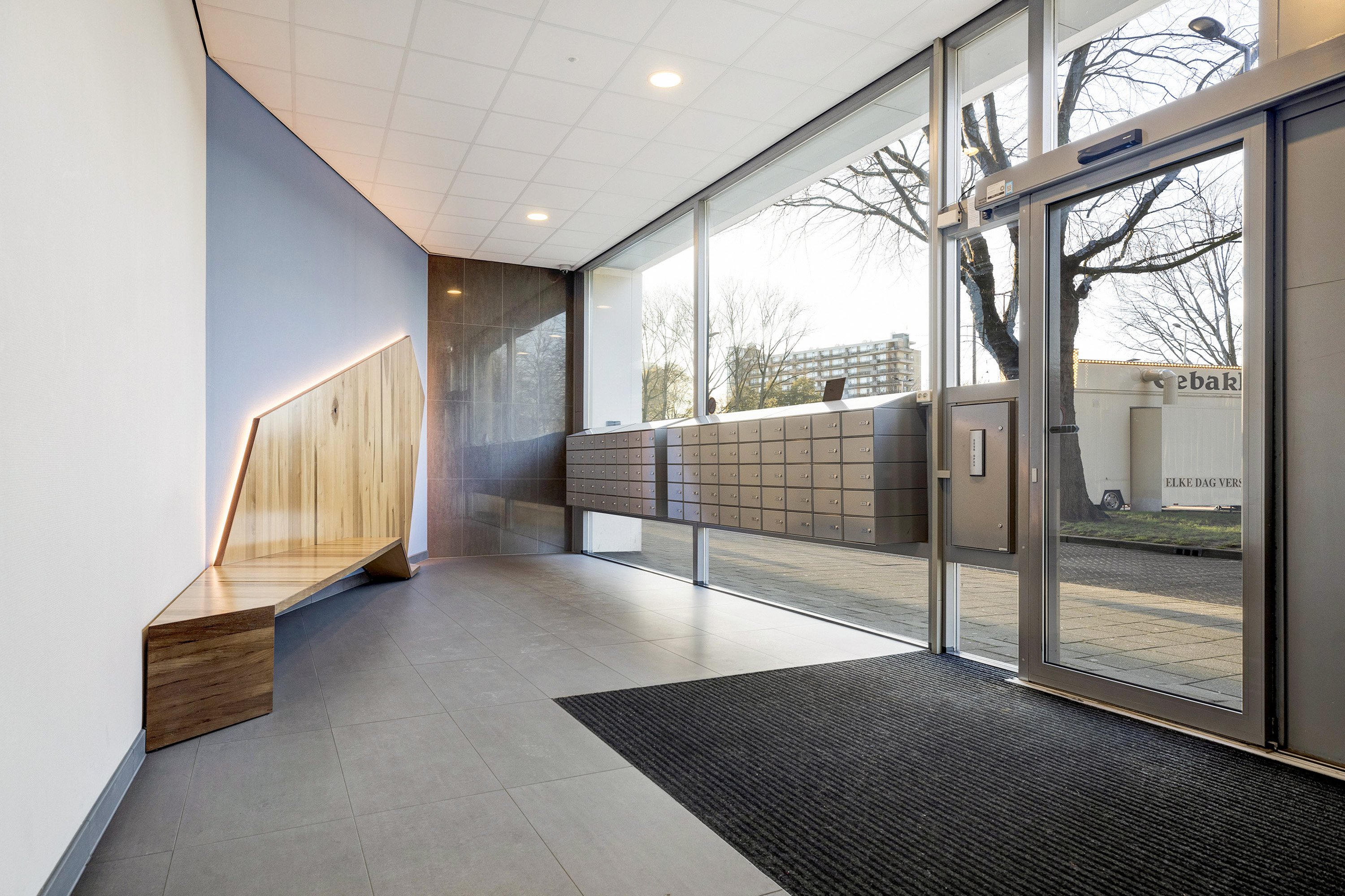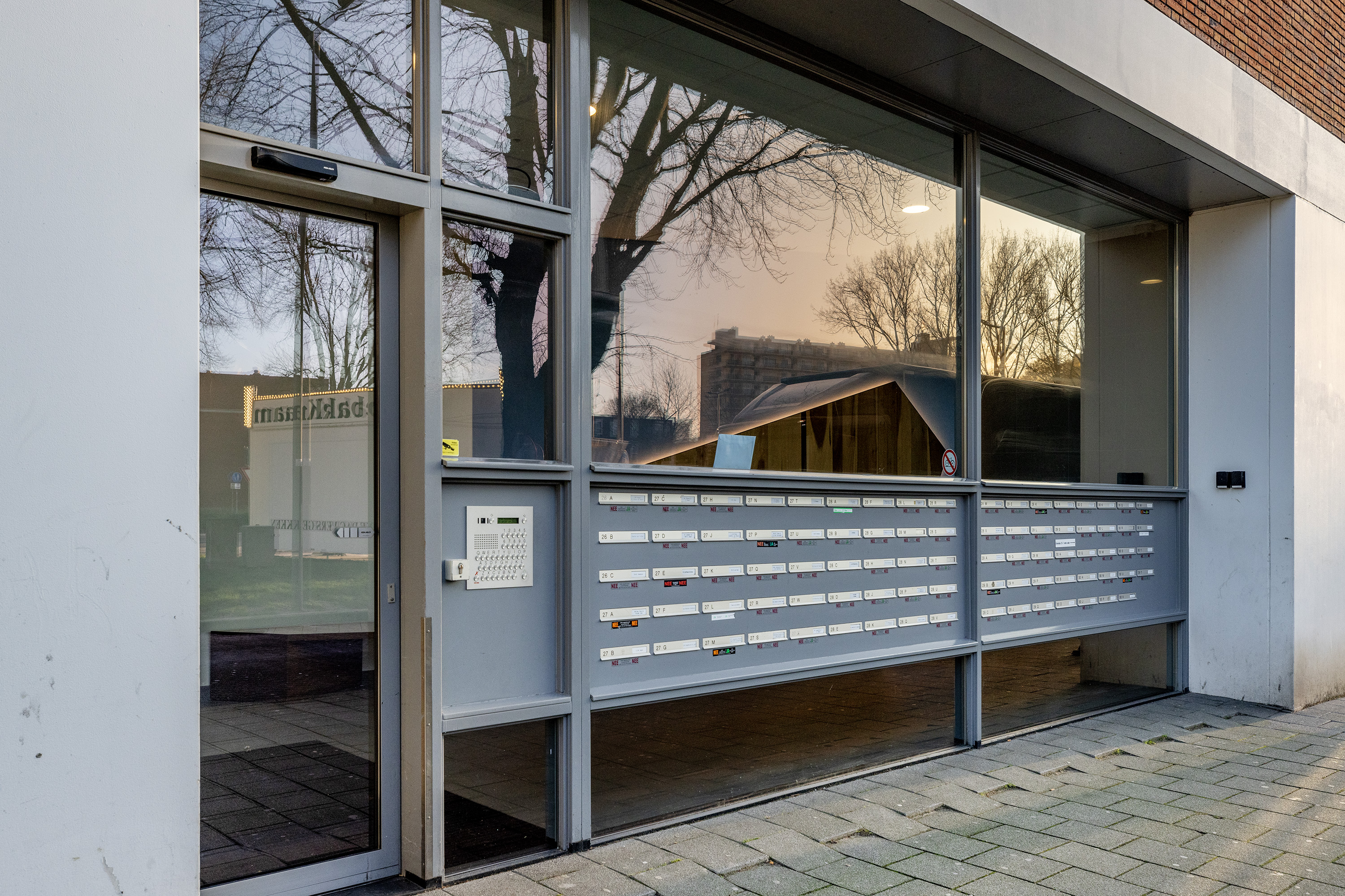 Een afgesloten hoofdentree met videophonesysteem en brievenbussen. Een trappenhuis en liften bieden toegang tot de verdiepingen.