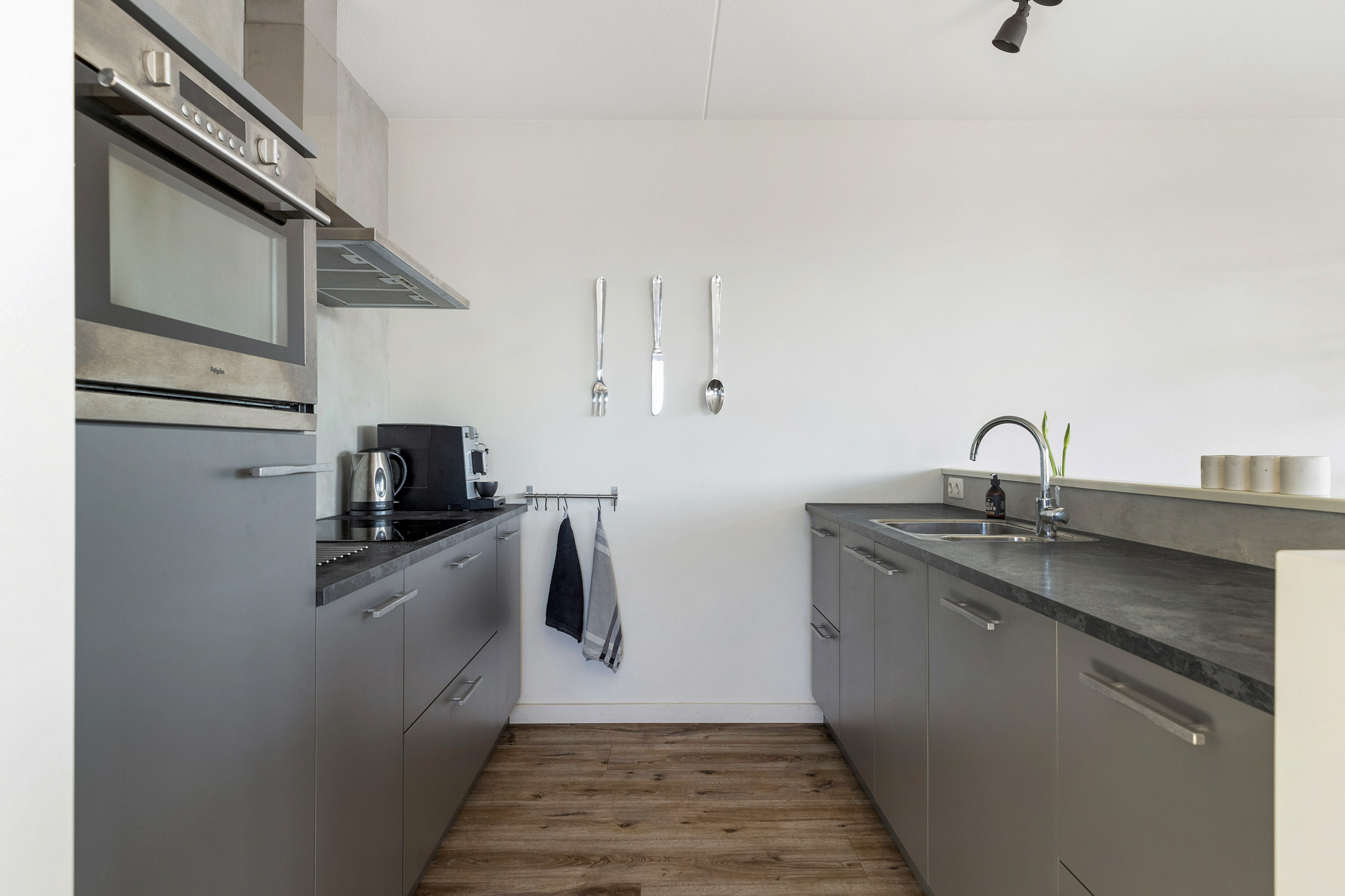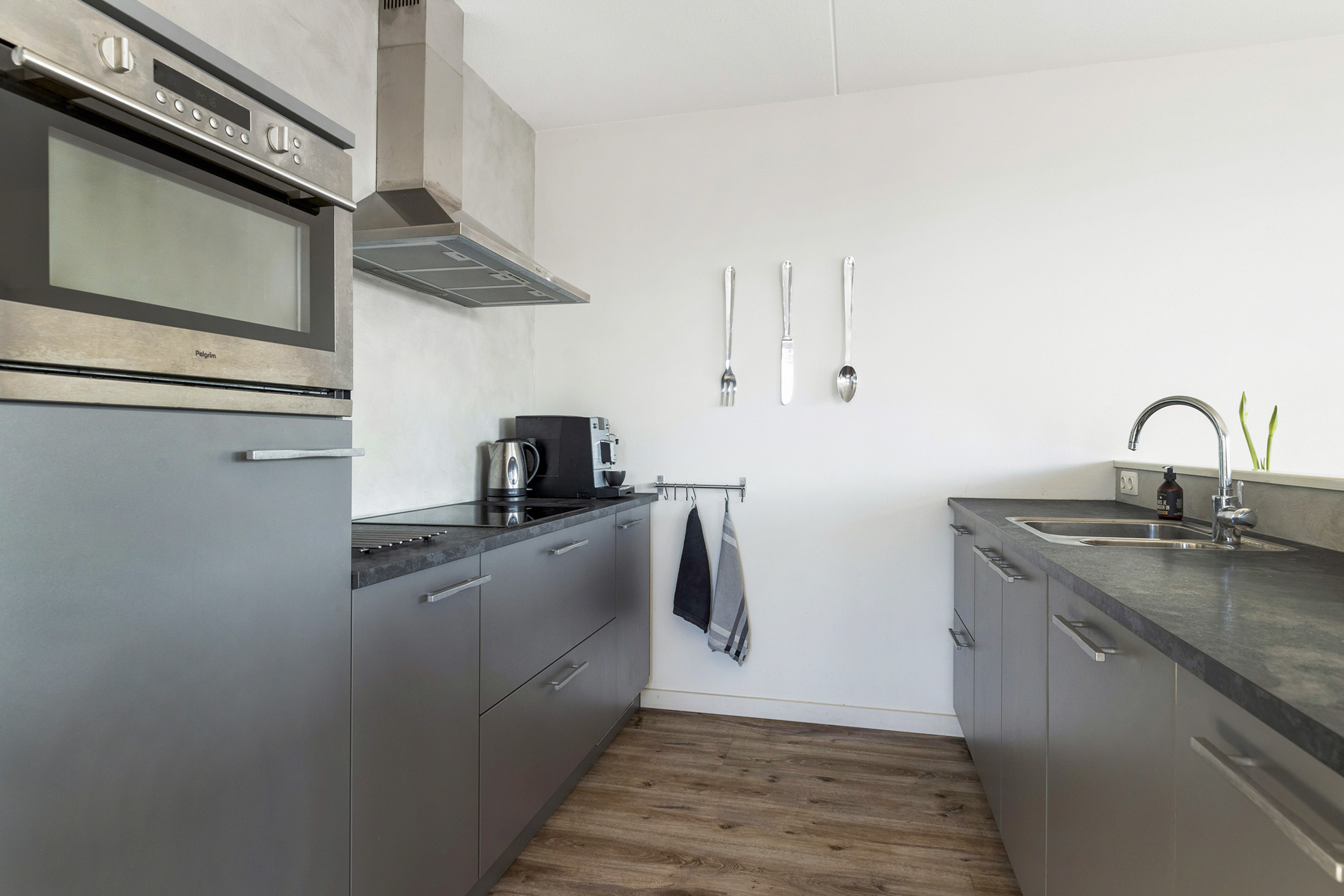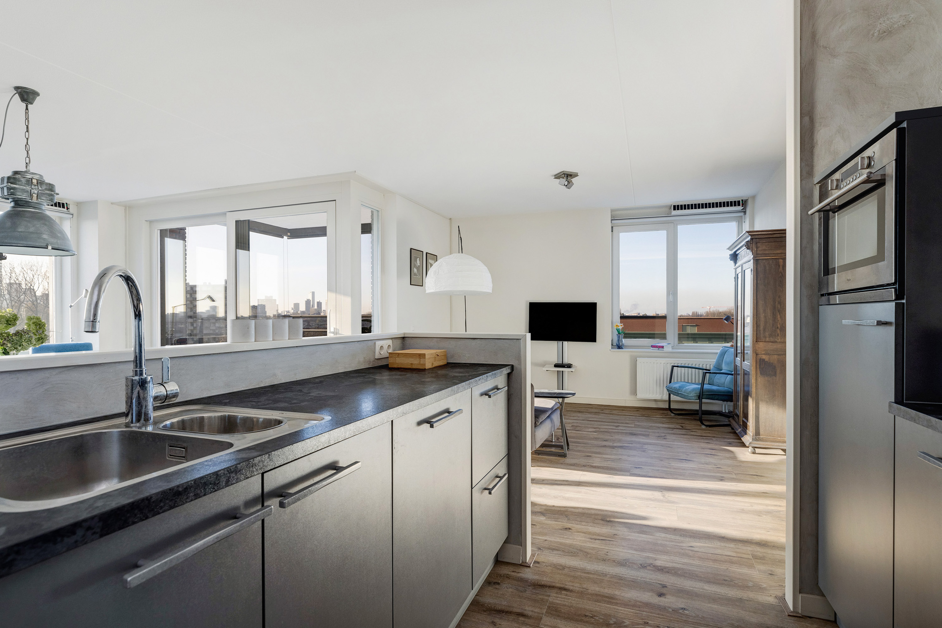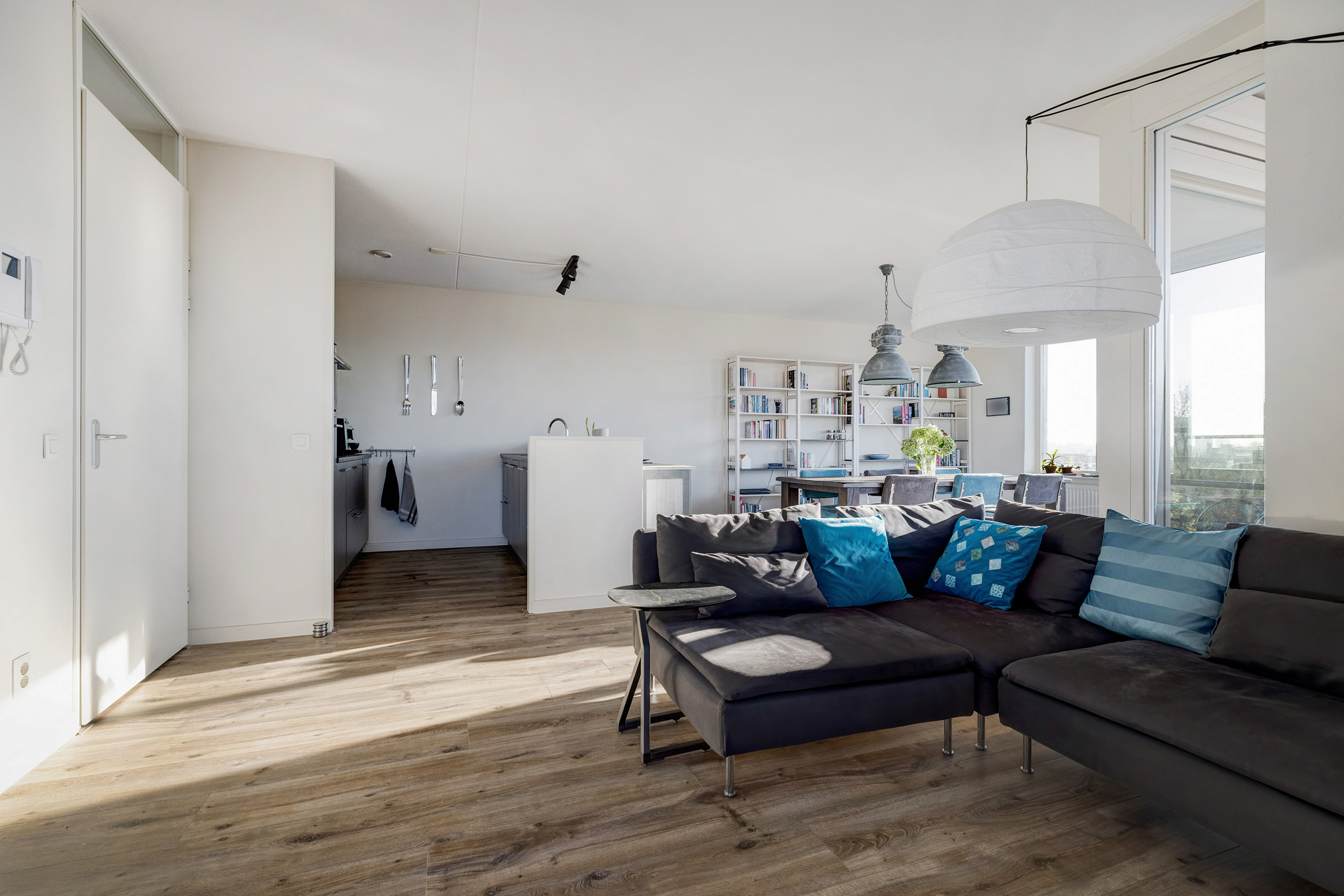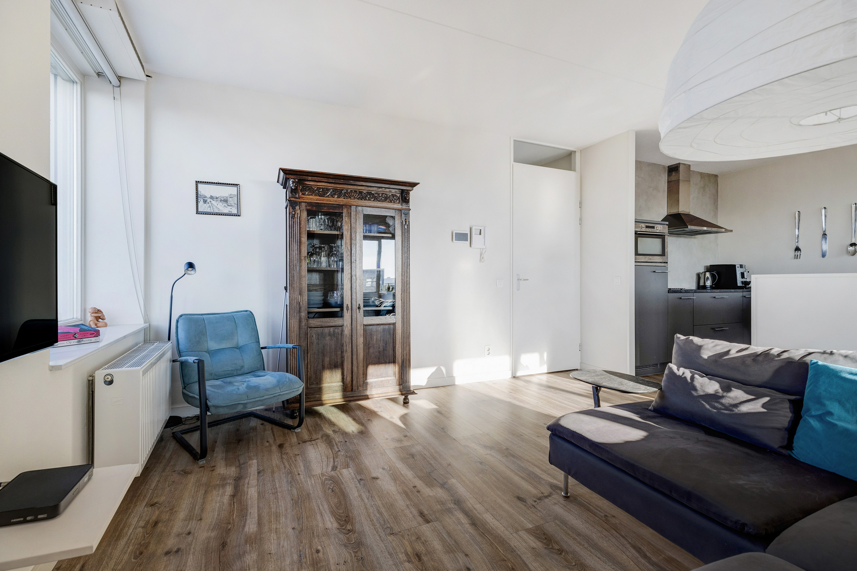 Sfeervolle lichte woonkamer met smaakvolle open keuken en schuifpui naar het balkon met veel privacy en middag-/ avondzon. De keuken is voorzien van diverse inbouwapparatuur. Vanuit de gang is de bijkeuken bereikbaar met de voorzieningen voor de wasmachine en de droger. Erg praktisch!