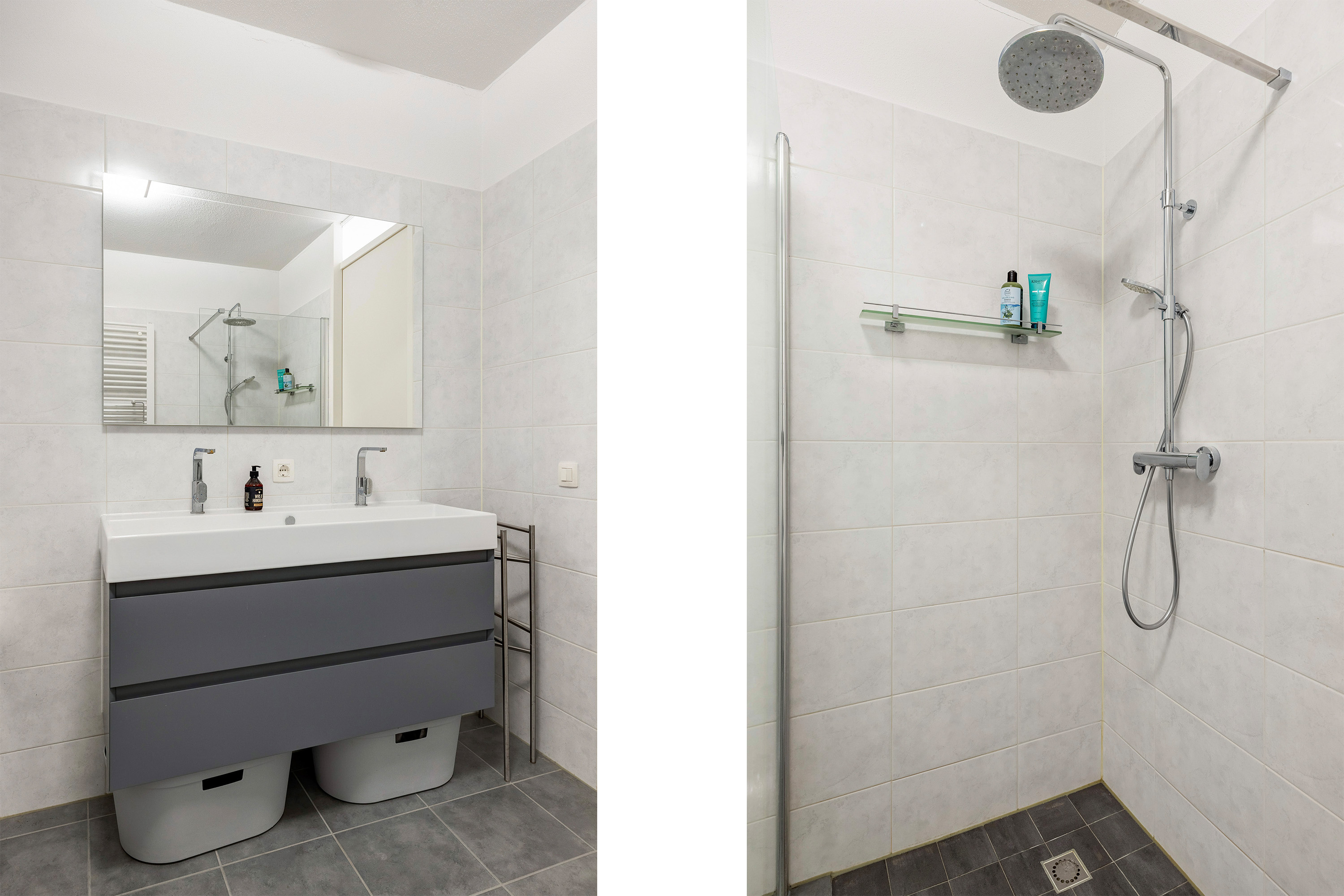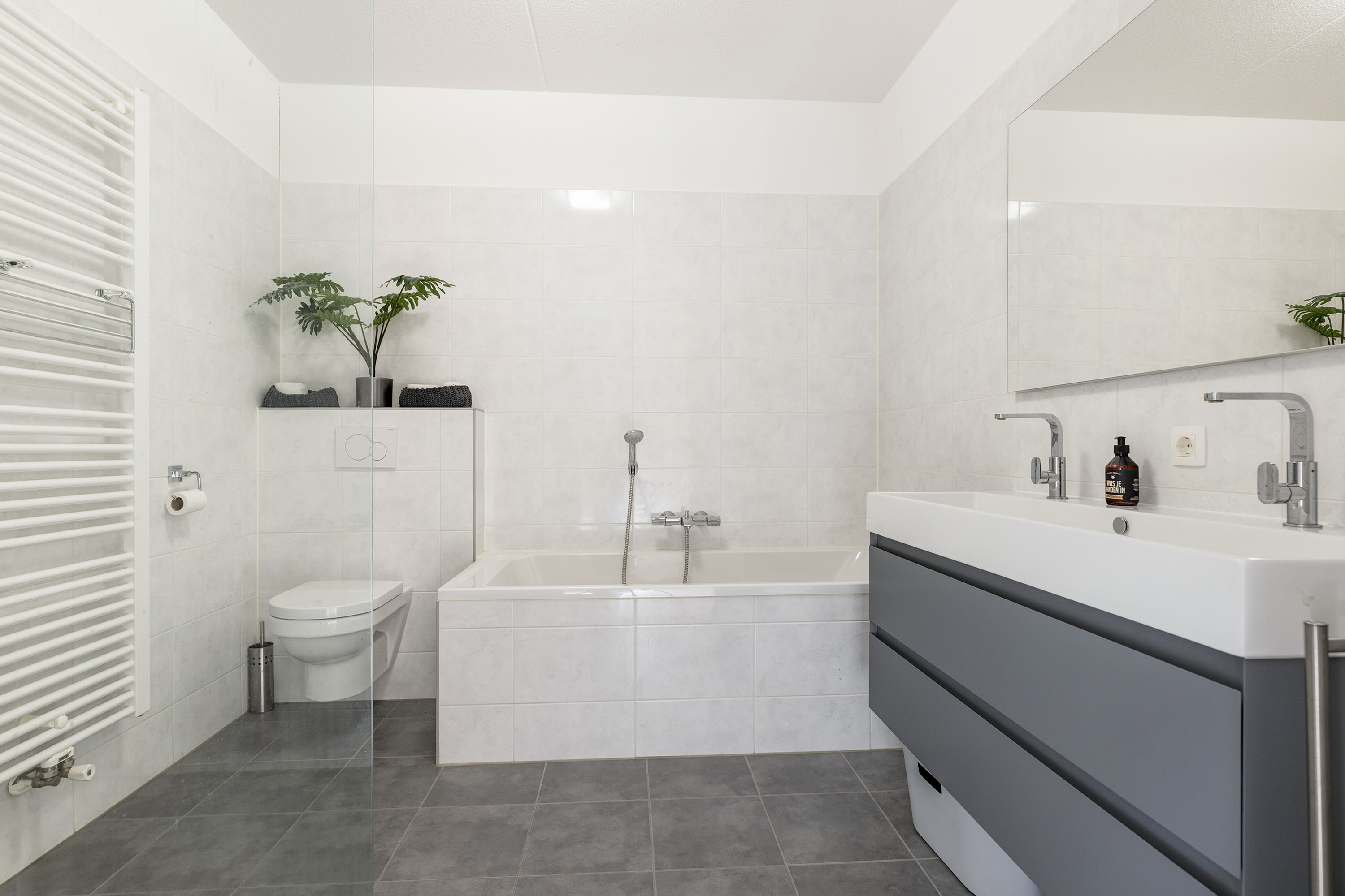 De moderne badkamer, met het entree vanuit de gang, is voorzien van een separate douche, ligbad, wastafelcombinatie en 2e toilet.