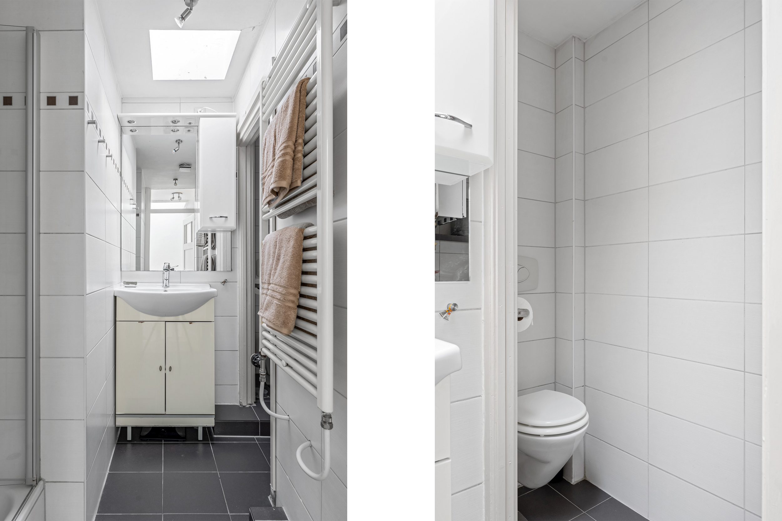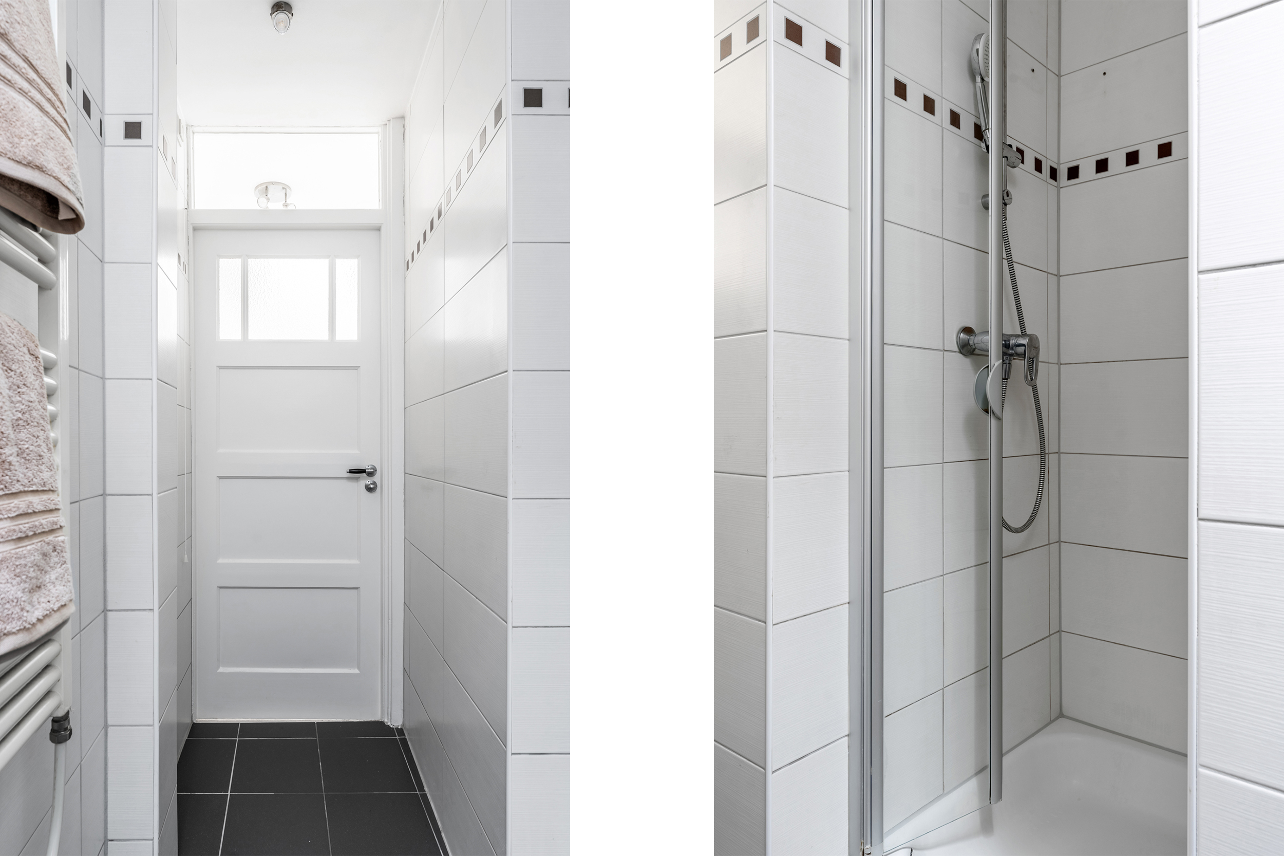 Nette badkamer met toilet, douche, wastafel en aansluiting voor wasmachine;