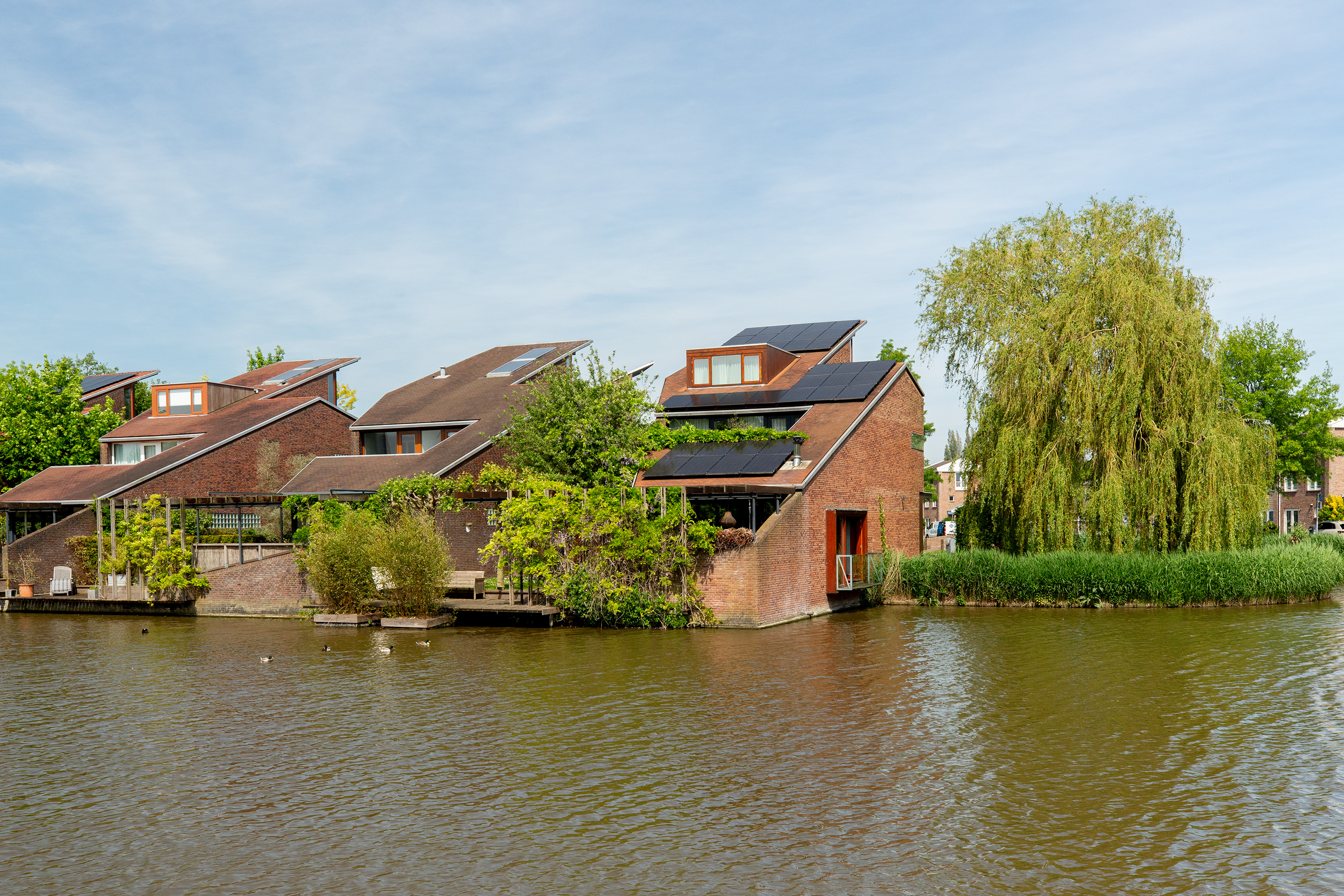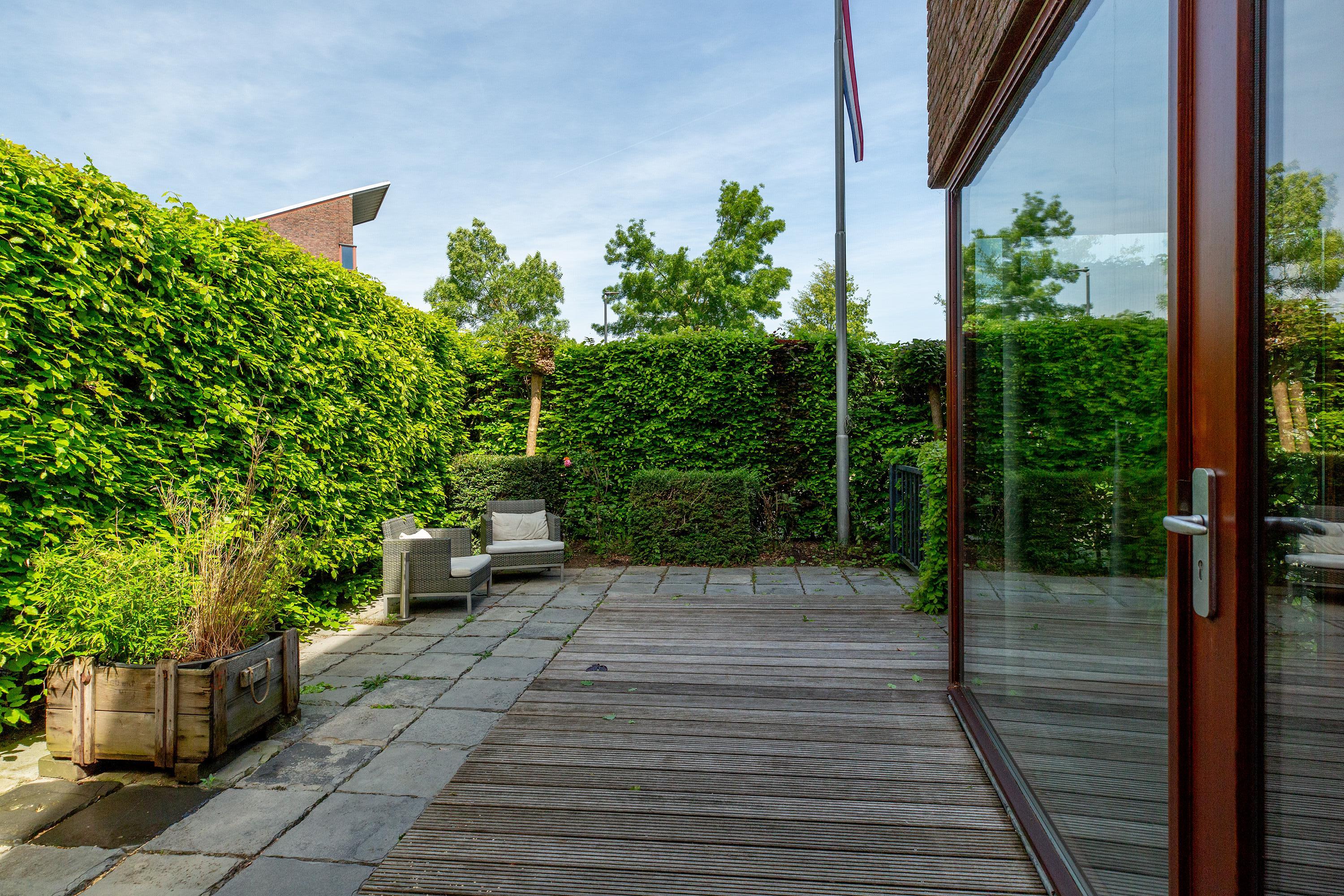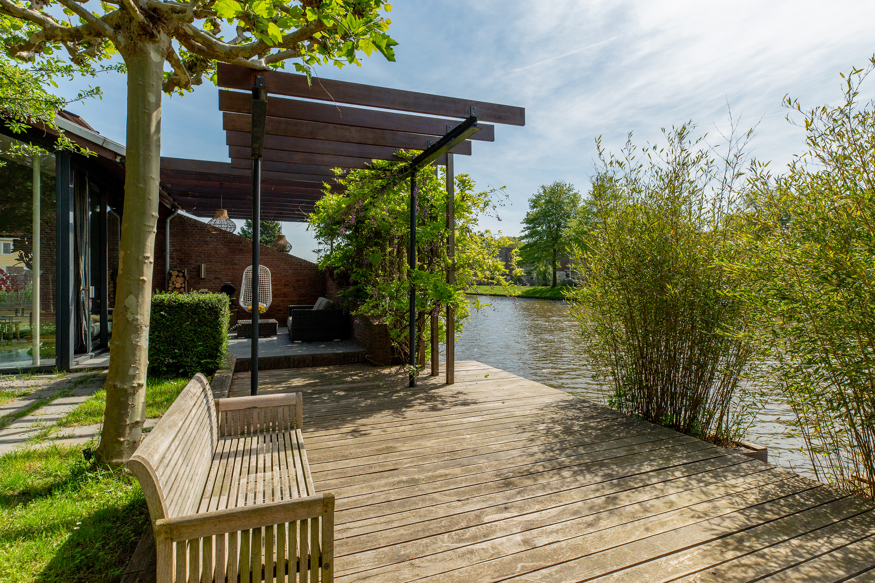 Onder architectuur aangelegde, stijlvolle voor-, zij- en achtertuin aan het water, met onder andere een aanlegsteiger en diverse terrassen;