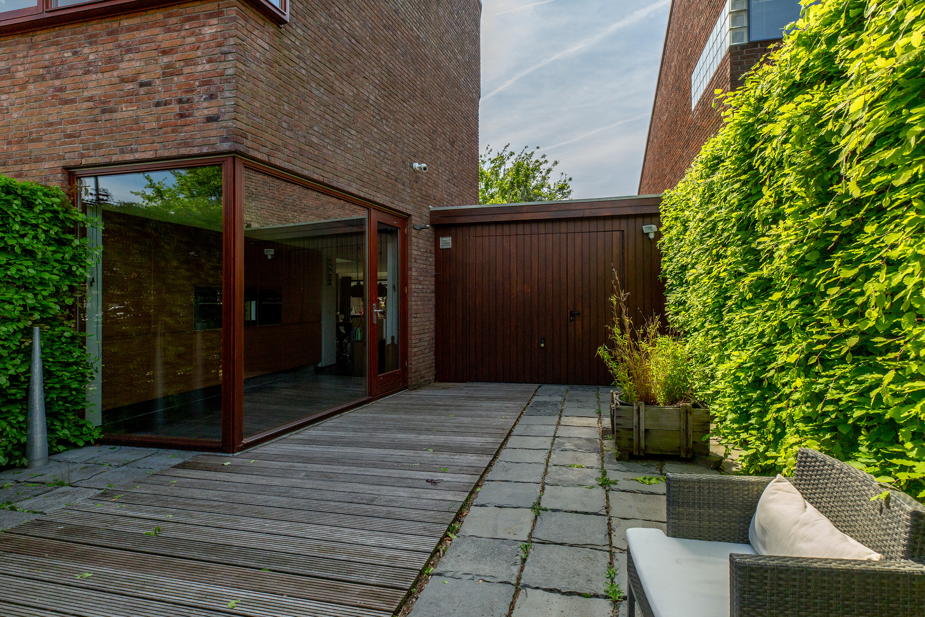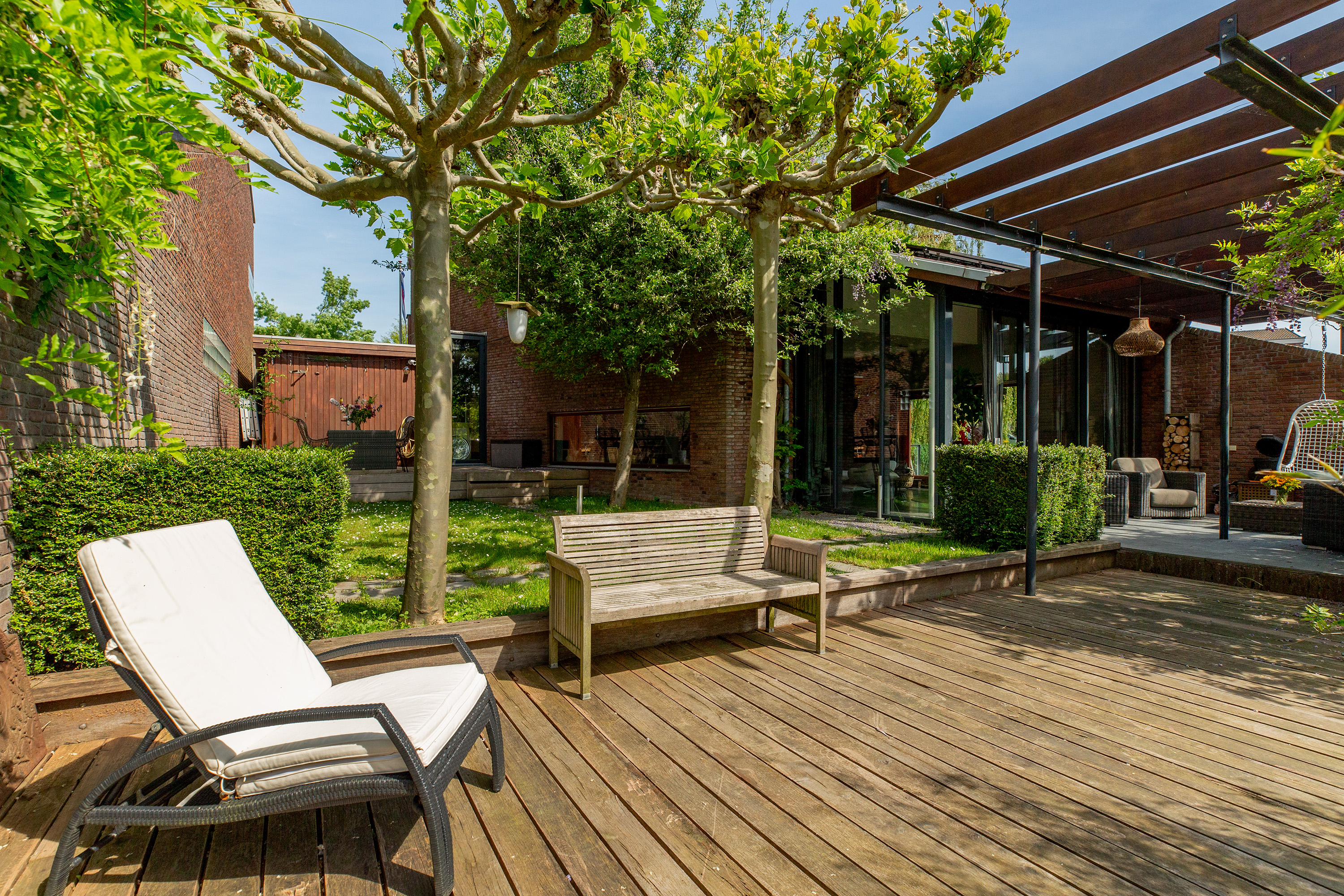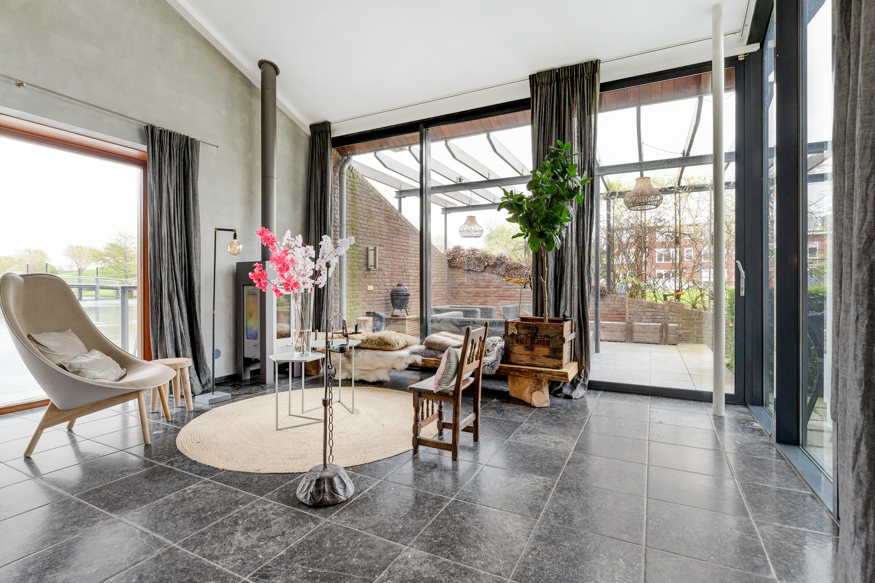 Onder architectuur aangelegde, stijlvolle voor-, zij- en achtertuin aan het water, met onder andere een aanlegsteiger en diverse terrassen;