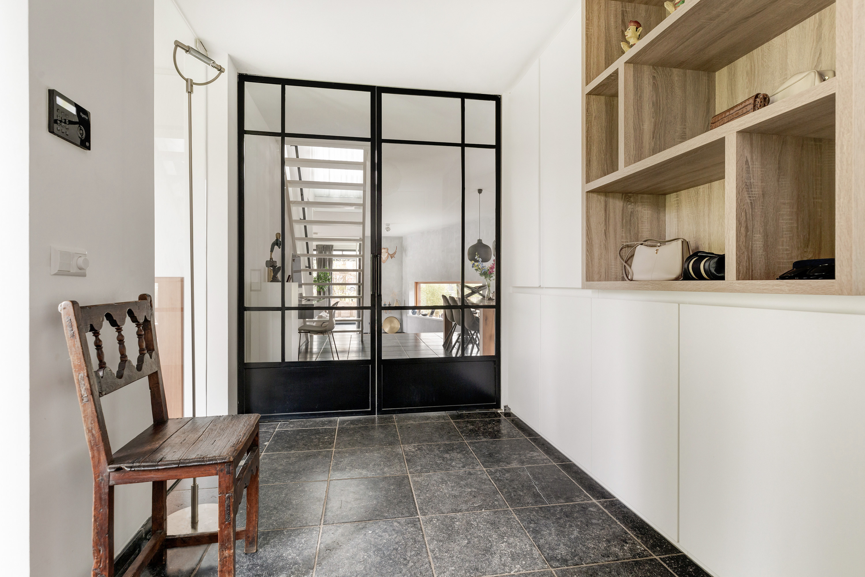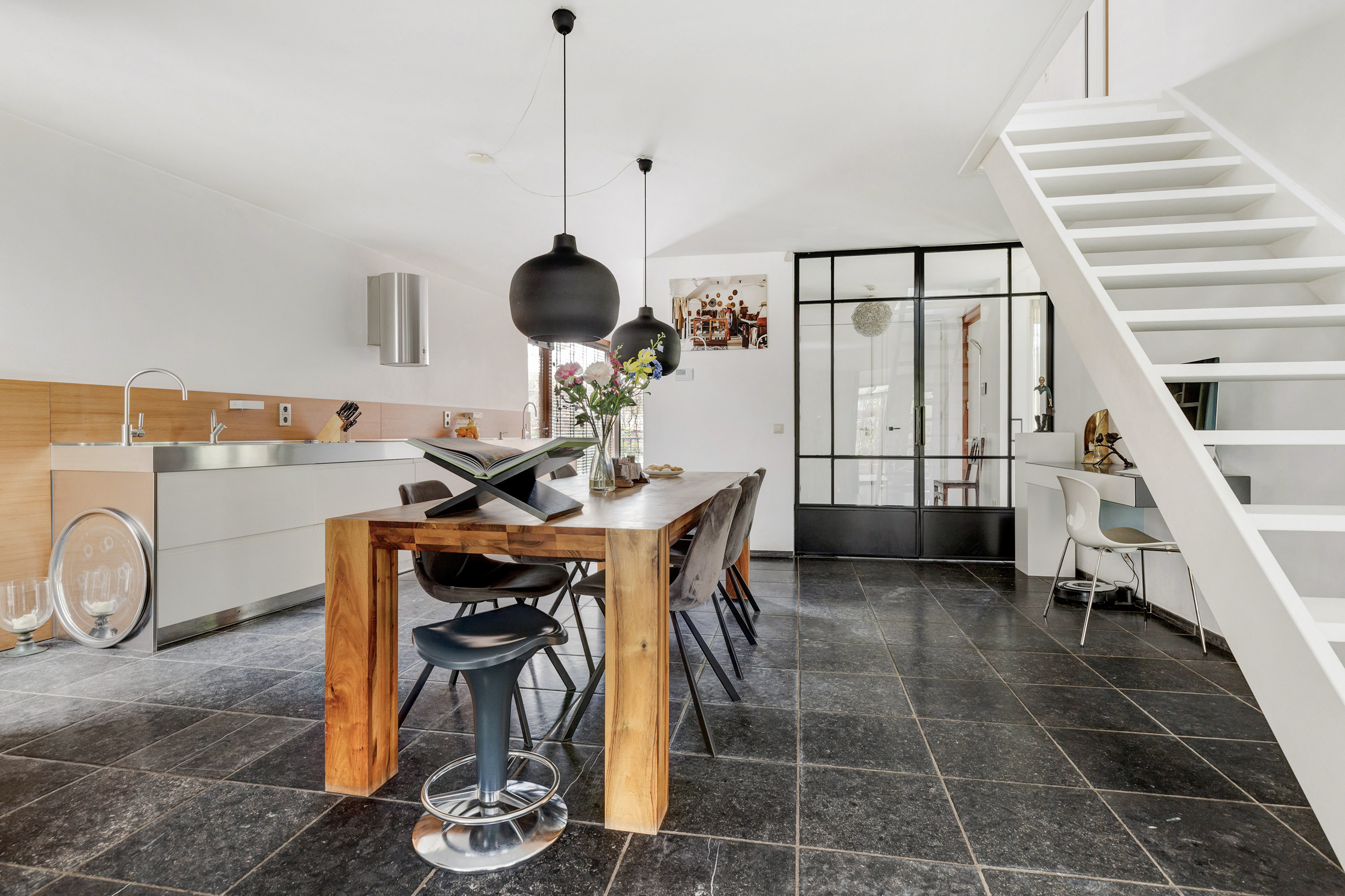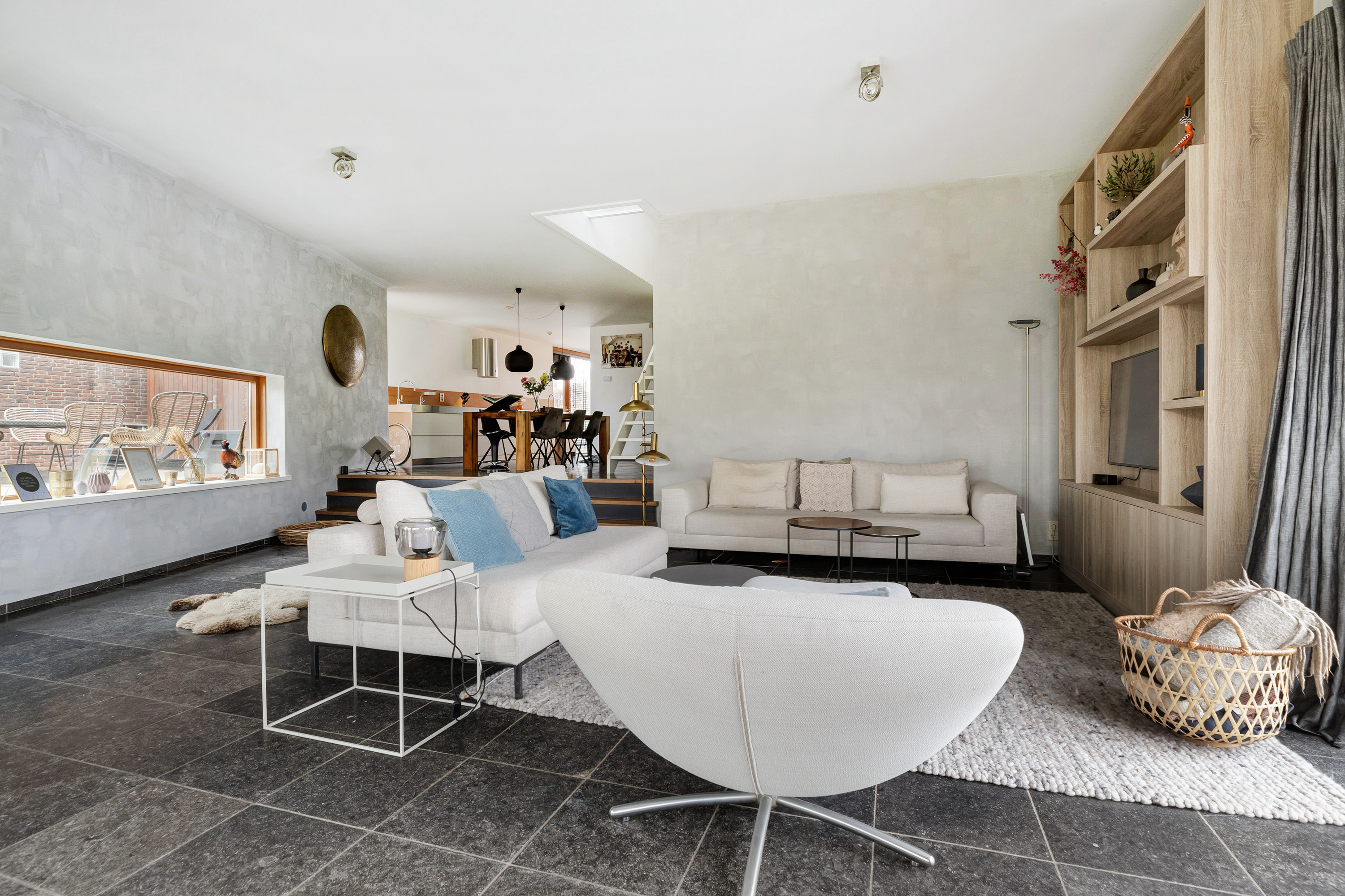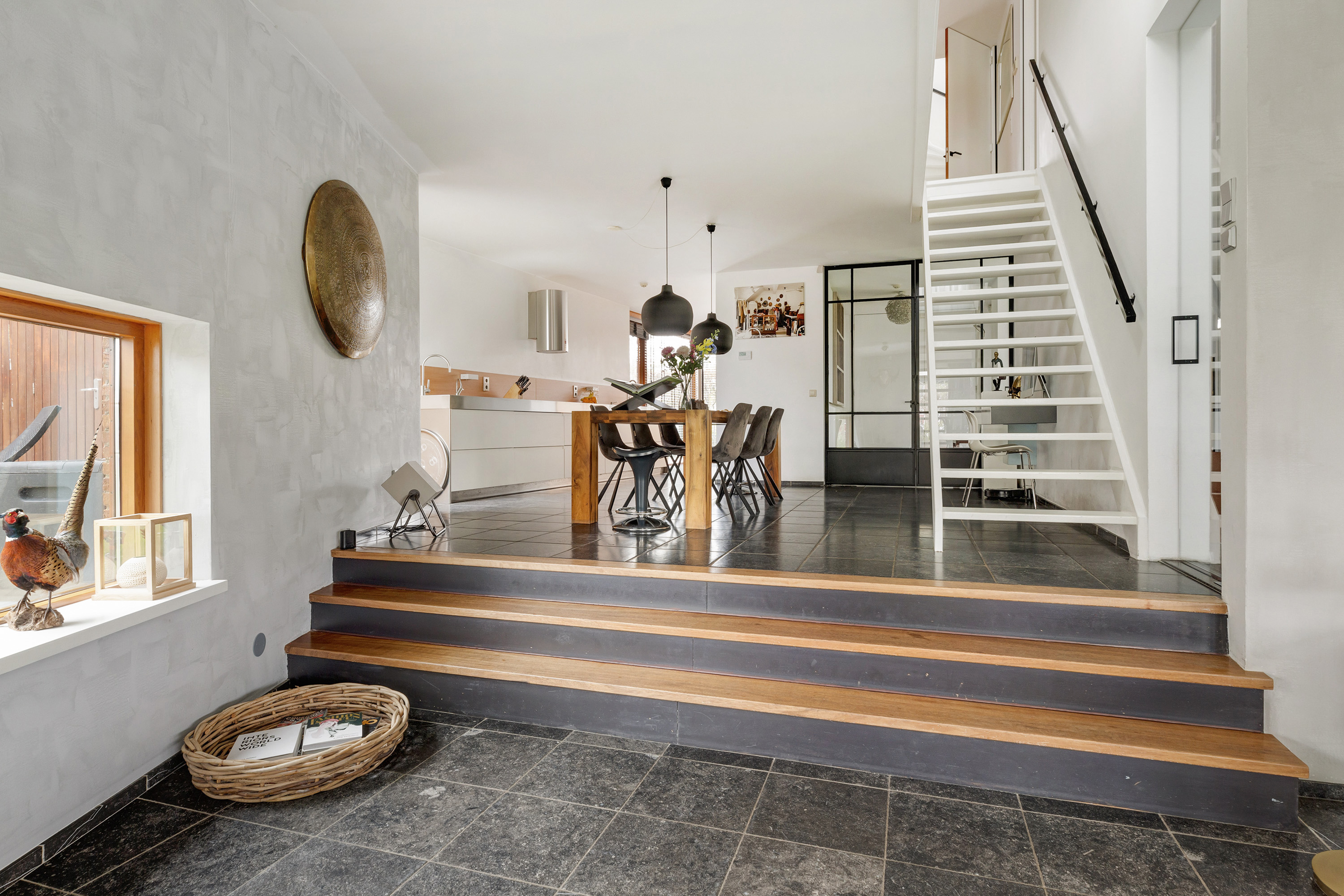Entree, royale hal met een vaste op maat gemaakte garderobekast, meterkast en een modern toilet met fontein. Openslaande deuren in staal uitgevoerd leiden naar de woon-/eetkamer met een verlaagde zitkamer van ca. 45 m², een plafondhoogte van ca. 3 meter, een sfeervolle houtkachel, een Belgisch hardstenen vloer en een schuifpui naar de tuin. De eetkamer van ca. 30 m² grenst aan de luxe, tijdloze en ruime halfopen moderne keuken met Belgisch hardstenen vloer. Deze is voorzien van een Quooker, vaatwasser, afzuigkap, inductie kookplaat, een combi-ovens/magnetron, een stoomoven, een geïntegreerde koffieautomaat, een koelkast en een vriezer. De voormalige garage is omgebouwd tot een multifunctionele kamer, momenteel in gebruik als studeer- en t.v.-kamer.