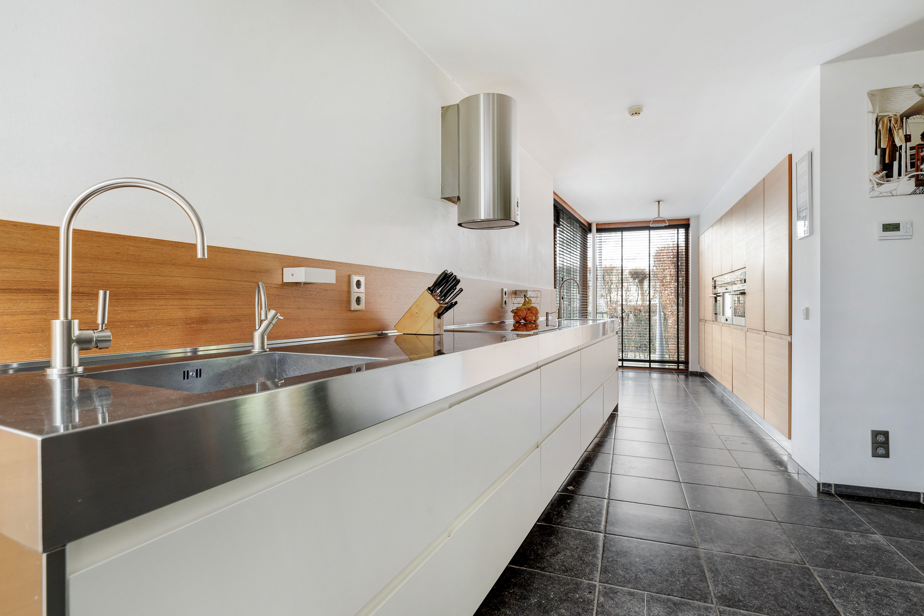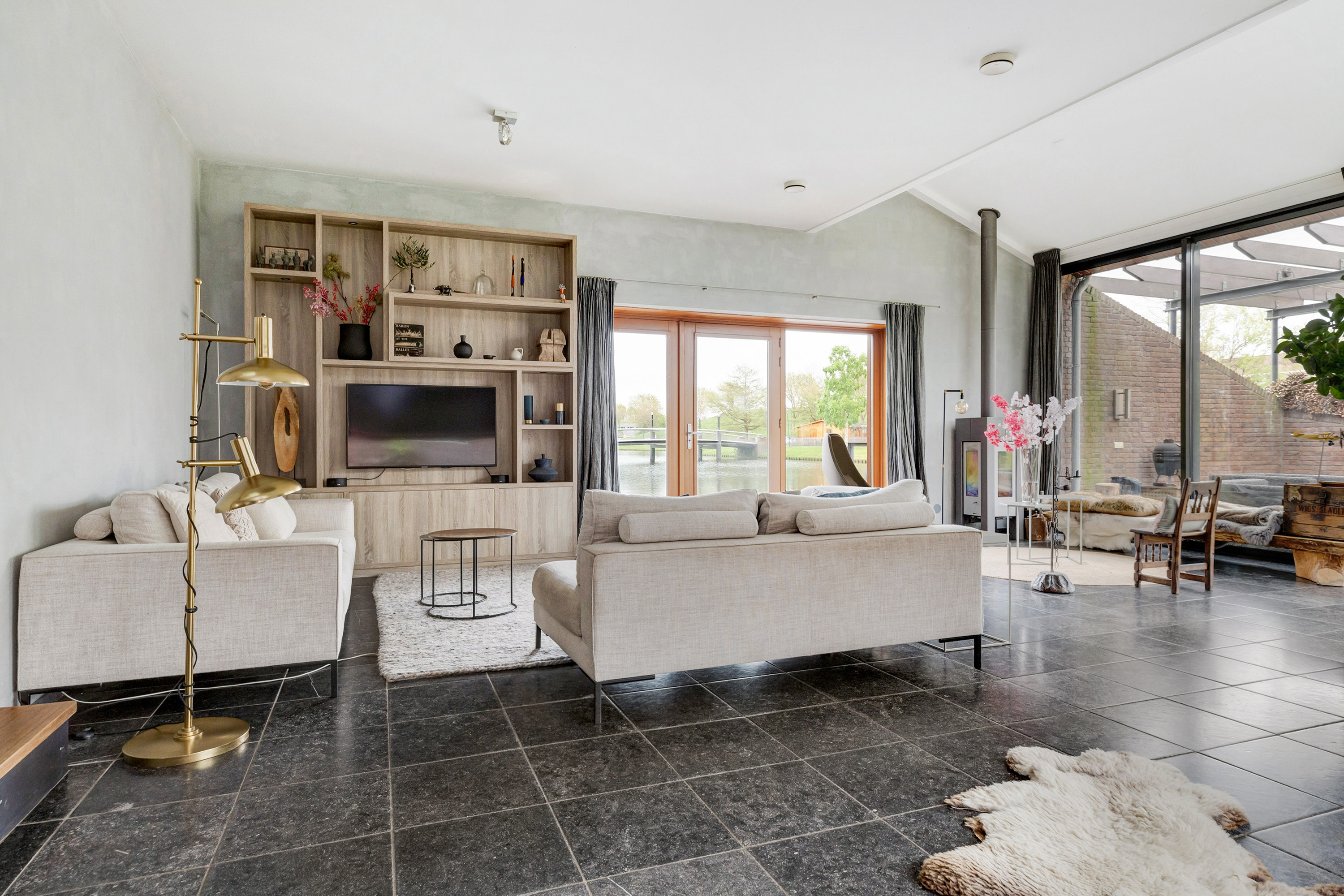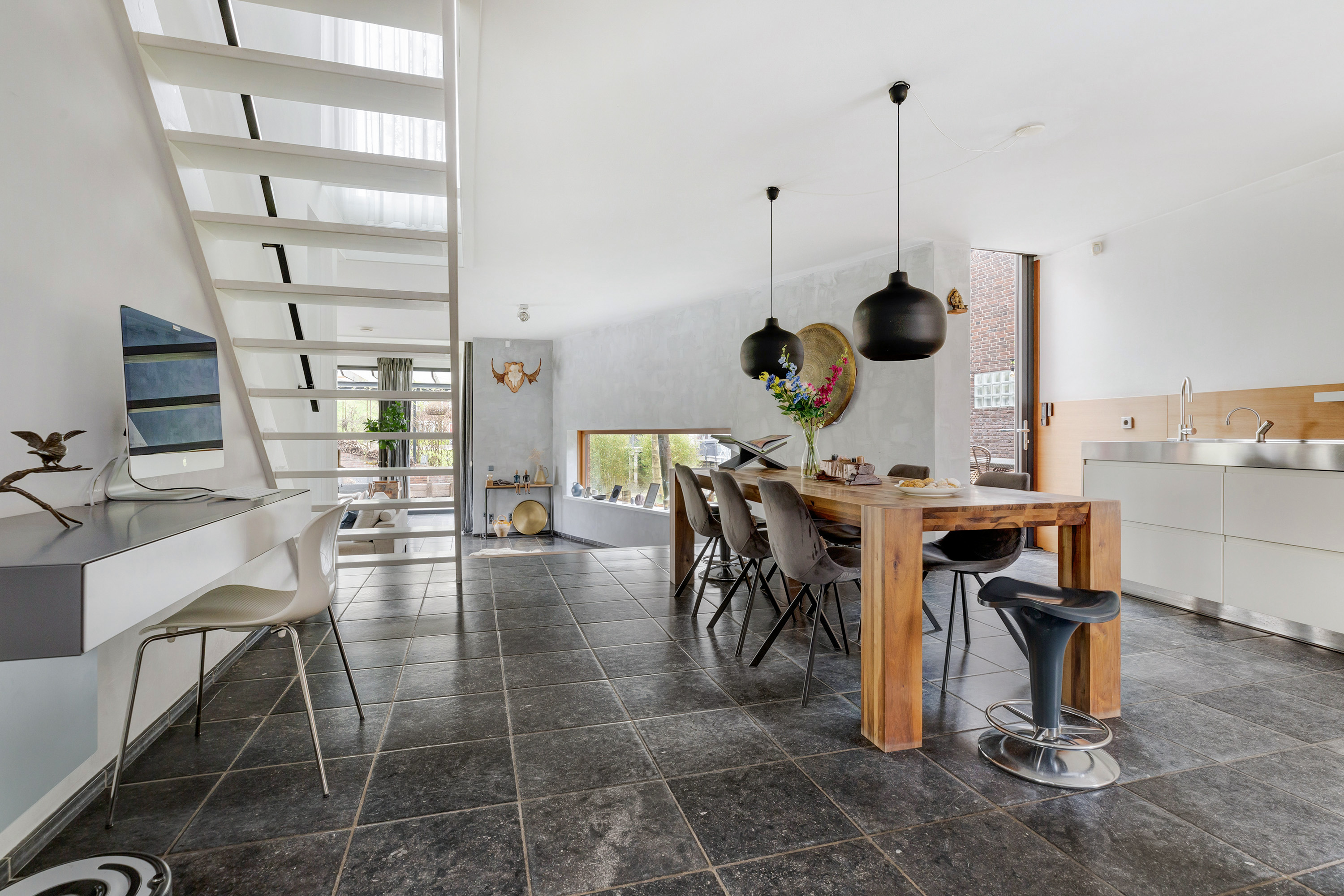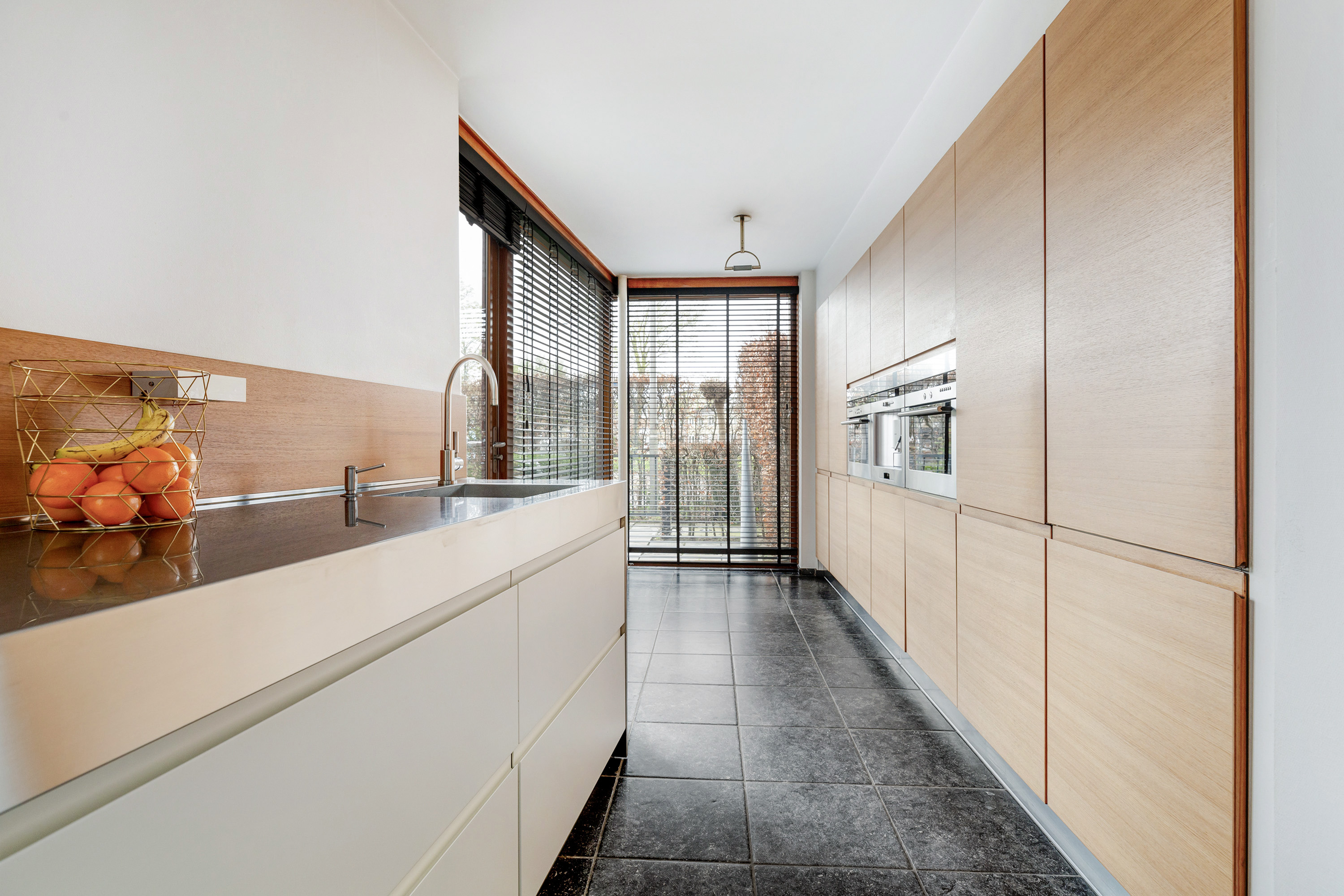 Entree, royale hal met een vaste op maat gemaakte garderobekast, meterkast en een modern toilet met fontein. Openslaande deuren in staal uitgevoerd leiden naar de woon-/eetkamer met een verlaagde zitkamer van ca. 45 m², een plafondhoogte van ca. 3 meter, een sfeervolle houtkachel, een Belgisch hardstenen vloer en een schuifpui naar de tuin. De eetkamer van ca. 30 m² grenst aan de luxe, tijdloze en ruime halfopen moderne keuken met Belgisch hardstenen vloer. Deze is voorzien van een Quooker, vaatwasser, afzuigkap, inductie kookplaat, een combi-ovens/magnetron, een stoomoven, een geïntegreerde koffieautomaat, een koelkast en een vriezer. De voormalige garage is omgebouwd tot een multifunctionele kamer, momenteel in gebruik als studeer- en t.v.-kamer.