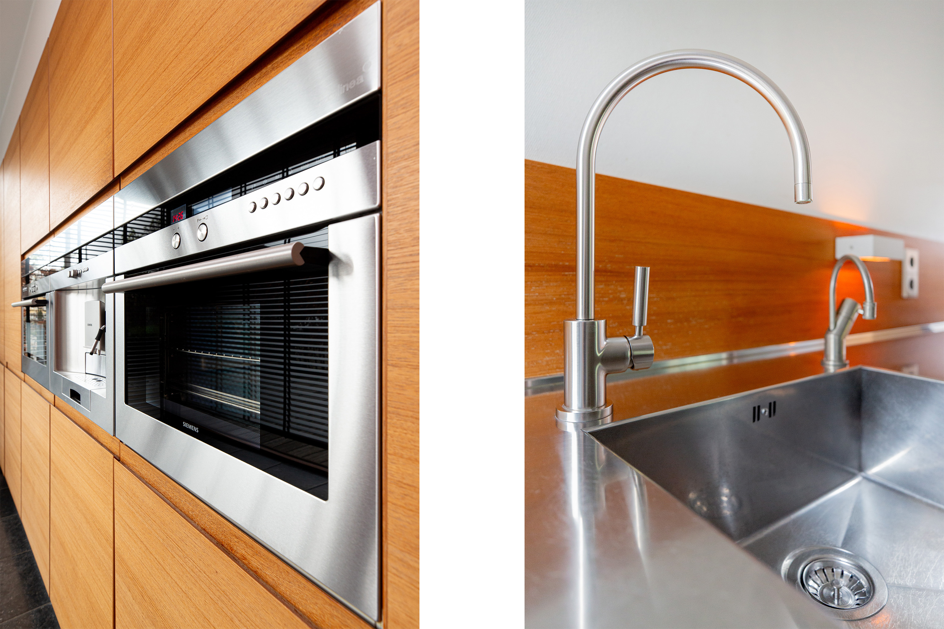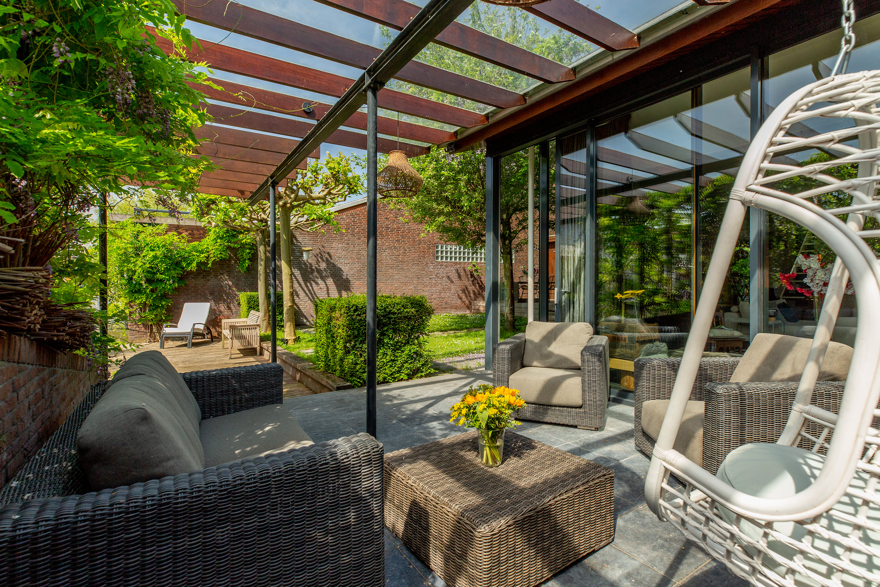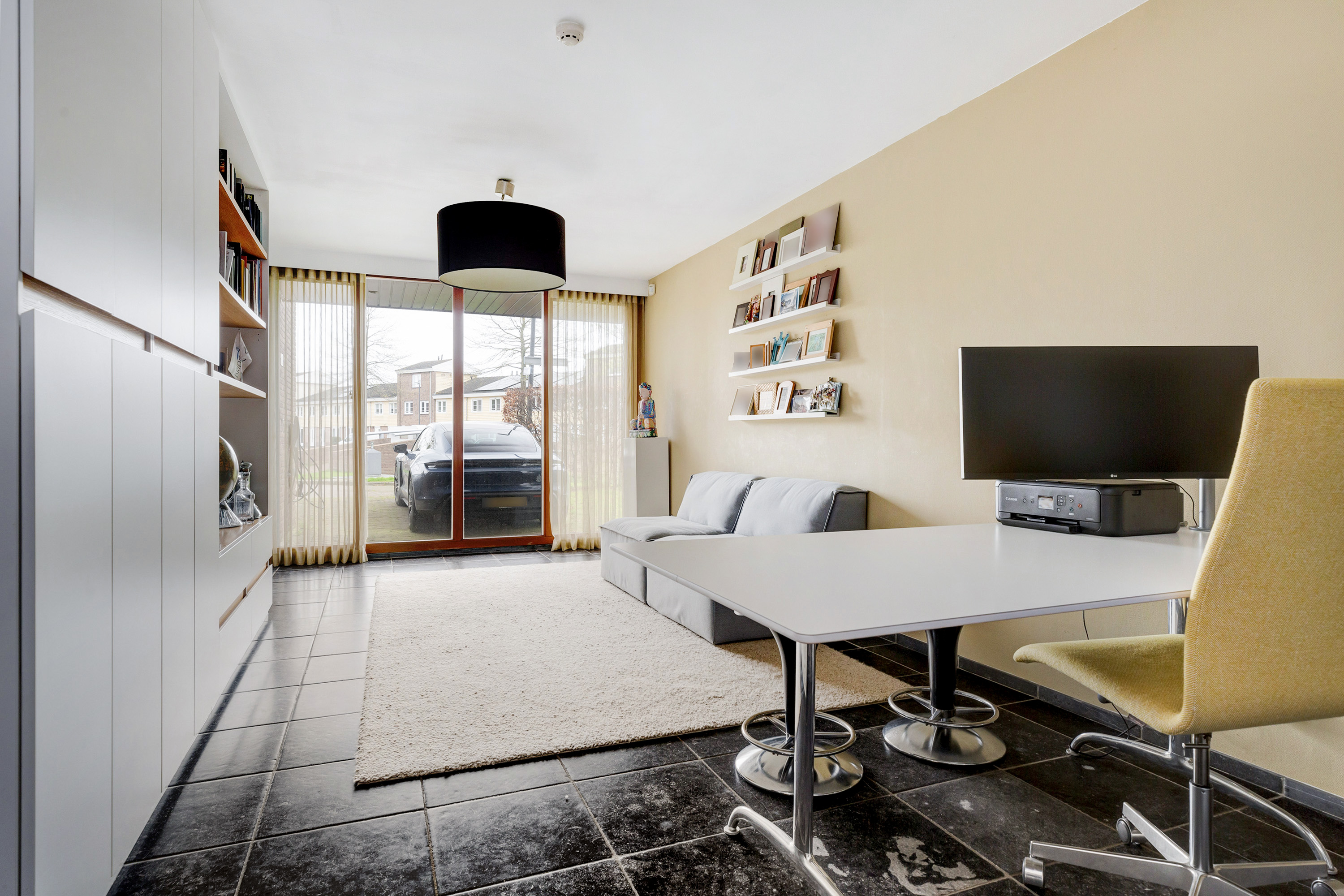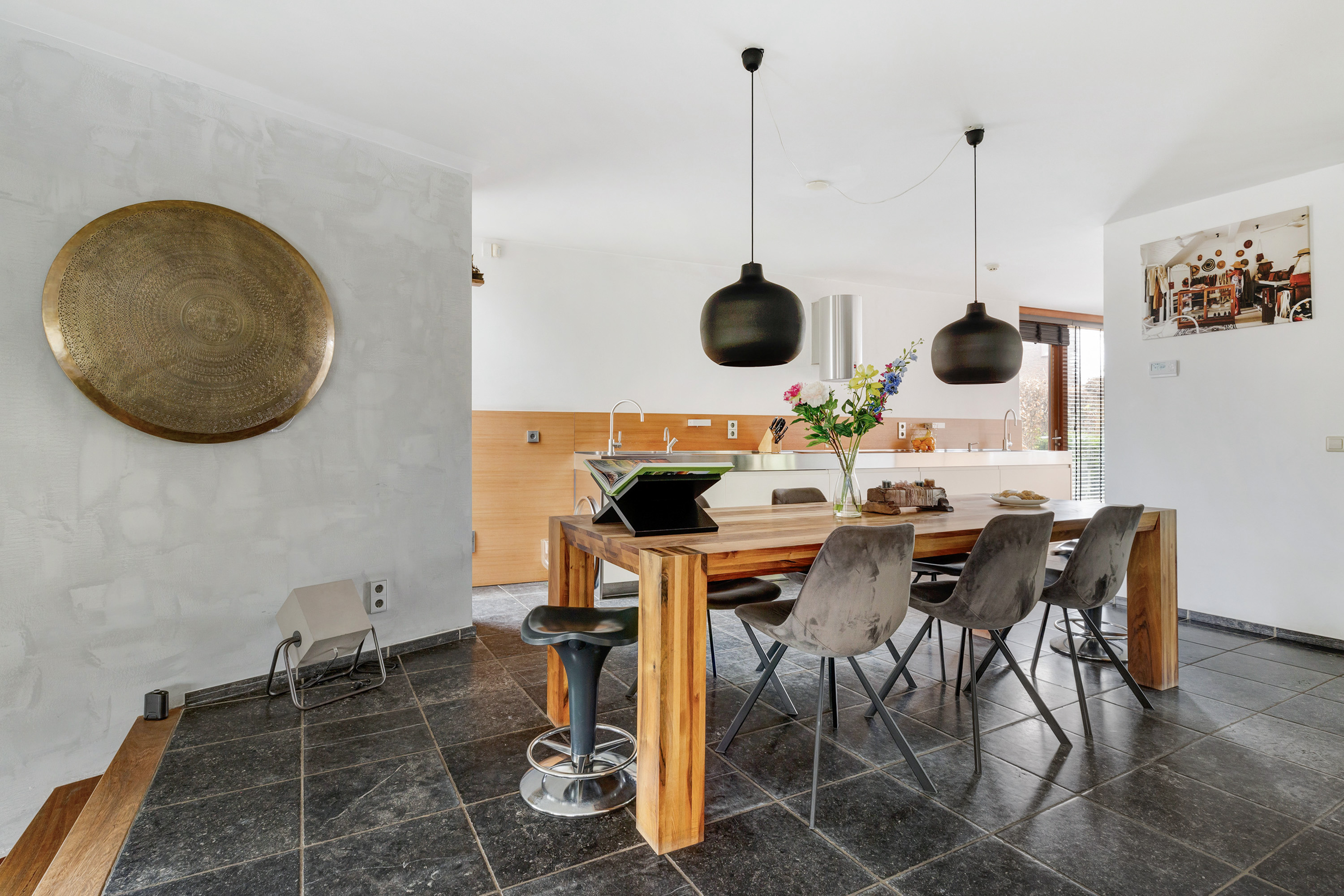 Entree, royale hal met een vaste op maat gemaakte garderobekast, meterkast en een modern toilet met fontein. Openslaande deuren in staal uitgevoerd leiden naar de woon-/eetkamer met een verlaagde zitkamer van ca. 45 m², een plafondhoogte van ca. 3 meter, een sfeervolle houtkachel, een Belgisch hardstenen vloer en een schuifpui naar de tuin. De eetkamer van ca. 30 m² grenst aan de luxe, tijdloze en ruime halfopen moderne keuken met Belgisch hardstenen vloer. Deze is voorzien van een Quooker, vaatwasser, afzuigkap, inductie kookplaat, een combi-ovens/magnetron, een stoomoven, een geïntegreerde koffieautomaat, een koelkast en een vriezer. De voormalige garage is omgebouwd tot een multifunctionele kamer, momenteel in gebruik als studeer- en t.v.-kamer.