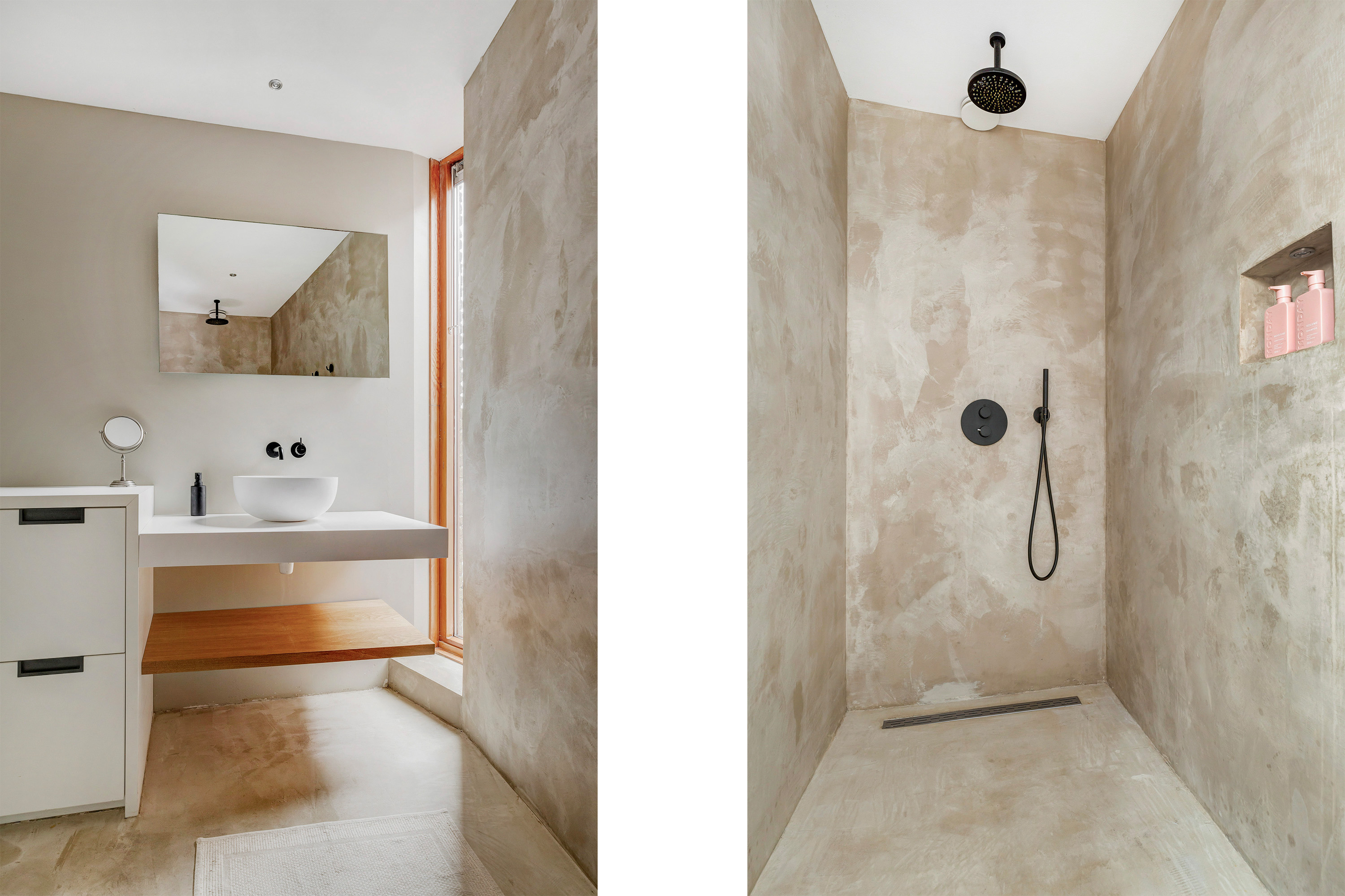 Badkamer met douche en wastafel.