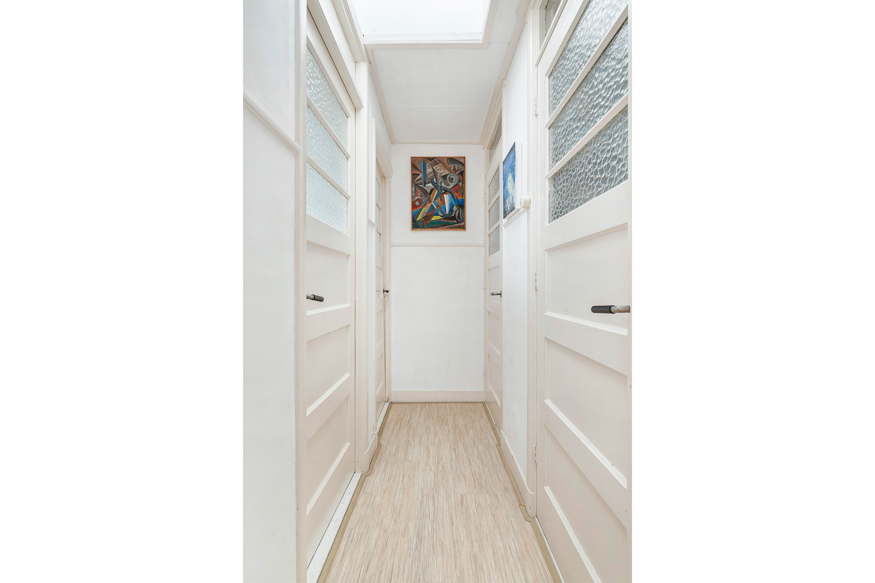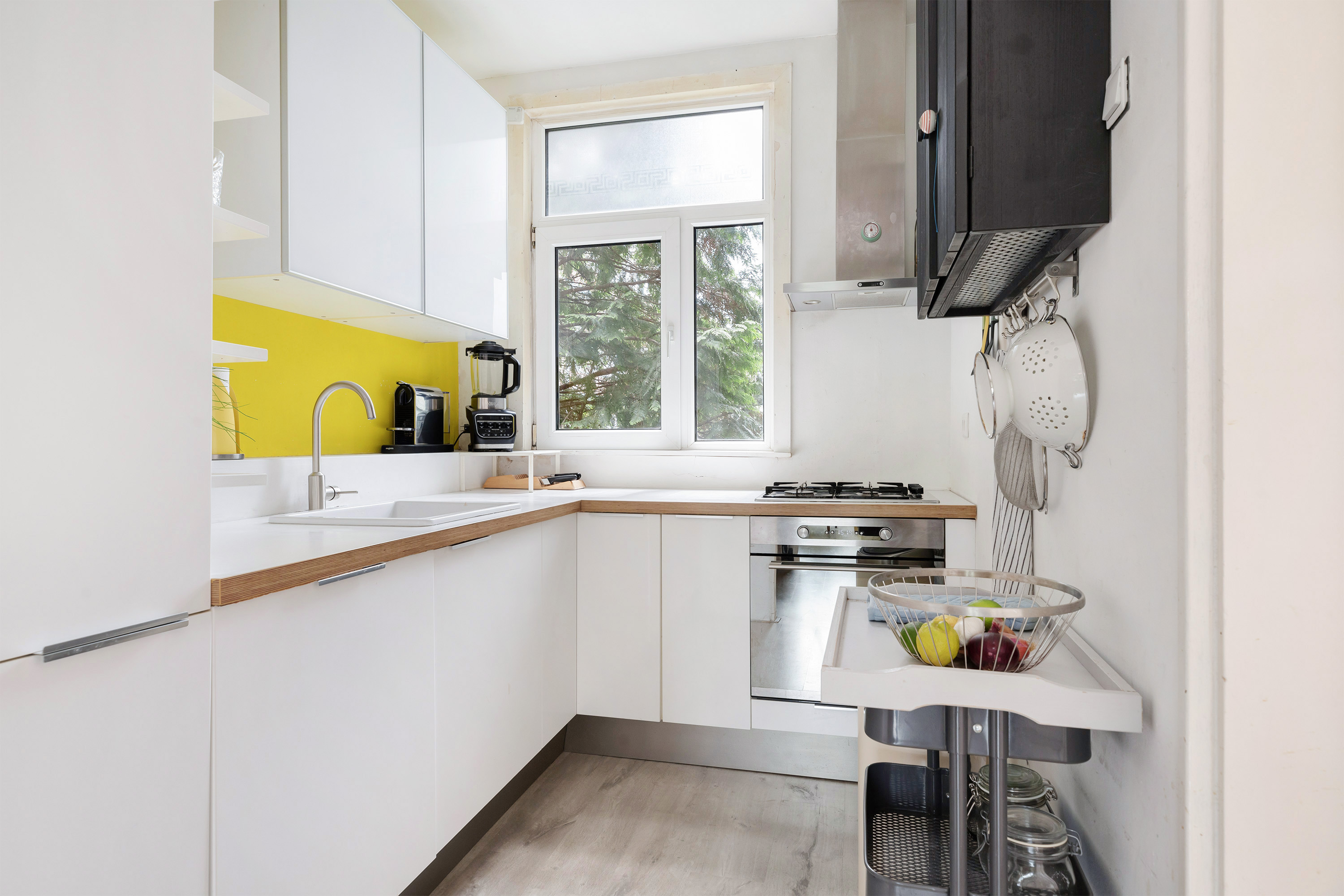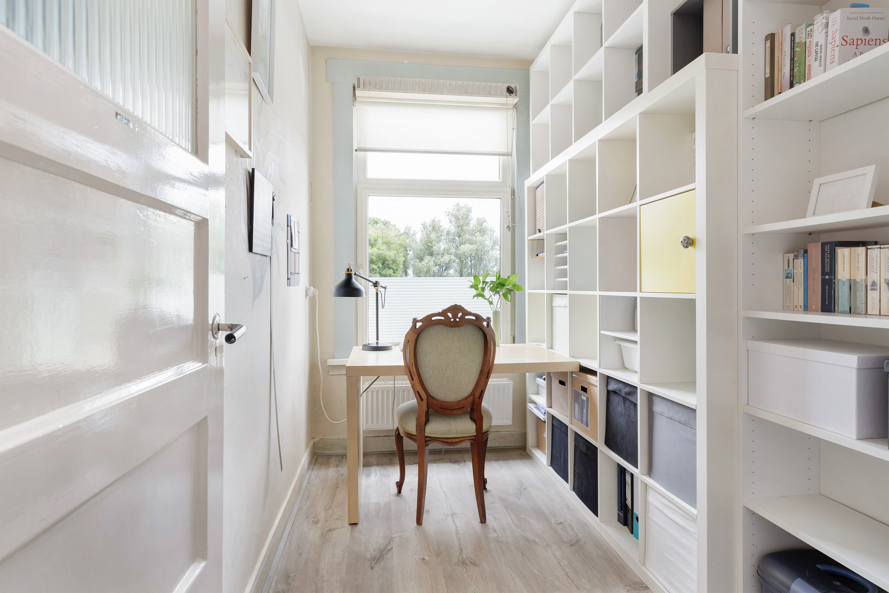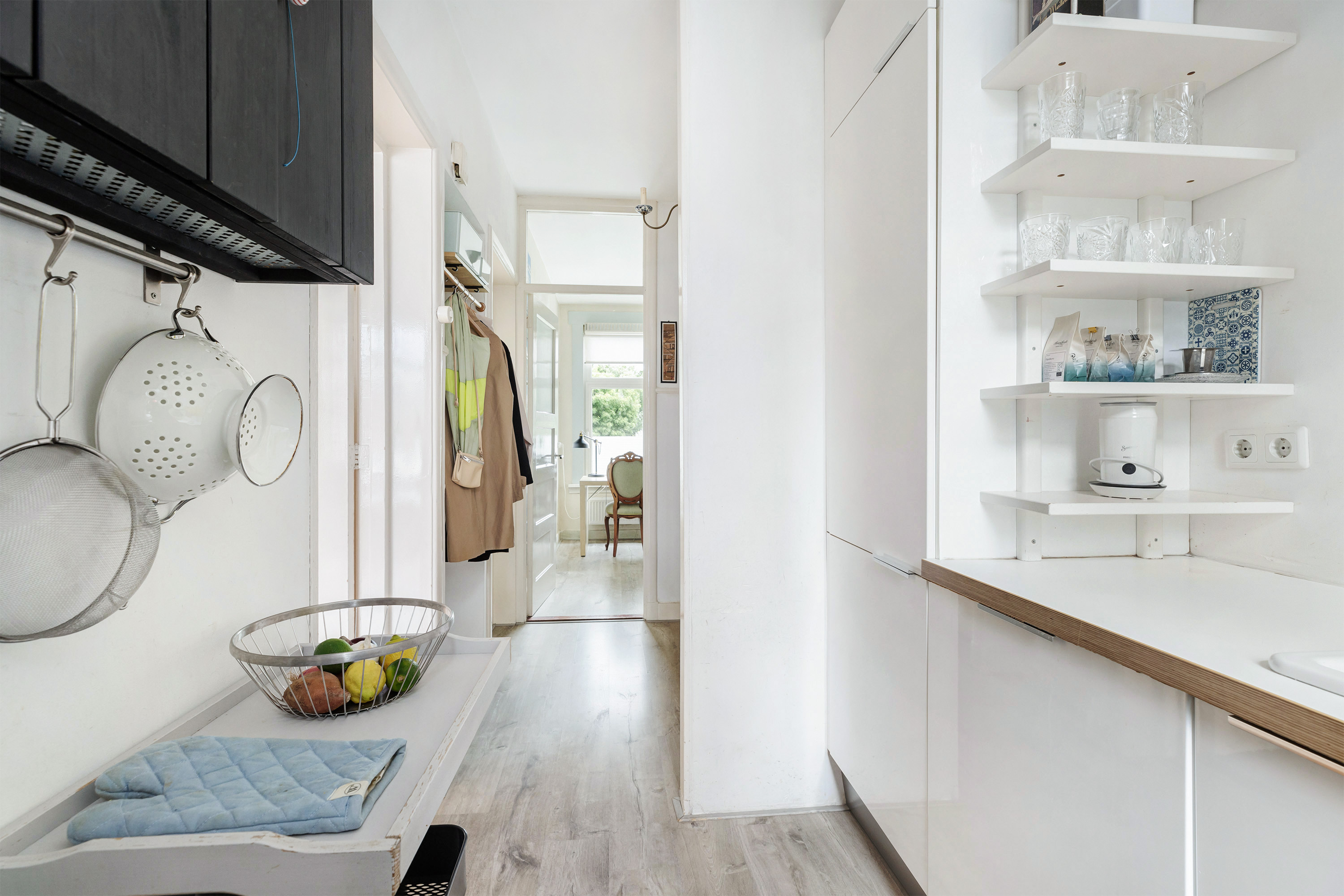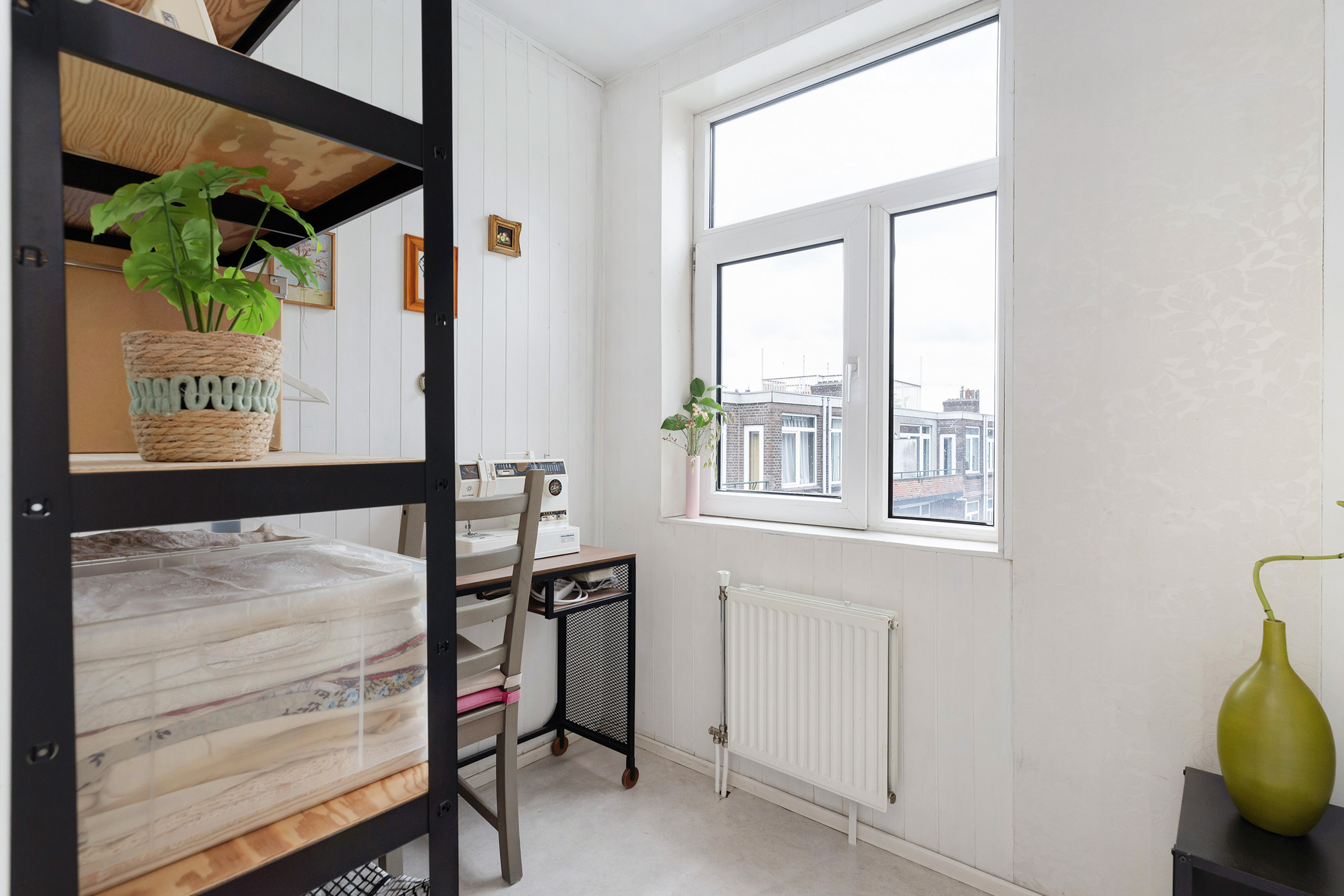 Zowel de woonkamer als de slaap of werkkamer aan de voorzijde bieden een schitterend uitzicht over het Noorderkanaal. Een inspirerende plek om te wonen en te werken, met altijd iets te zien. Aansluitend aan de woonkamer ligt de afgesloten keuken, praktisch en functioneel ingericht.
