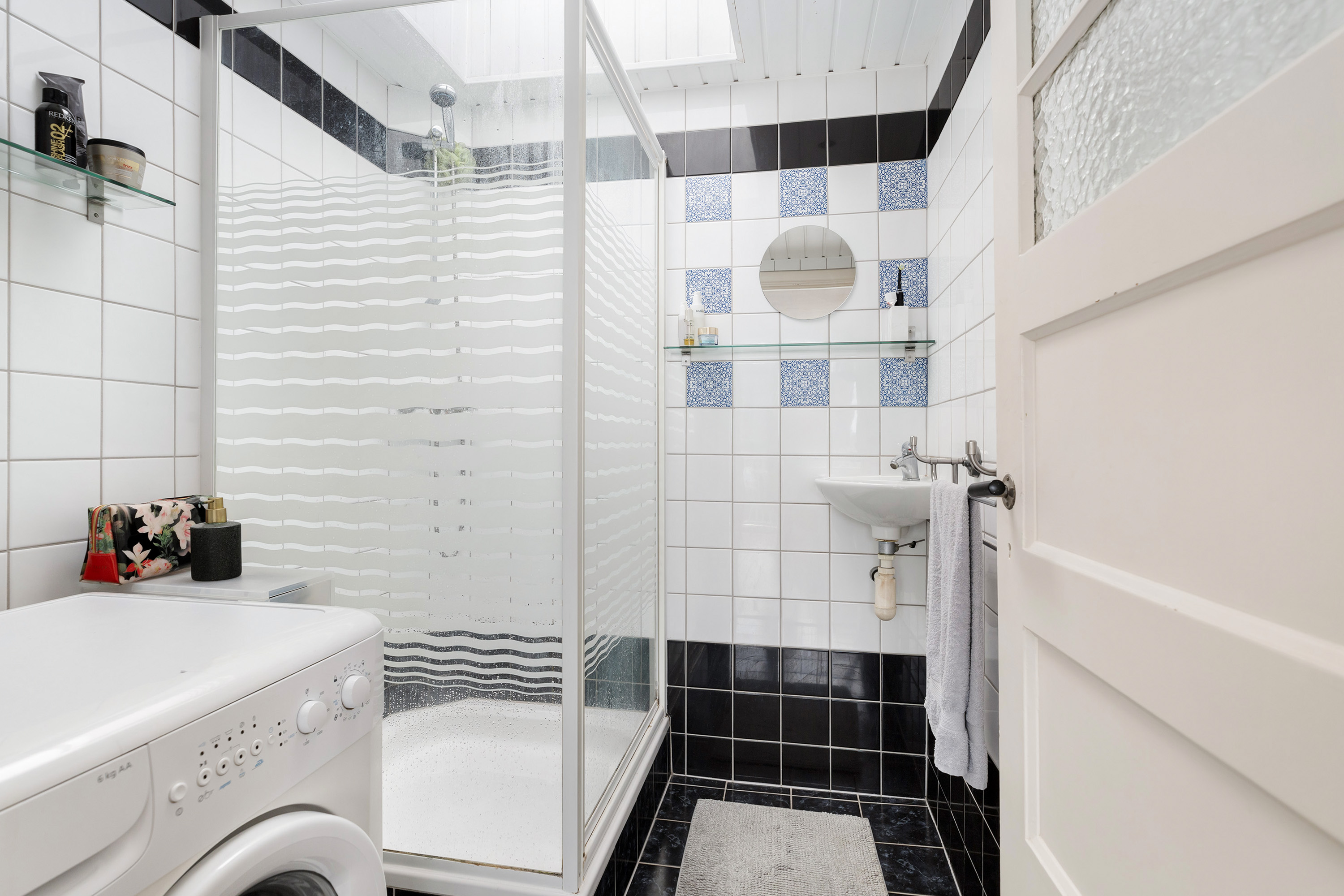 Badkamer (ca. 1.88 x 1.72 m) met inloopdouche, wastafel en wasmachine aansluiting;