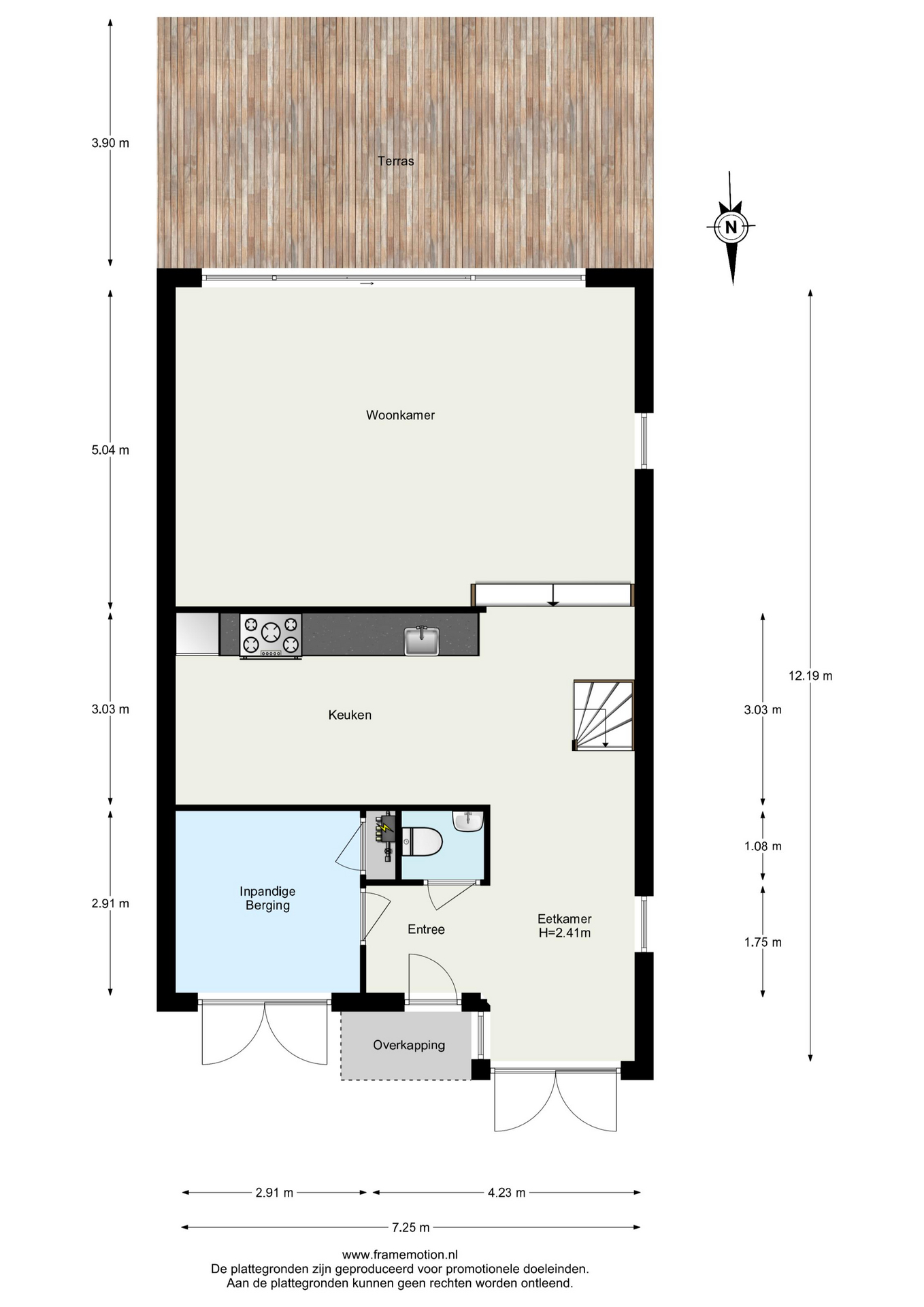 Lager gelegen woonkamer ca. 5.05 x 7.50 m met parketvloer en schuifpui naar terras op het zuiden