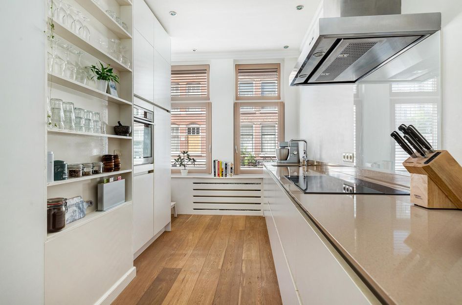 Half-open keuken met moderne Siematic keukeninrichting en diverse inbouwapparatuur, te weten, inductiekookplaat, afzuigkap, koelkast, oven met stoomfunctie, vaatwasser en kokend waterkraan