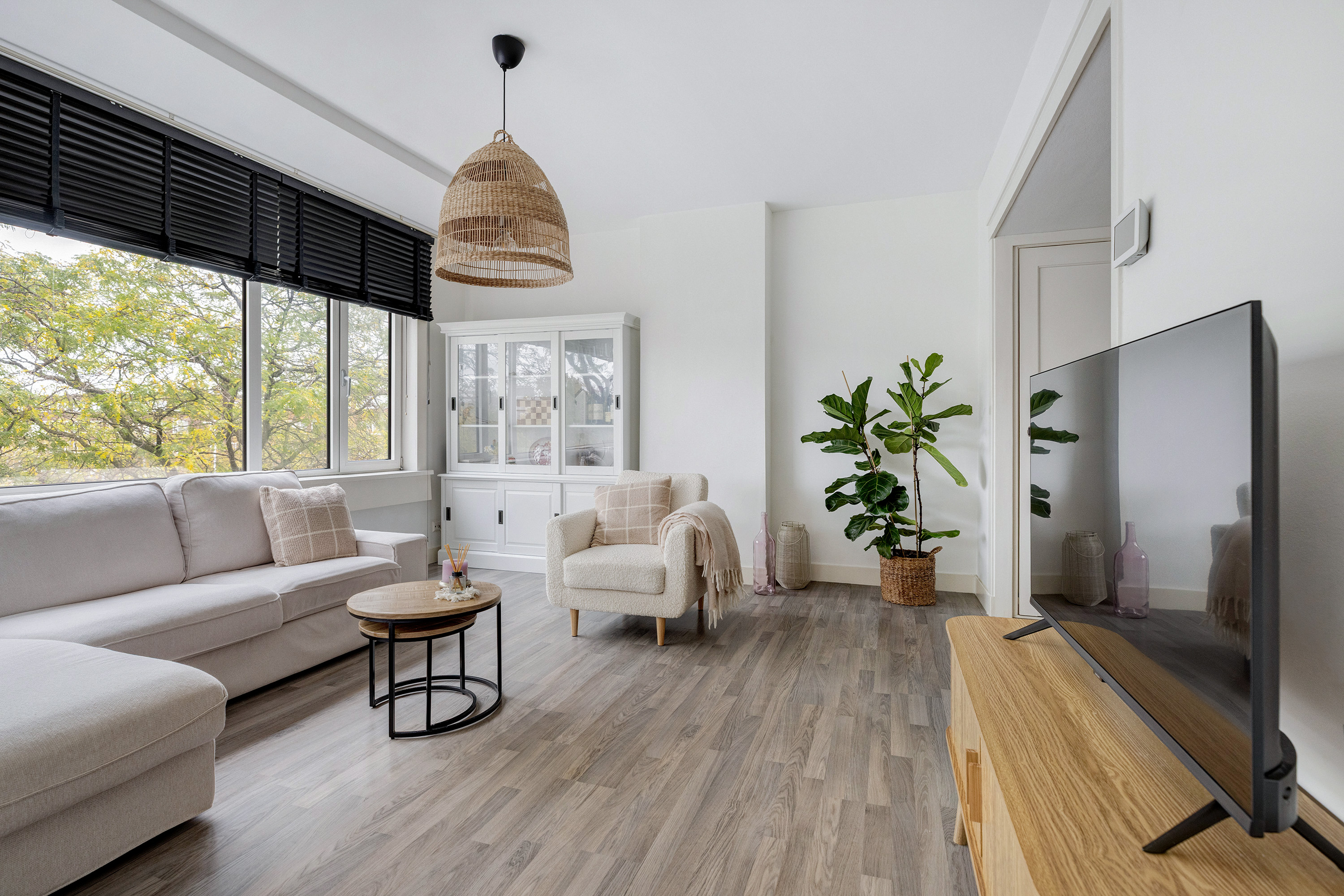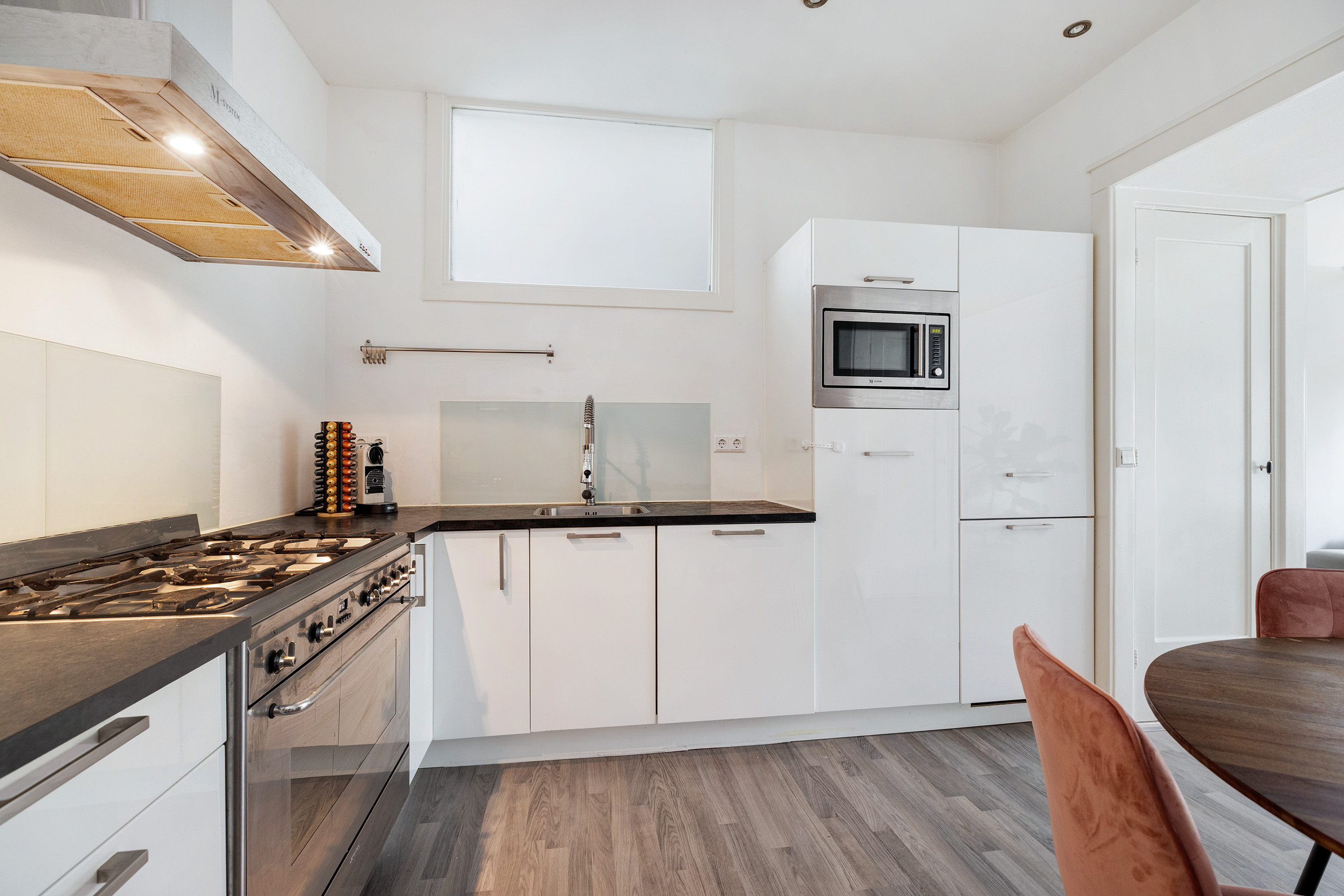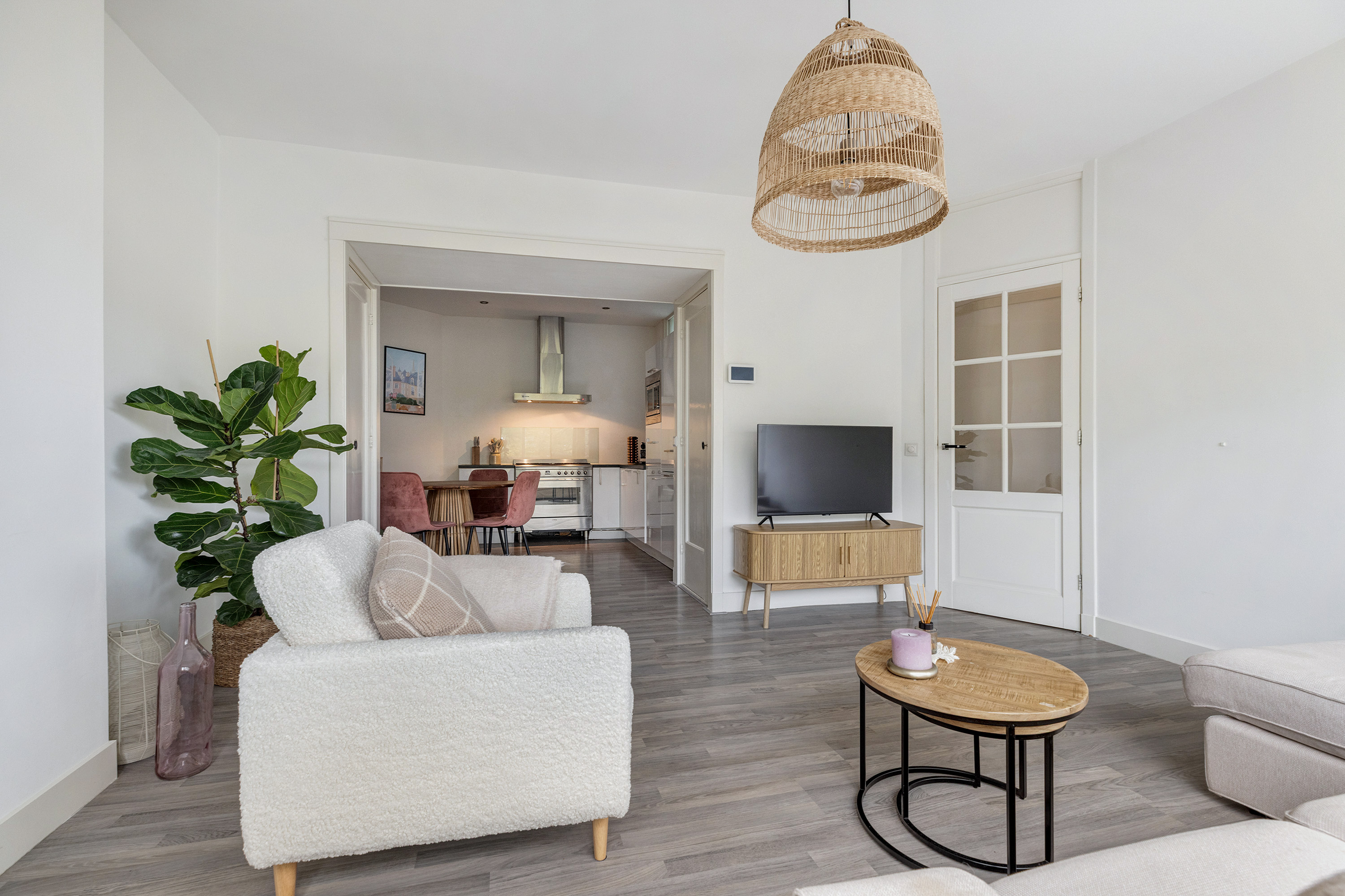Binnenkomst in de centrale hal, welke toegang geeft tot de living, de eerste slaapkamer en de badkamer. Door het gehele appartement ligt een nette laminaatvloer. Als je de living binnenstapt, is het eerste wat opvalt de fijne lichtinval door de brede raampartijen. Deze living is een gezellige ruimte welke eenvoudig is in te delen met een zitgedeelte aan de voorzijde en een eetgedeelte bij de open keuken. De open keuken is voorzien van inbouwspotjes en een keukenblok met hoogglans kastjes en inbouwapparatuur. Je vindt er een koelkast, vriezer, SMEG oven, combimagnetron en 5-pits gaskookplaat met afzuigkap. Naast dit alles is er genoeg ruimte voor een leuke eettafel waar je met je gasten bij kan kletsen terwijl je een heerlijk gerecht bereidt.