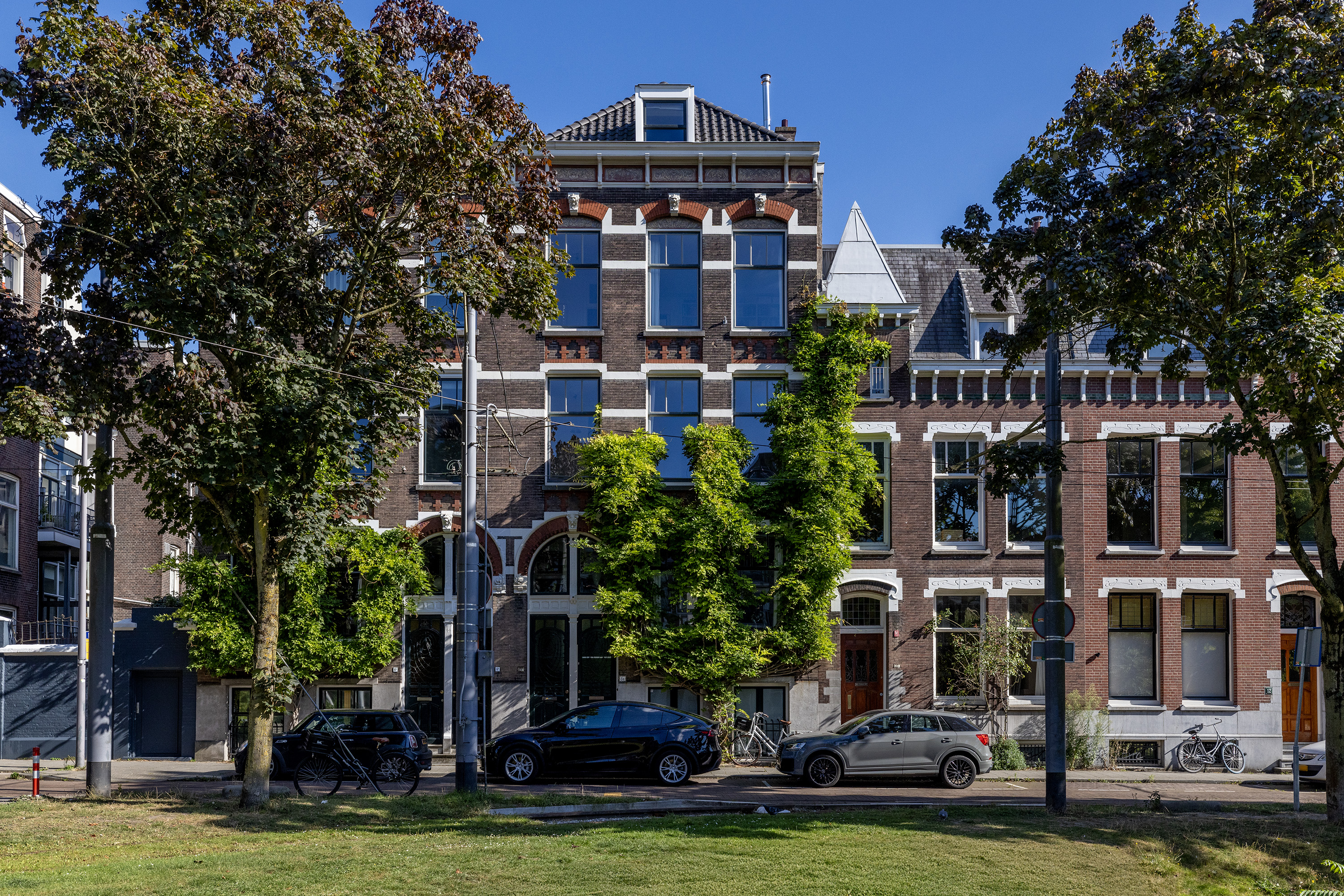 Derde woonlaag: Deze – eventueel apart te bewonen – bovenste verdieping is volledig voorzien van een royale en hoge living (nokhoogte >4m) met originele houten balken waarin een keuken met Quooker en Bullerjan-houtkachel, tweede badkamer met douche en toilet, slaapkamer met mooie extra hoge raampui met openslaande deuren naar dakterras op het zuidwesten. Er is tevens een vliering. Dakterras: op deze heerlijke plek kunt u de hele dag in de zon vertoeven met een breed grootstedelijk uitzicht. Het in 2021 geplaatste luxe zonnescherm geeft niet alleen bescherming tegen de zon, het geeft ook een knus en huiselijk gevoel waarbij wind en lichte regen kan worden tegen gehouden.