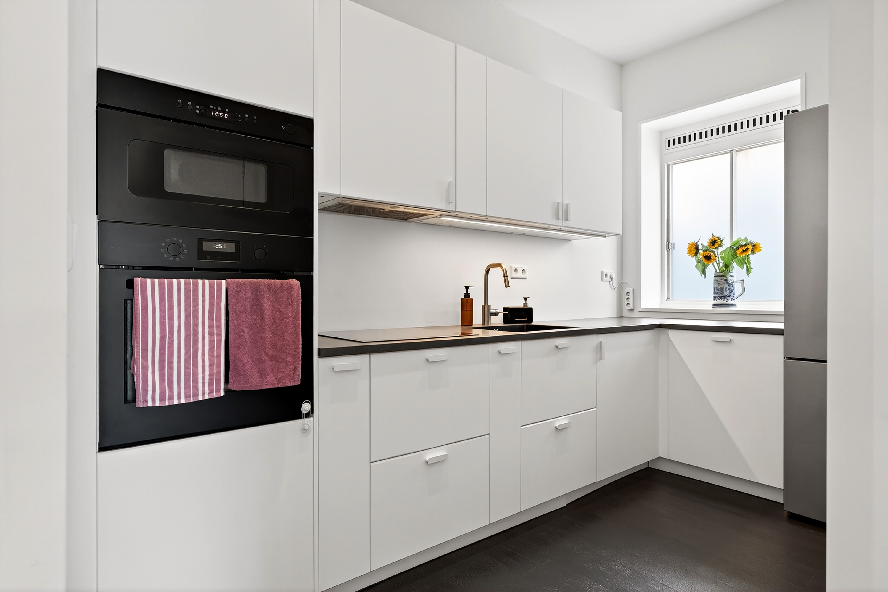 Moderne keuken uit 2022 met inbouwoven, magnetron, inductiekookplaat, koelkast en Bosch vaatwasser;