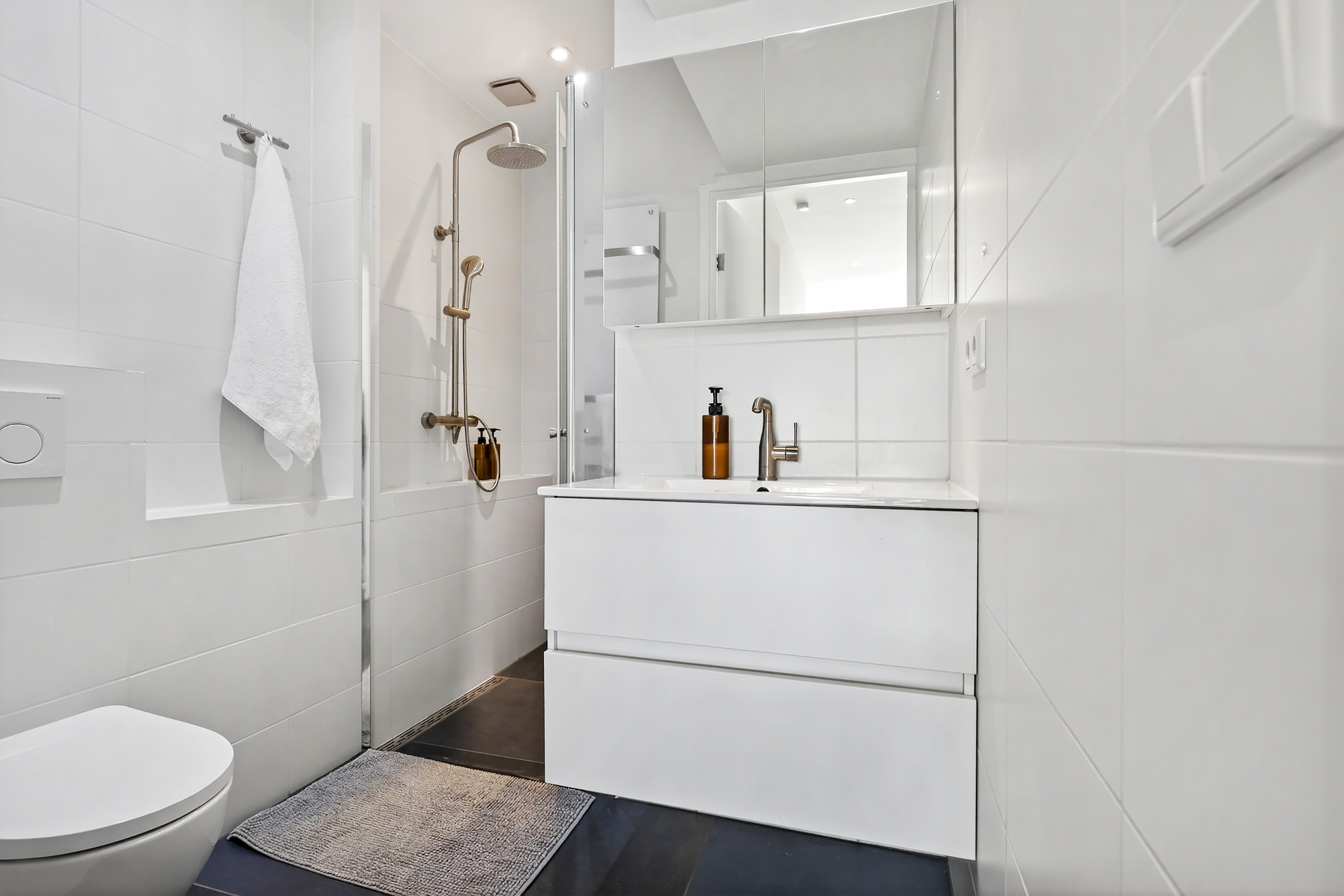 Moderne badkamer uit 2022 met douche, wastafel, toilet en infraroodverwarming.