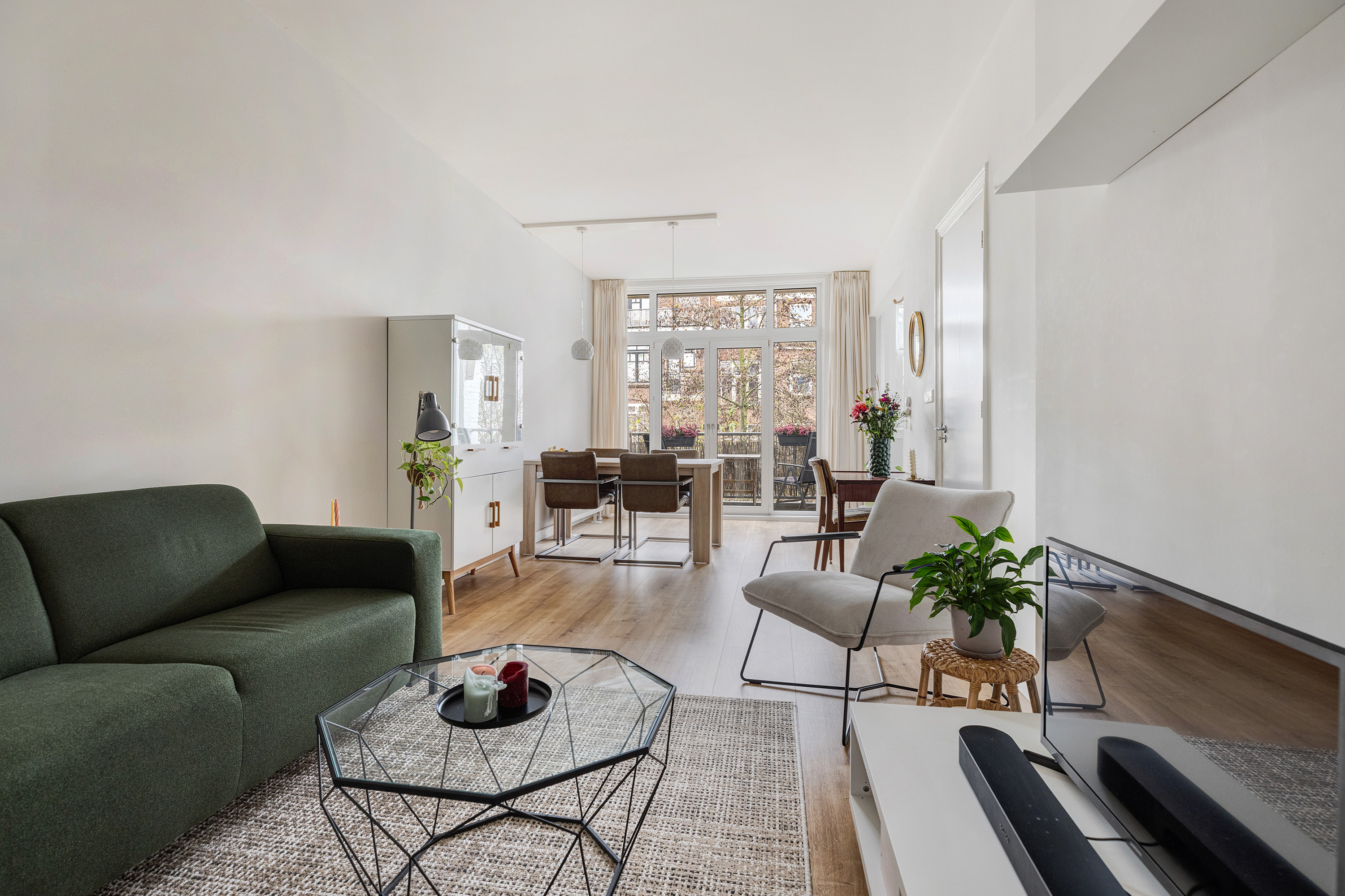 Sfeervolle woonkamer (ca. 7.90 x 3.18 m). Dankzij de grote ramen is er veel natuurlijk licht. De ruimte is verdeeld in een zit- en eetgedeelte.