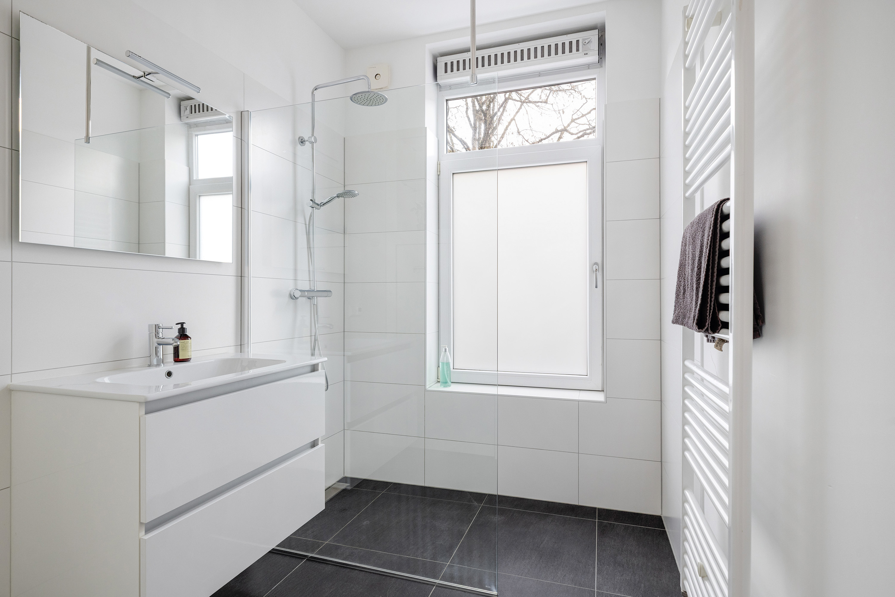 Nieuwe luxe badkamer (ca. 2.46 x 1.92 m) v.v. vloerverwarming, inloopdouche en wastafel;