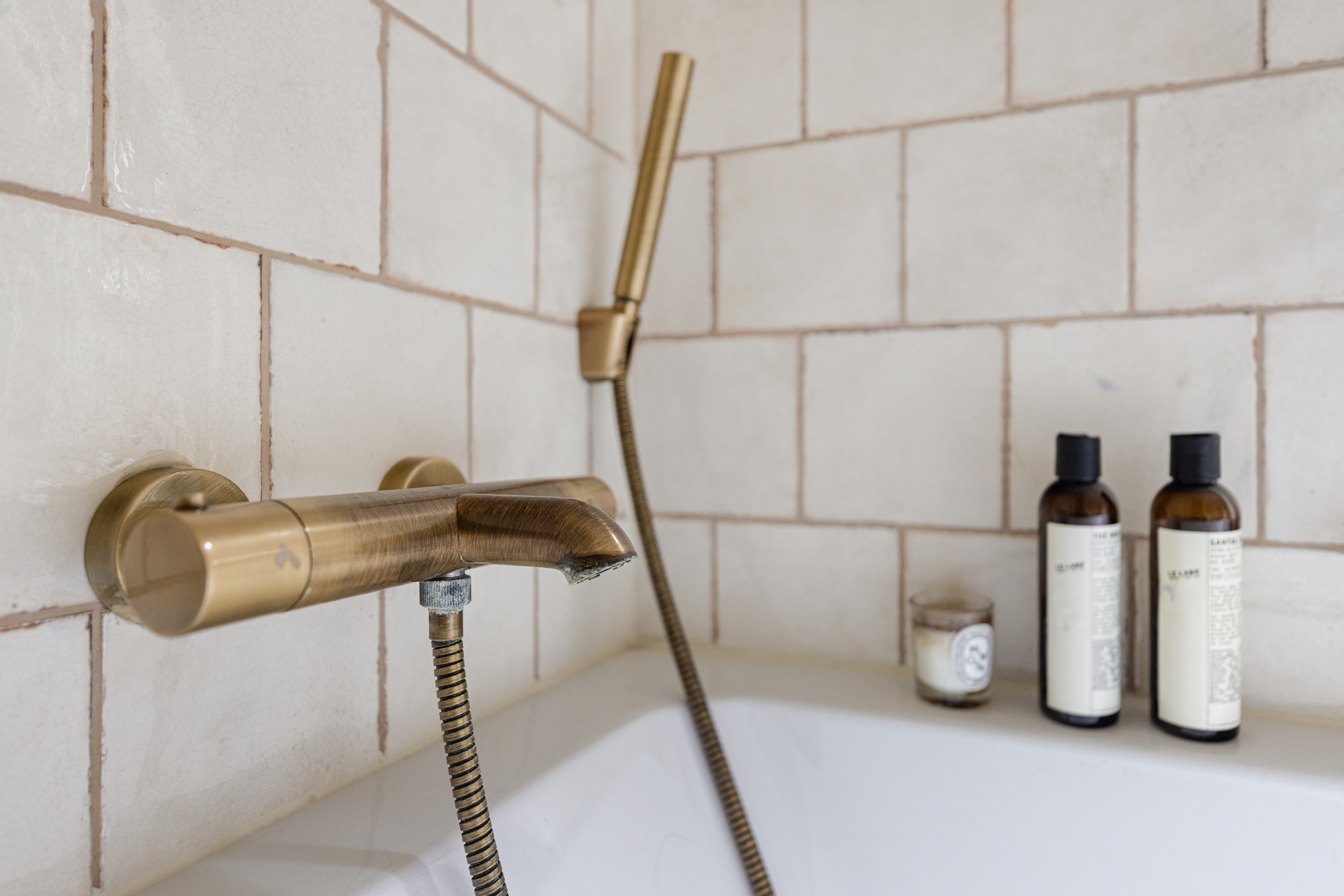 Moderne luxe badkamer (2019) voorzien van ligbad, douche, toilet en wastafel.