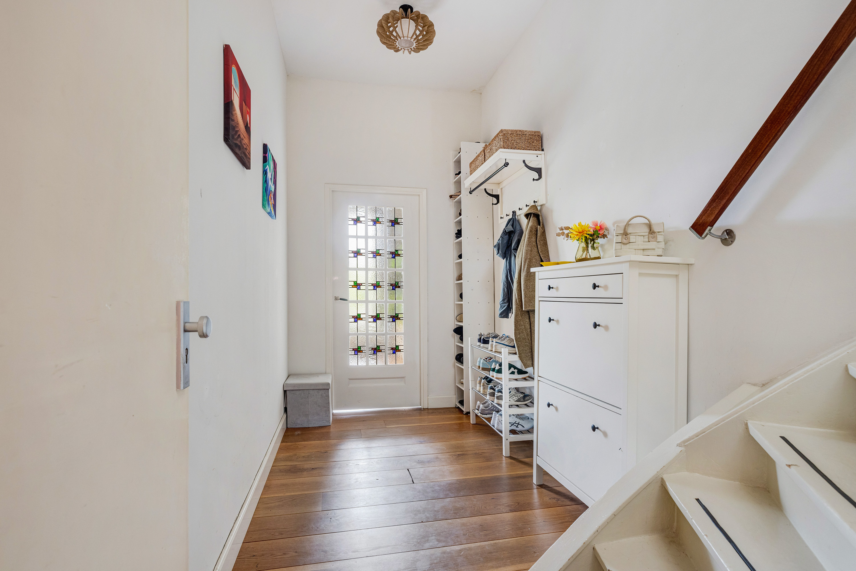 Ruime hal met trap naar de 3e verdieping en toegang via een authentieke glas-in-looddeur naar de woonkamer.