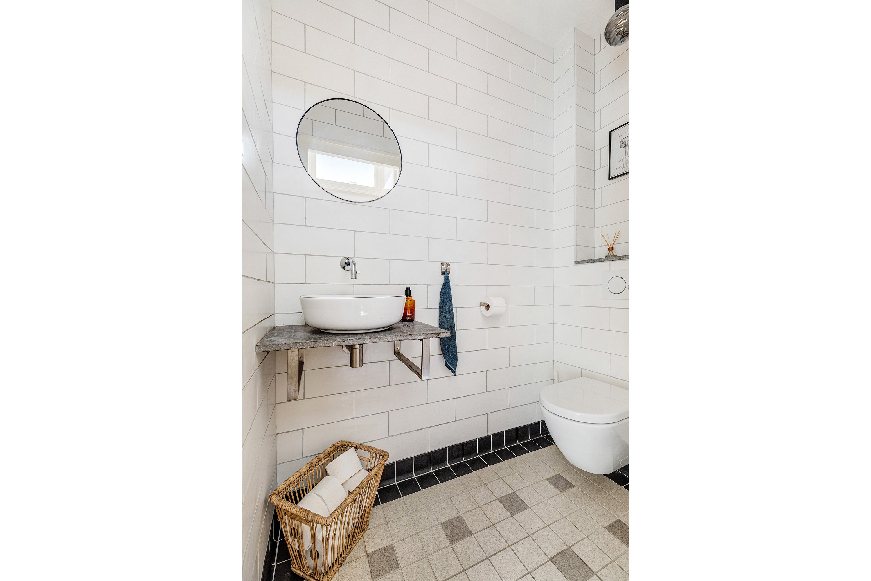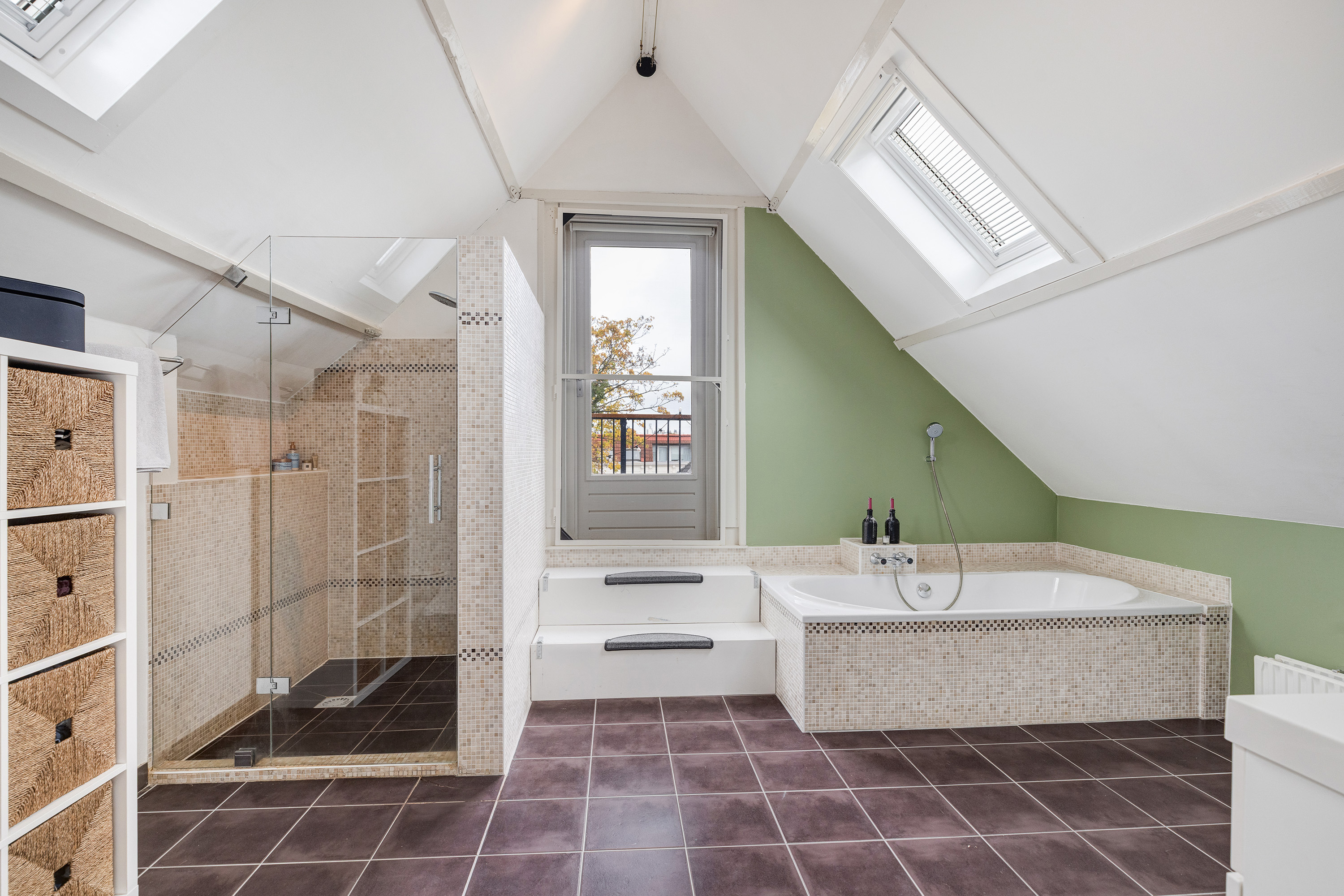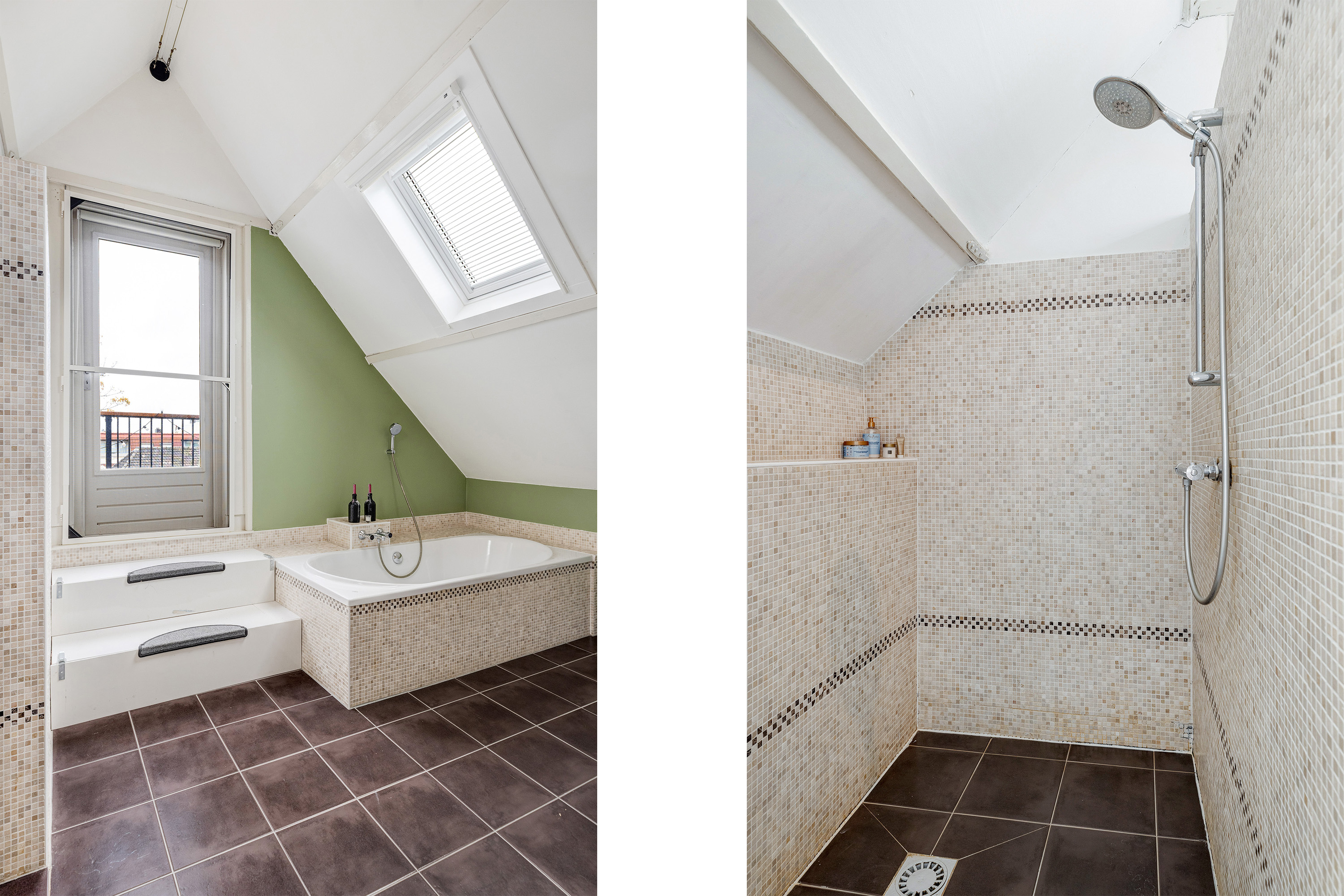 Aan de achterzijde ligt de ruime badkamer (ca. 20 m²) met inloopdouche, ligbad, wastafel en toegang tot de CV ruimte. Vanuit hier stap je zo het dakterras op, waar je geniet van een vrij uitzicht over de skyline van Rotterdam en het ochtendzonnetje. Een heerlijke plek om de dag te beginnen met een kop koffie of ontbijt.