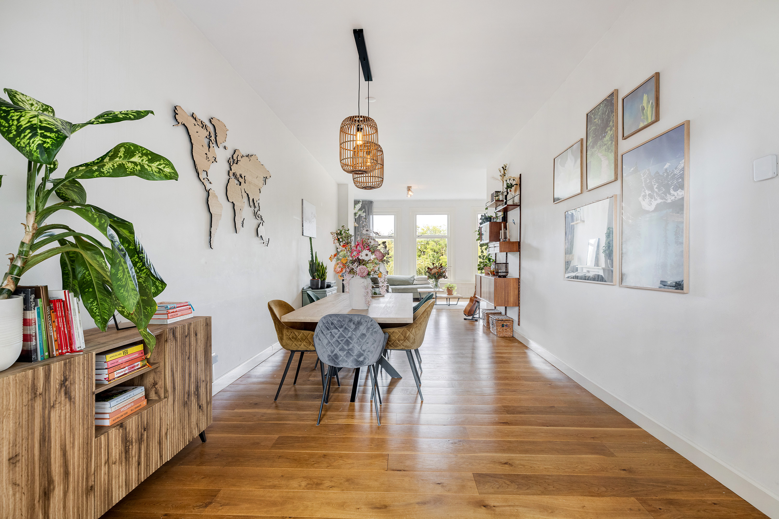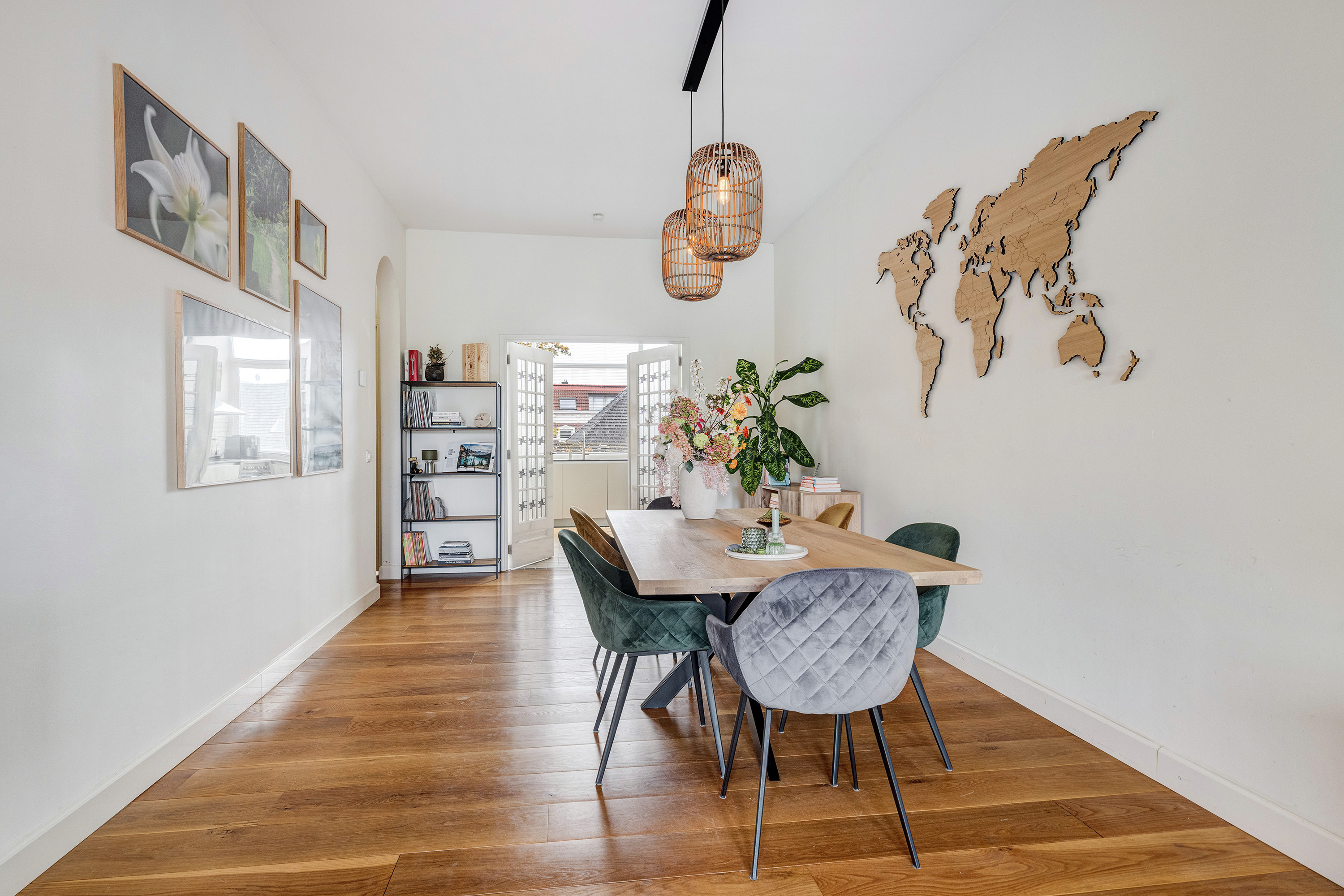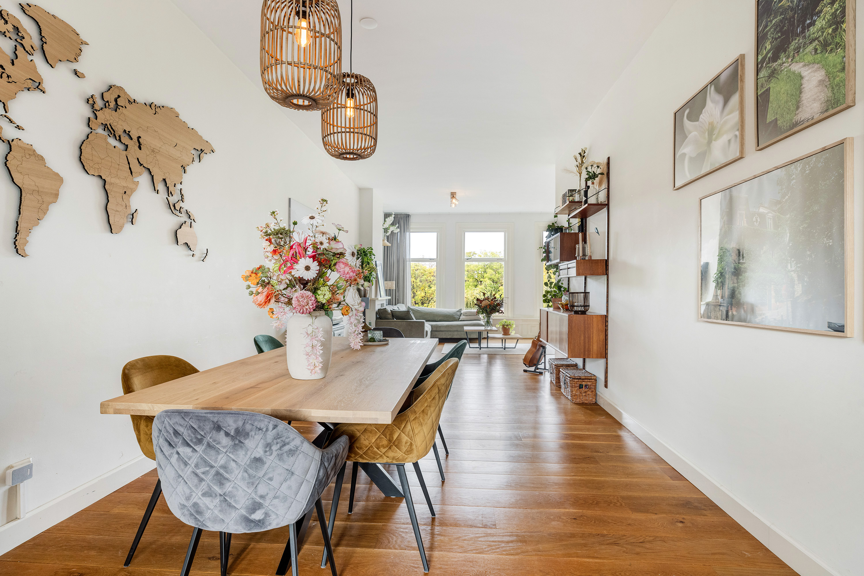 De sfeervolle woonkamer met zit- en eetgedeelte heeft een massief eikenhouten vloer en een open haard. De hoge ramen aan de voorzijde bieden een prachtig uitzicht over de groene, rustige singel. Dankzij de hoge plafonds en het vele daglicht voelt de ruimte heerlijk licht en ruim aan.