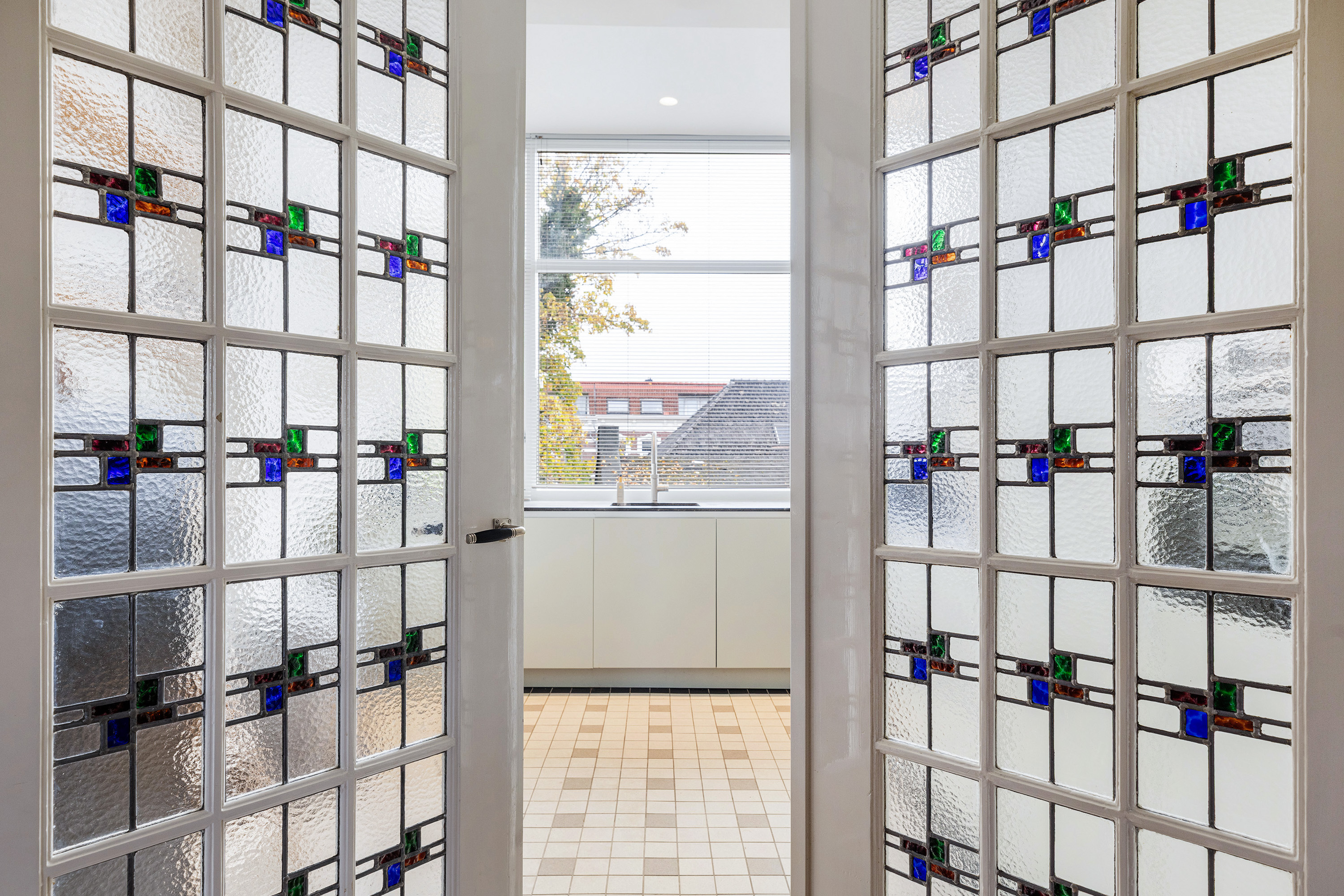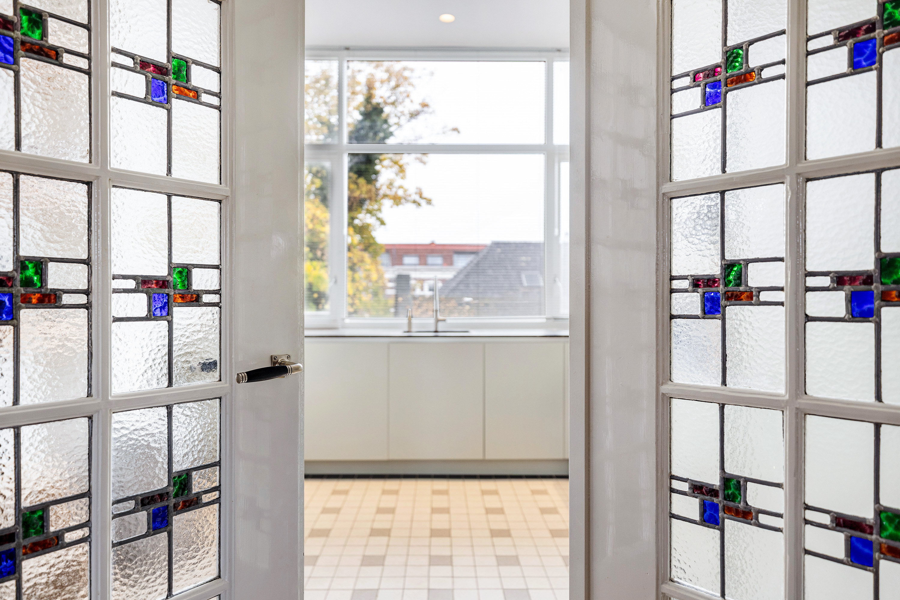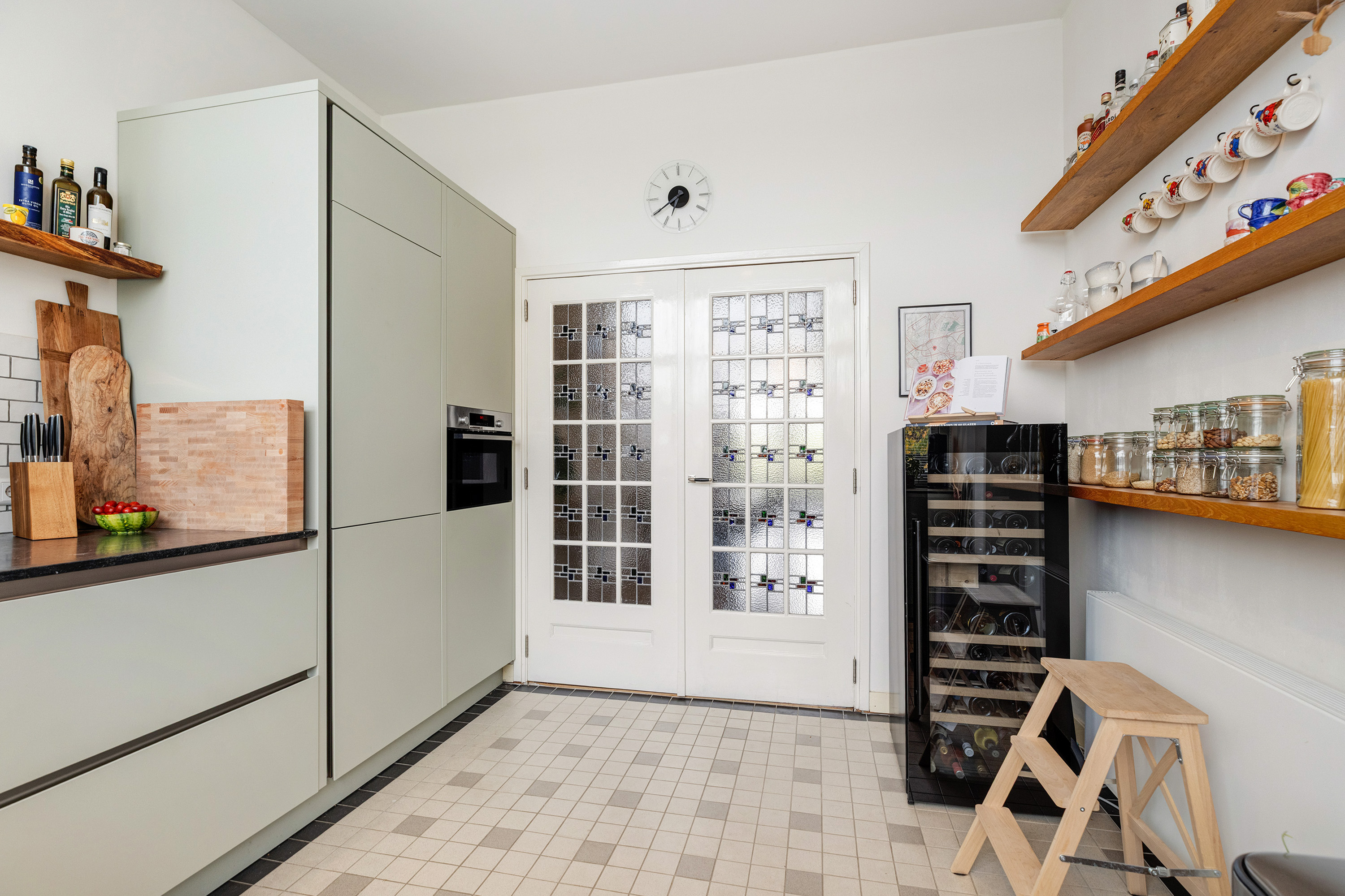 Via de openslaande glas-in-looddeuren bereik je de exclusieve, op maat gemaakte keuken (2021), ontworpen door een architect. Deze stijlvolle keuken combineert design en functionaliteit met verfijnde houten details, extra diepe lades en een klassieke vloer die perfect aansluit op de sfeer van de woning.