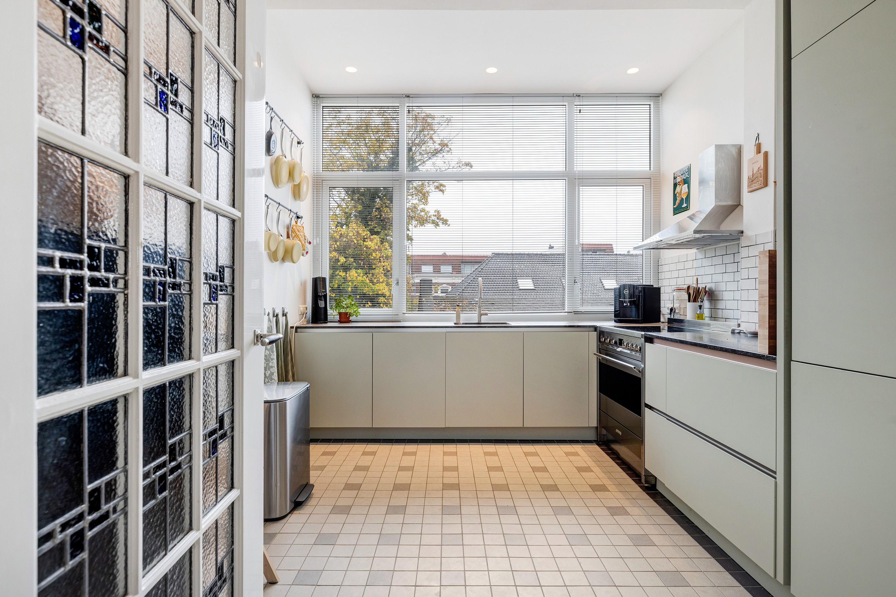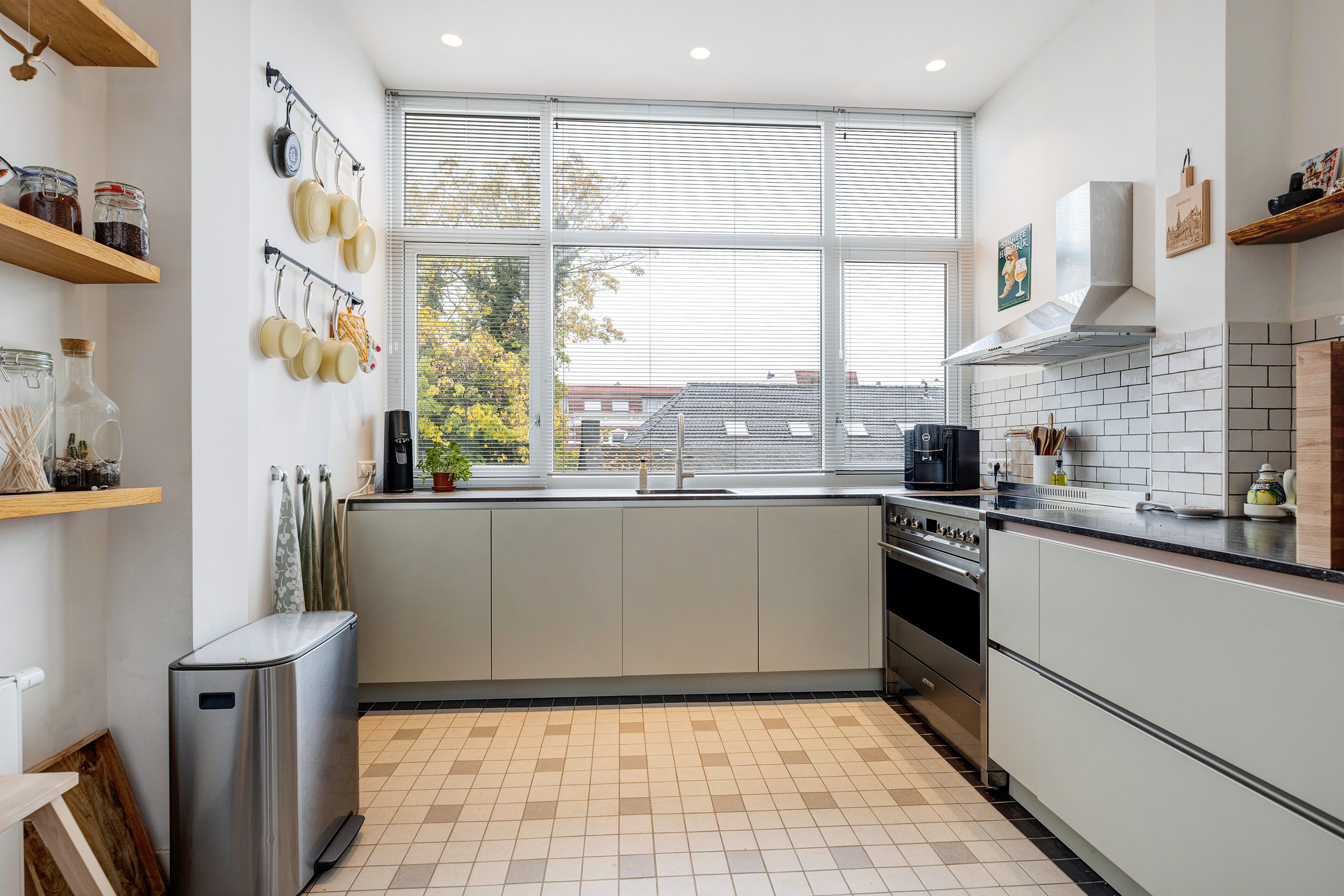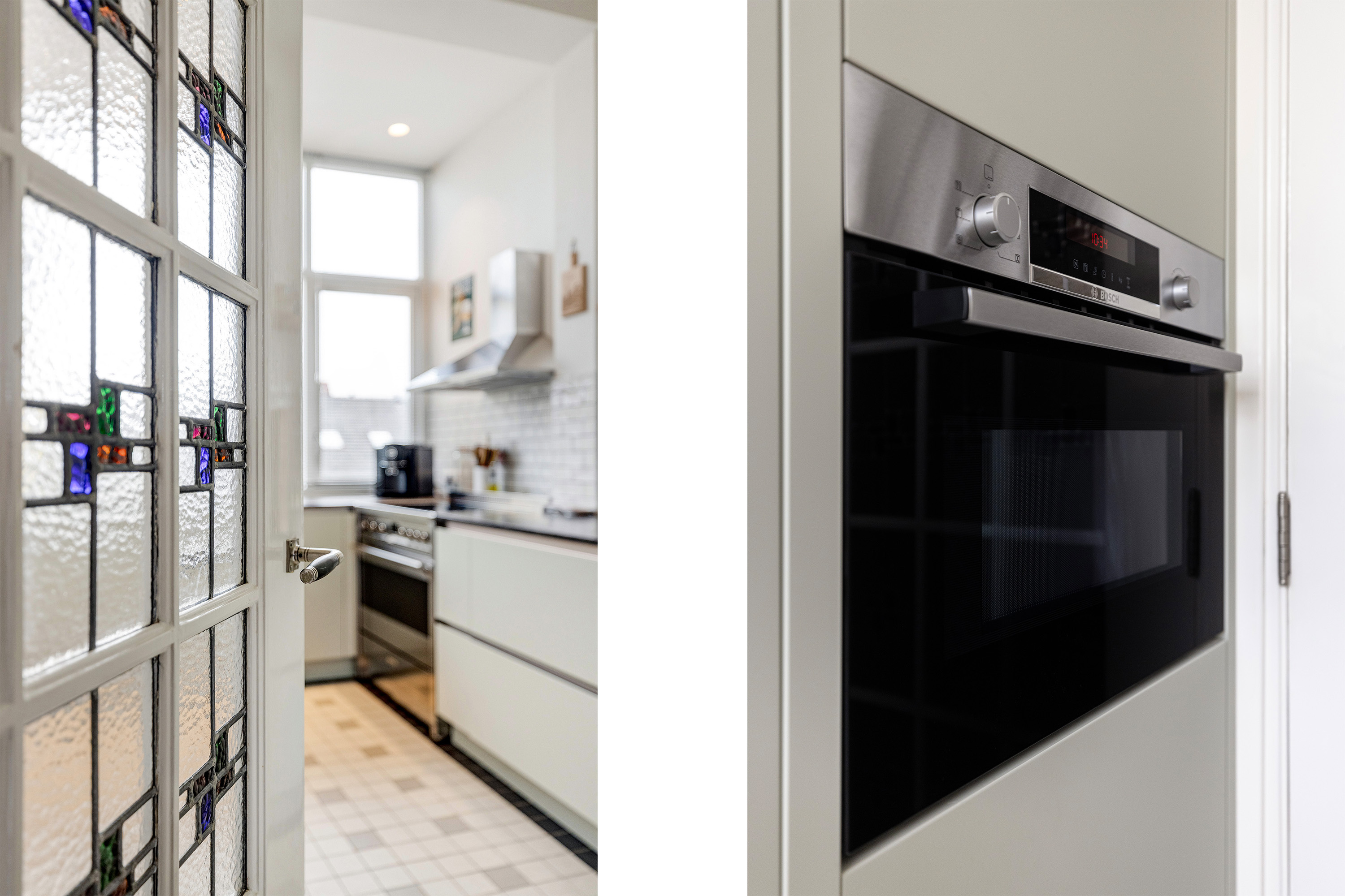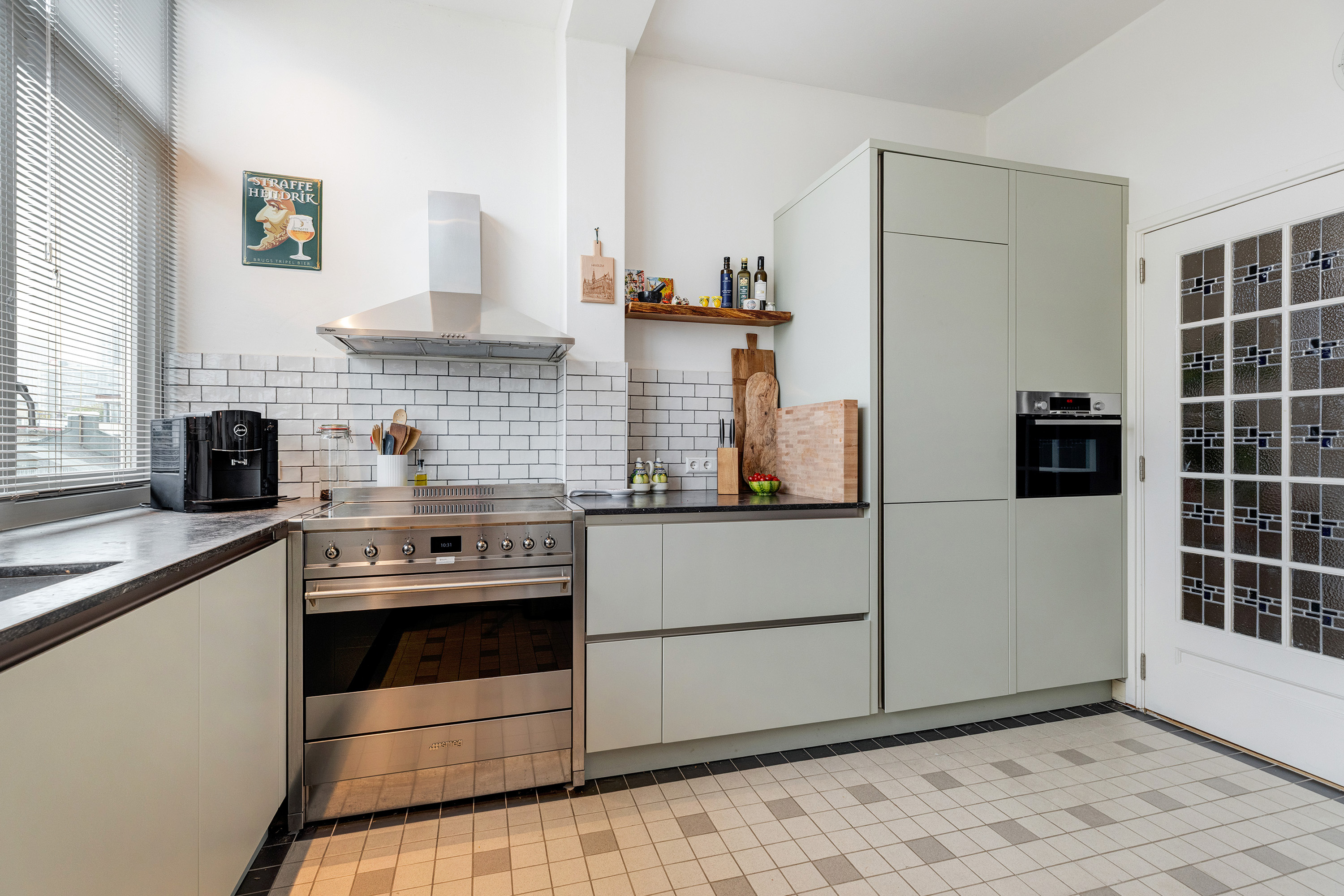 De keuken (3.98 x 3.39 m) is uitgerust met luxe inbouwapparatuur, waaronder een oven, inductiekookplaat, Quooker, vaatwasser, koelkast, vriezer en combi-oven. Ook de pui aan deze zijde is vernieuwd.