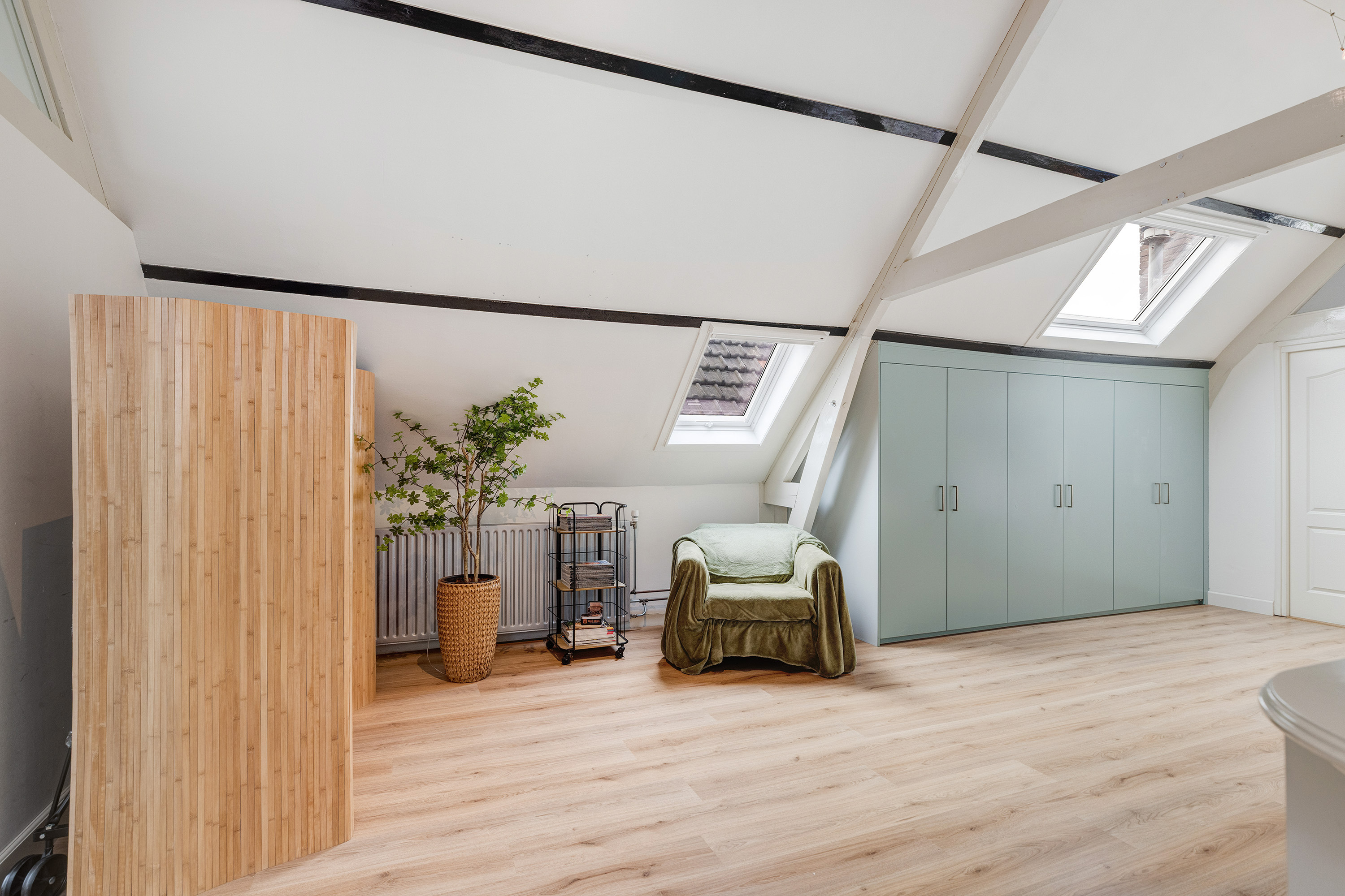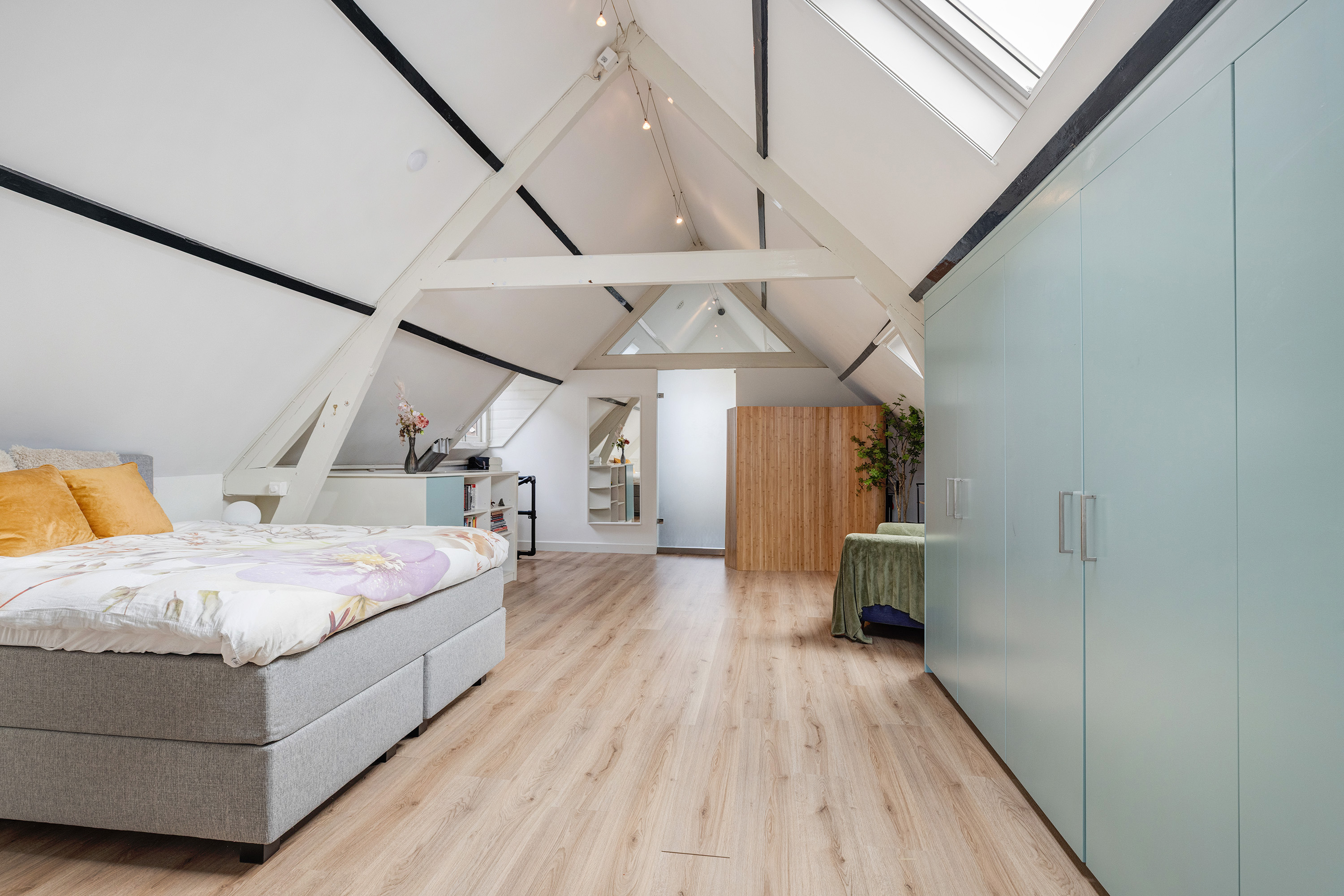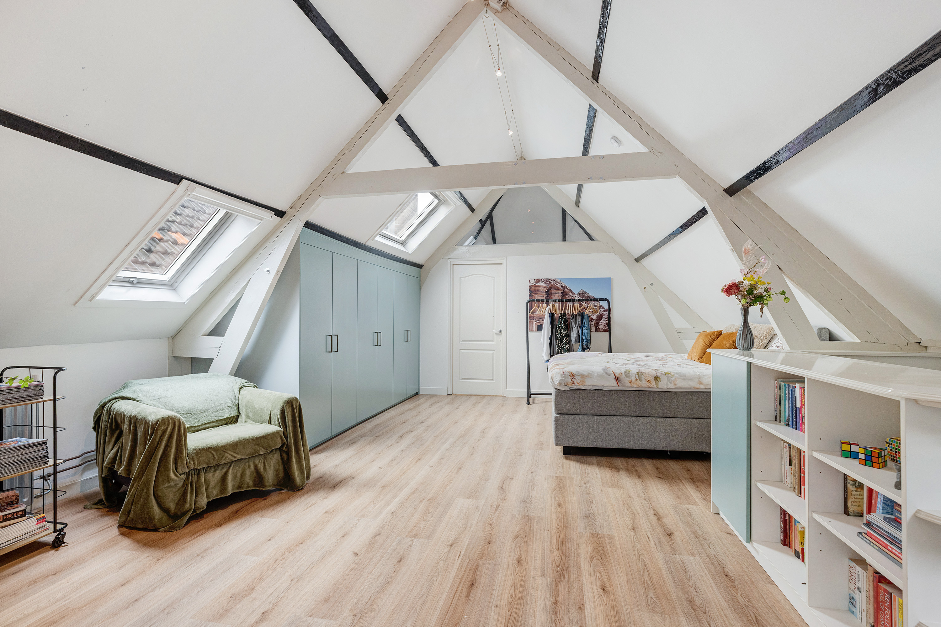 Via de trap op de tweede etage kom je op de sfeervolle slaapverdieping. Het schuine dak met houten balken en de grote dakramen geven de ruimte een warme, karaktervolle uitstraling en zorgen voor veel natuurlijk licht.