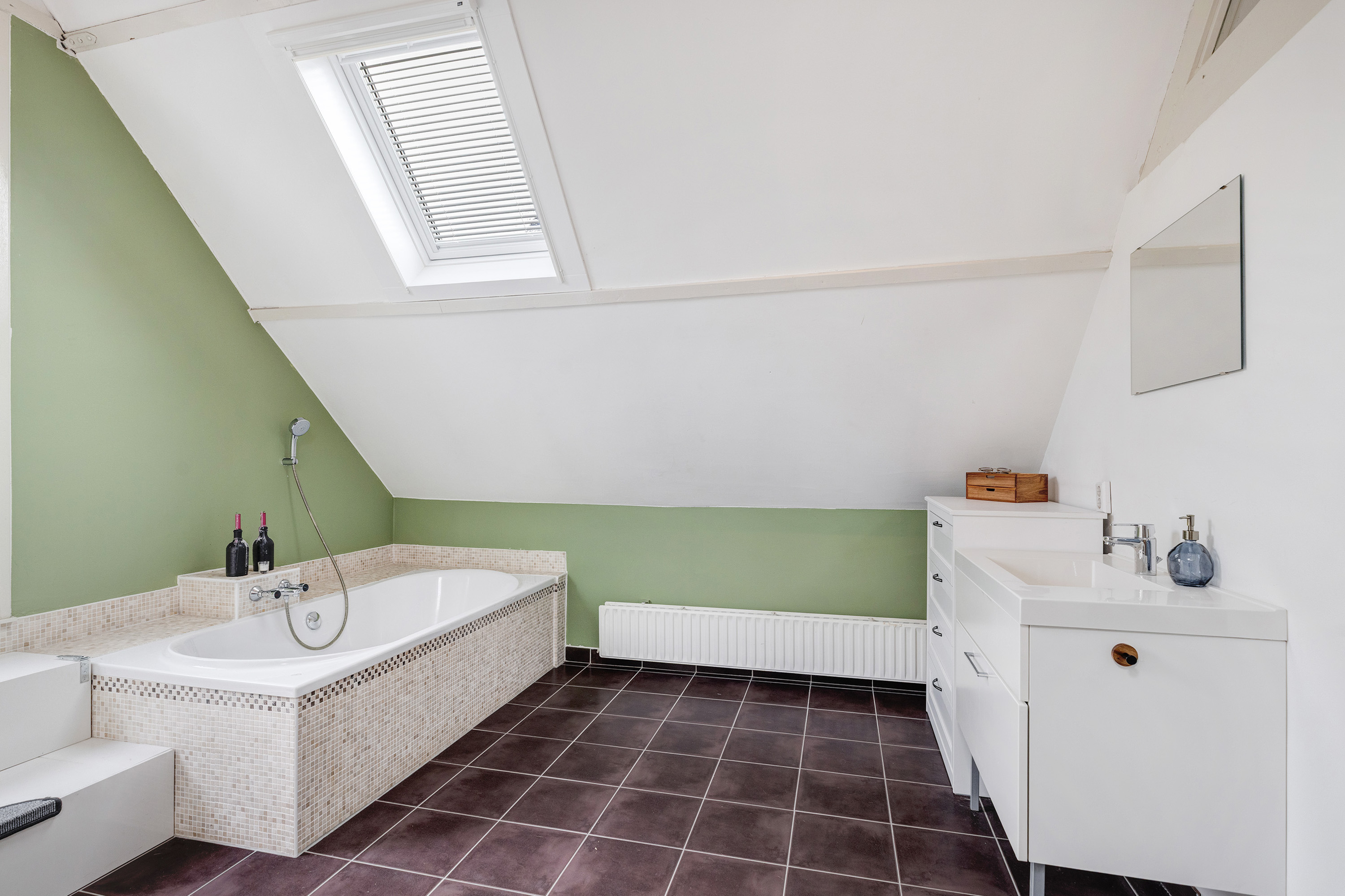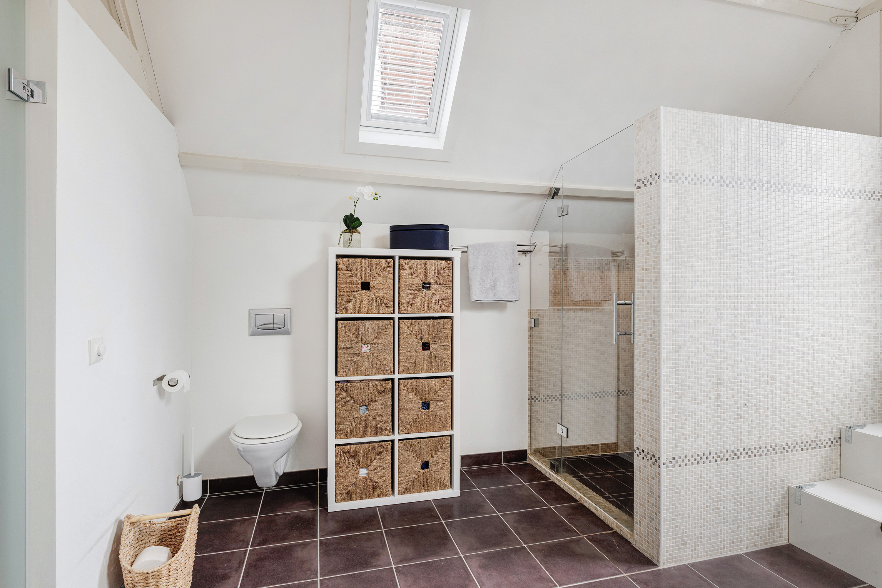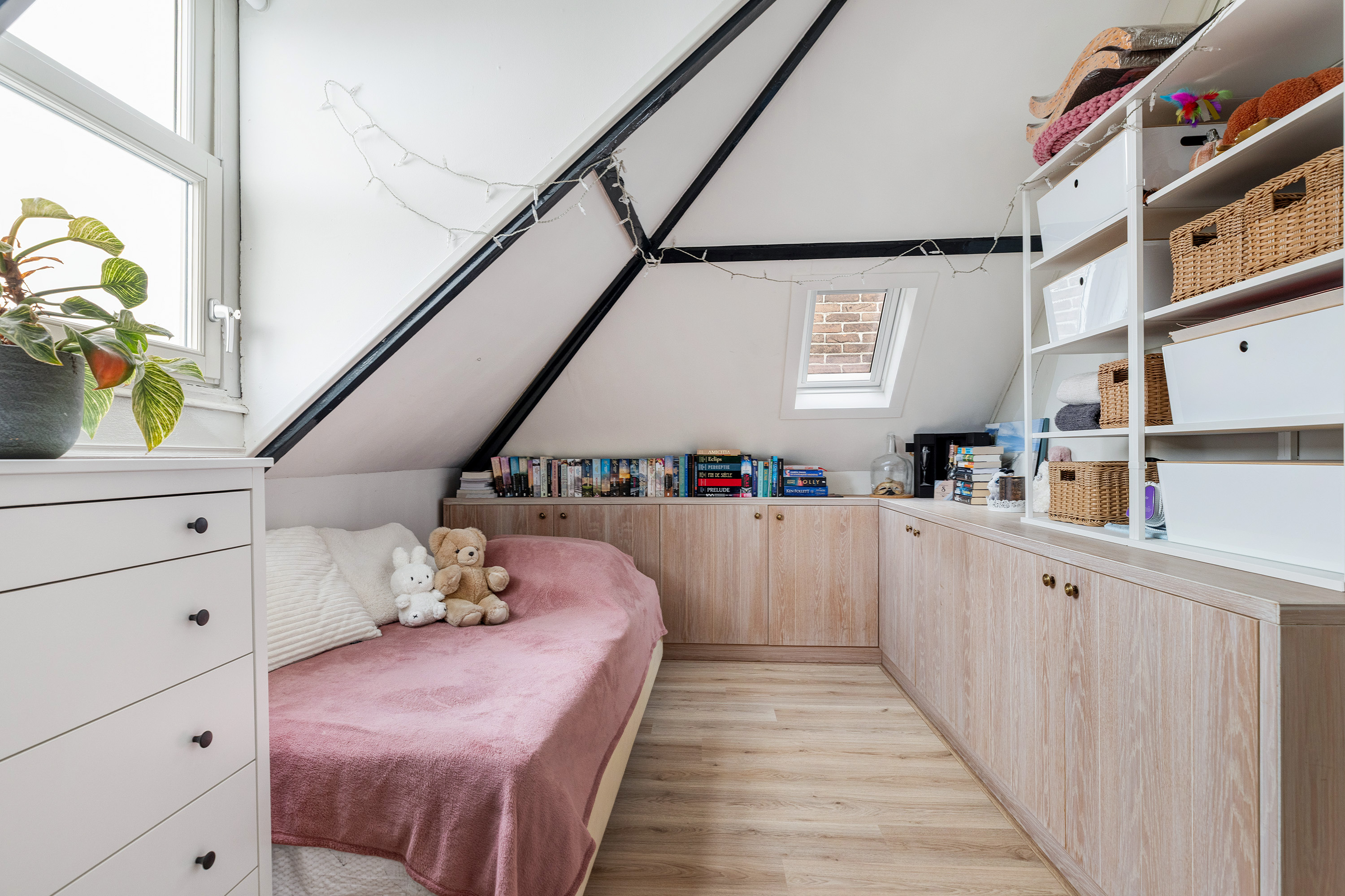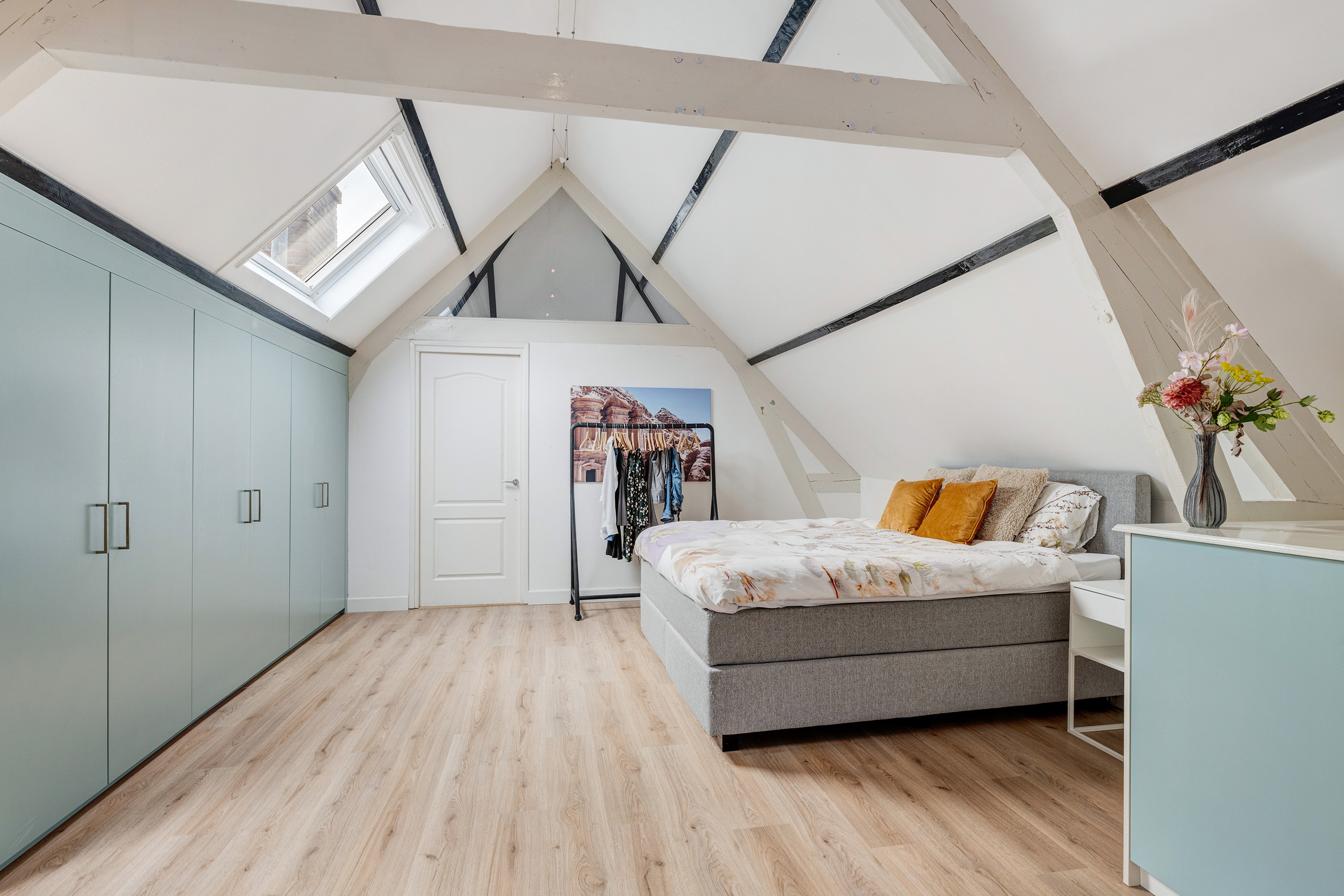 Via de trap op de tweede etage kom je op de sfeervolle slaapverdieping. Het schuine dak met houten balken en de grote dakramen geven de ruimte een warme, karaktervolle uitstraling en zorgen voor veel natuurlijk licht.