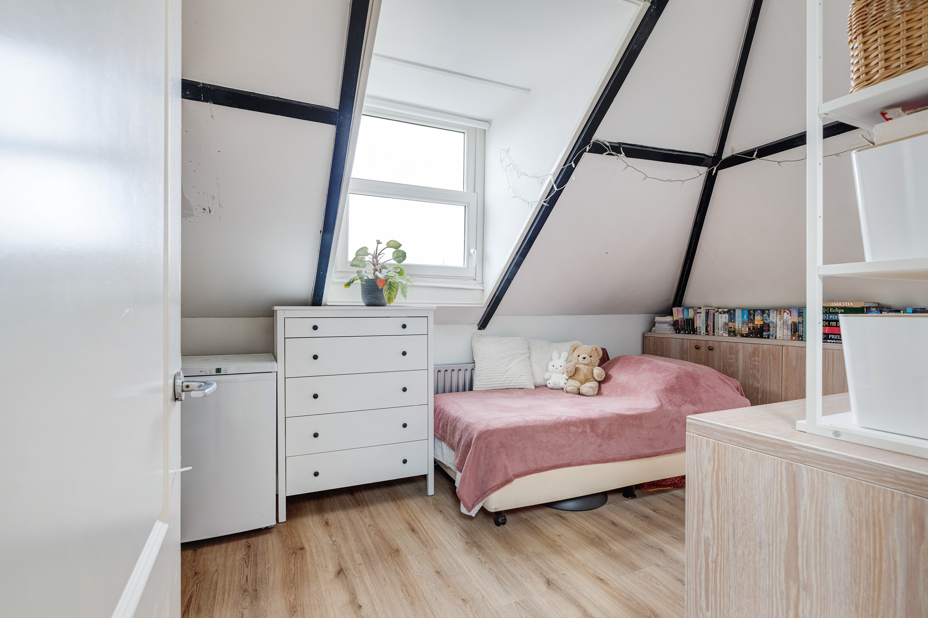 De verdieping is ingedeeld met een royale hoofdslaapkamer (ca. 35 m²) met op maat gemaakte inbouwkasten, en een tweede kamer (3.06 x 4.57 m) die perfect geschikt is als kinder- of werkkamer.