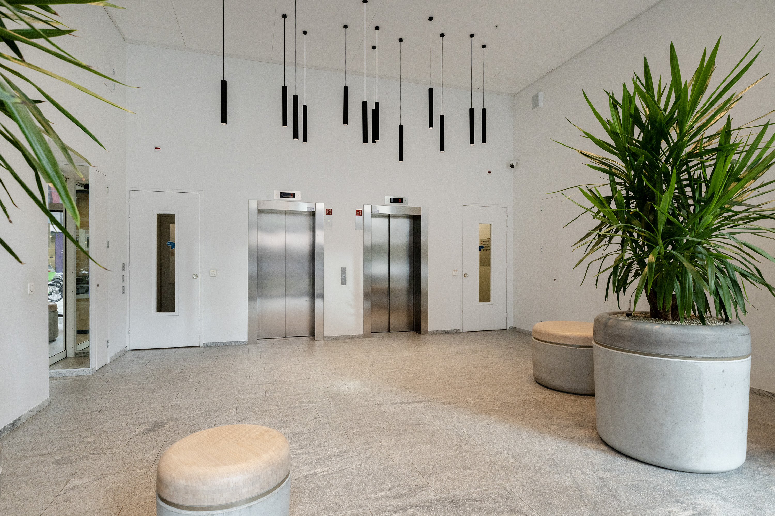Entree met bellentableau en afgesloten hal met toegang tot de liften.